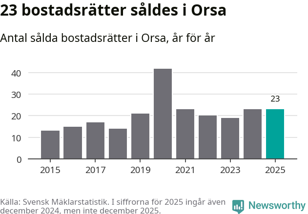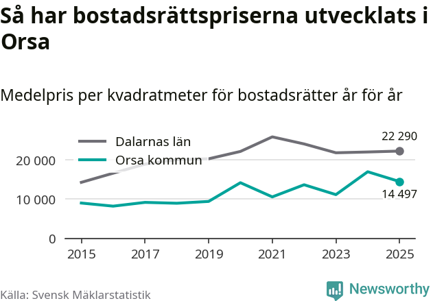 Det såldes totalt 23 bostadsrätter i Orsa kommun under året. Genomsnittspriset per kvadratmeter landade på 14 497 kronor. Det är en minskning med 15 procent i kommunen på ett år.