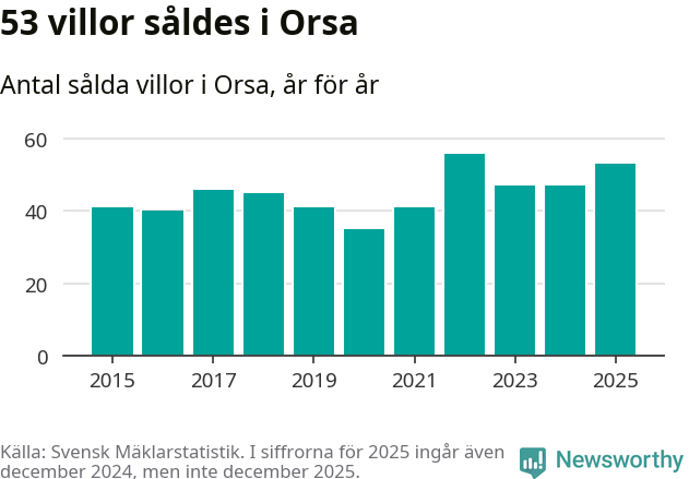 Däremot ökade antalet sålda villor. Totalt såldes 53 villor, att jämföra med 47 under 2024.