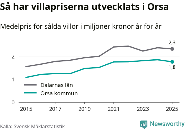 1,8 miljoner kronor är medelpriset för de villor som såldes i Orsa kommun under året, eller 15 189 kronor per kvadratmeter. Det innebär en prisminskning med fem procent på ett år.