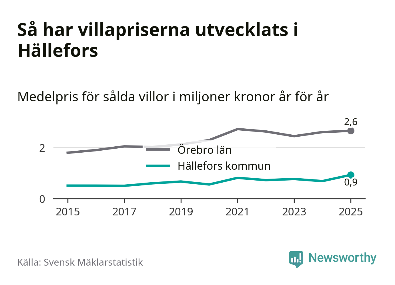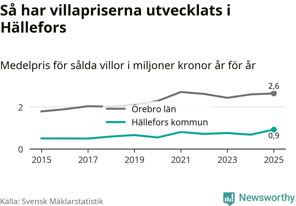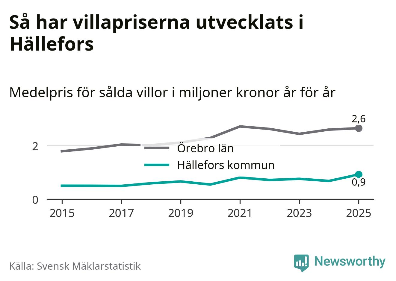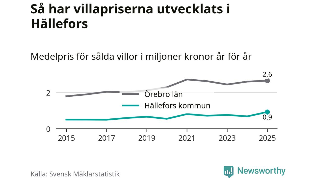 922 000 kronor är medelpriset för de villor som såldes i Hällefors kommun under året, eller 8 938 kronor per kvadratmeter. Det innebär en prisökning med 35 procent på ett år. Det är det högsta årssnittet på åtminstone tio år.
