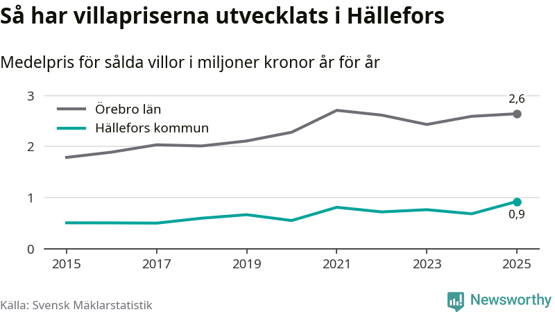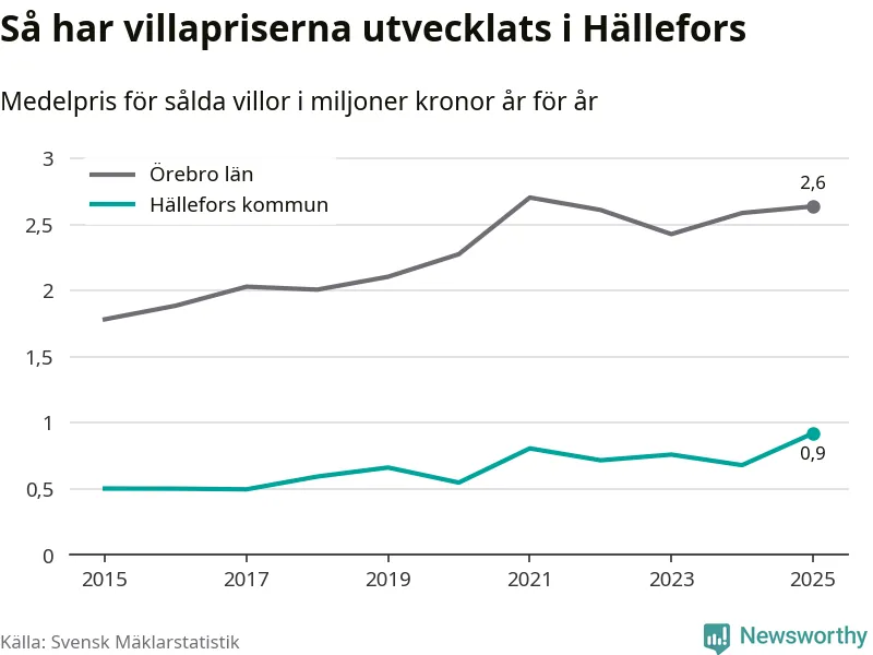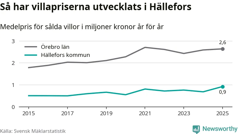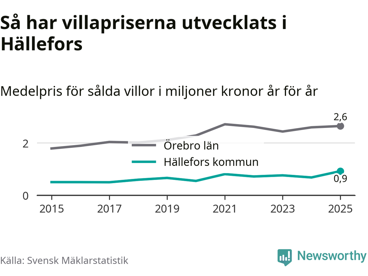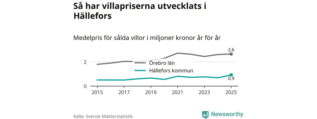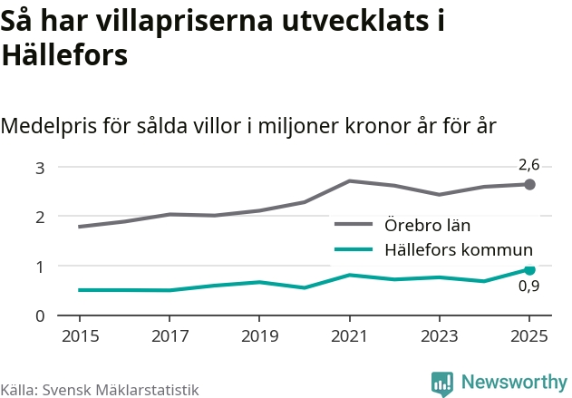 922 000 kronor är medelpriset för de villor som såldes i Hällefors kommun under året, eller 8 938 kronor per kvadratmeter. Det innebär en prisökning med 35 procent på ett år. Det är det högsta årssnittet på åtminstone tio år.