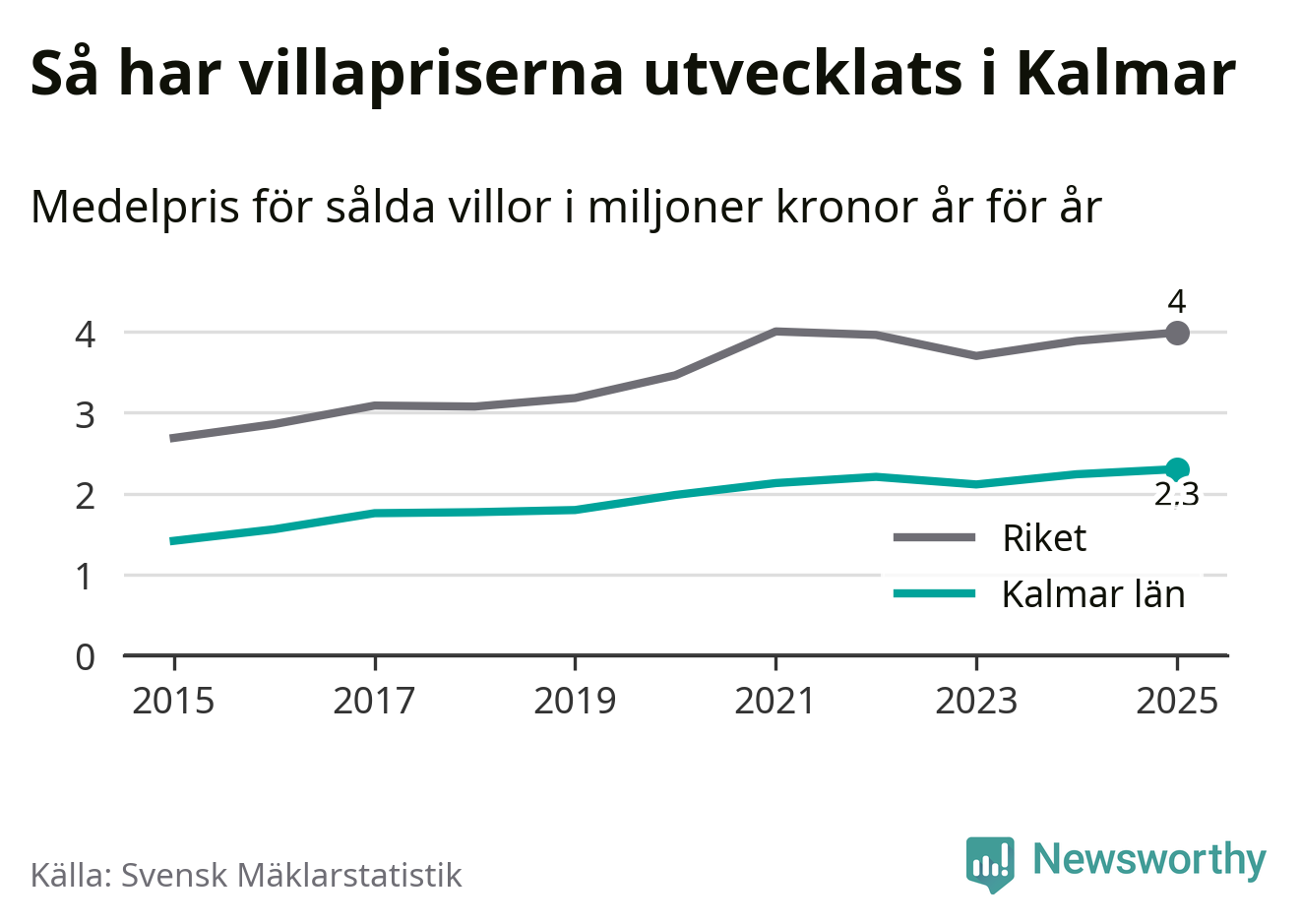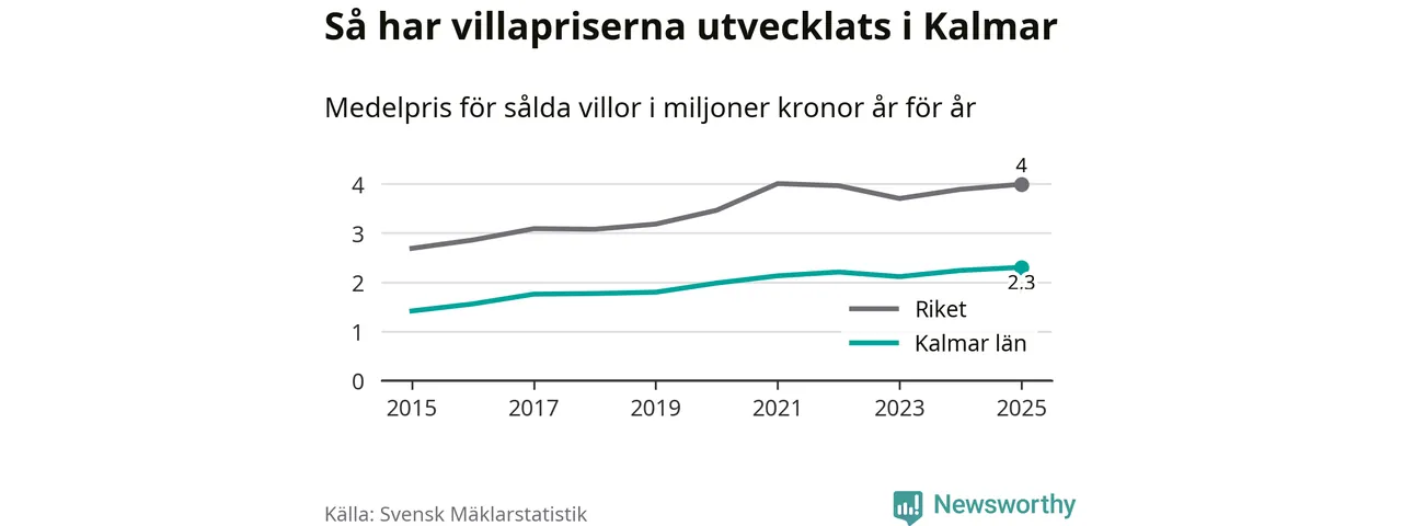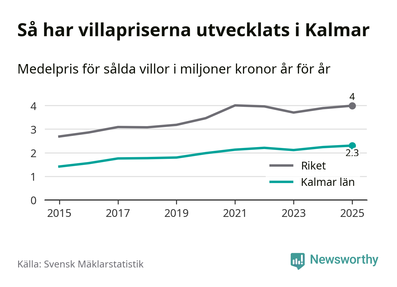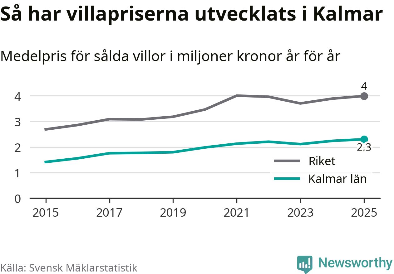 2,3 miljoner kronor är medelpriset för de villor som såldes i Kalmar län under året, eller 18 964 kronor per kvadratmeter. Det innebär en prisökning med tre procent på ett år. Det är det högsta årssnittet på åtminstone tio år.