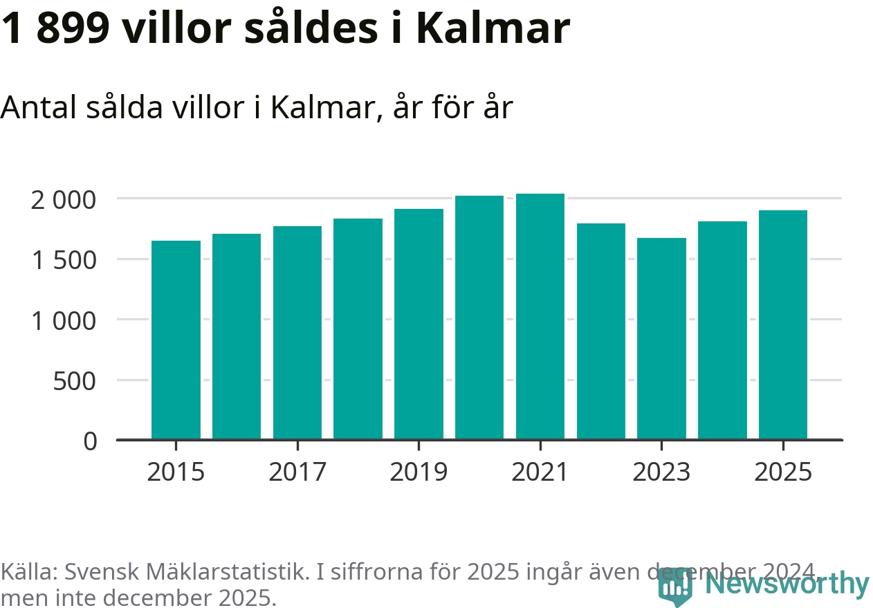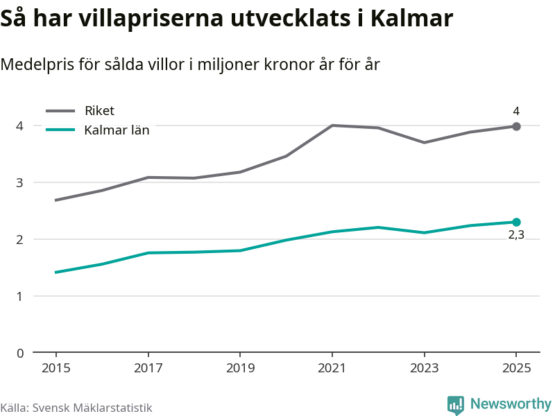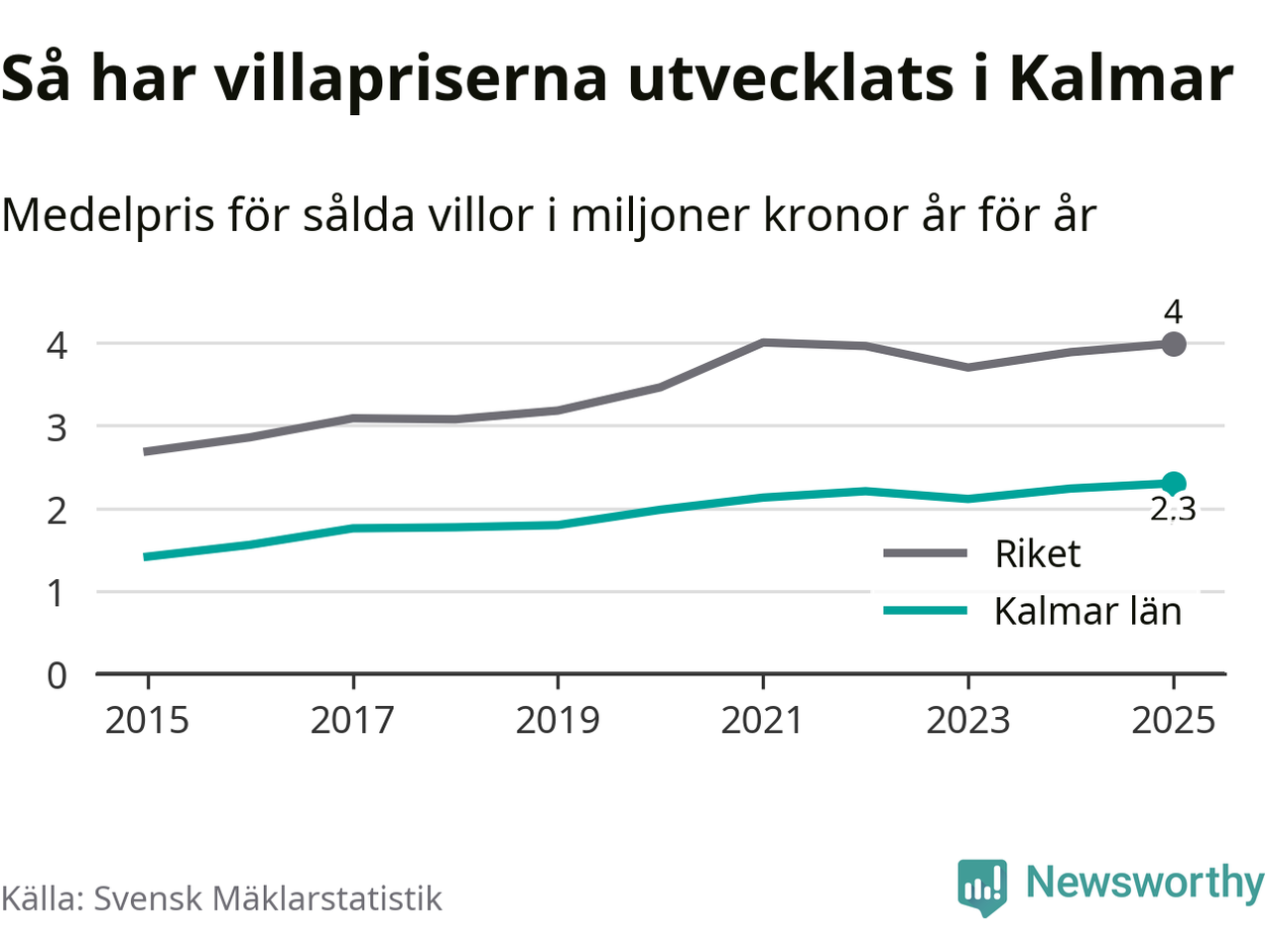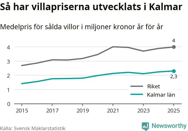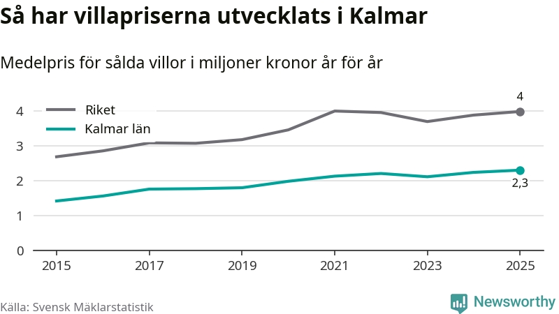 2,3 miljoner kronor är medelpriset för de villor som såldes i Kalmar län under året, eller 18 964 kronor per kvadratmeter. Det innebär en prisökning med tre procent på ett år. Det är det högsta årssnittet på åtminstone tio år.