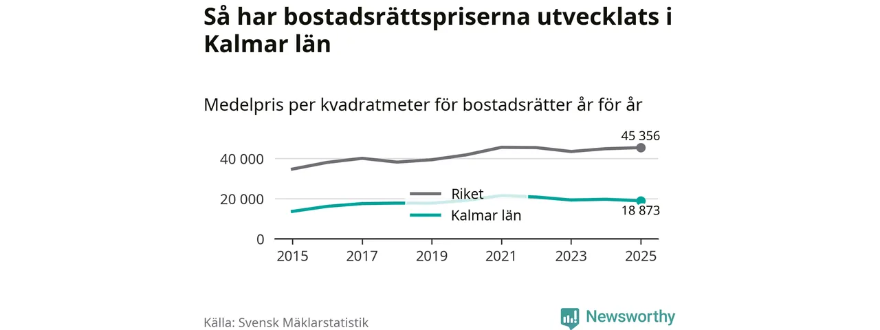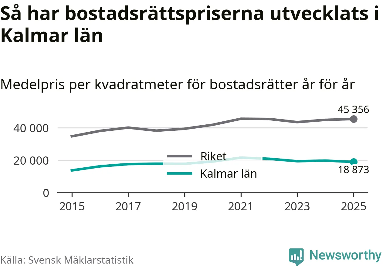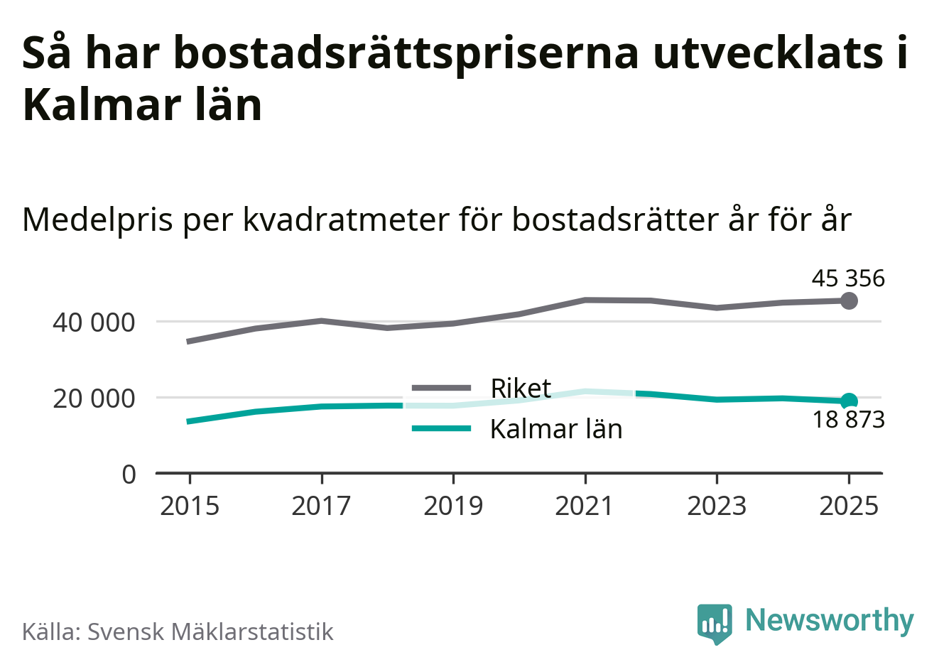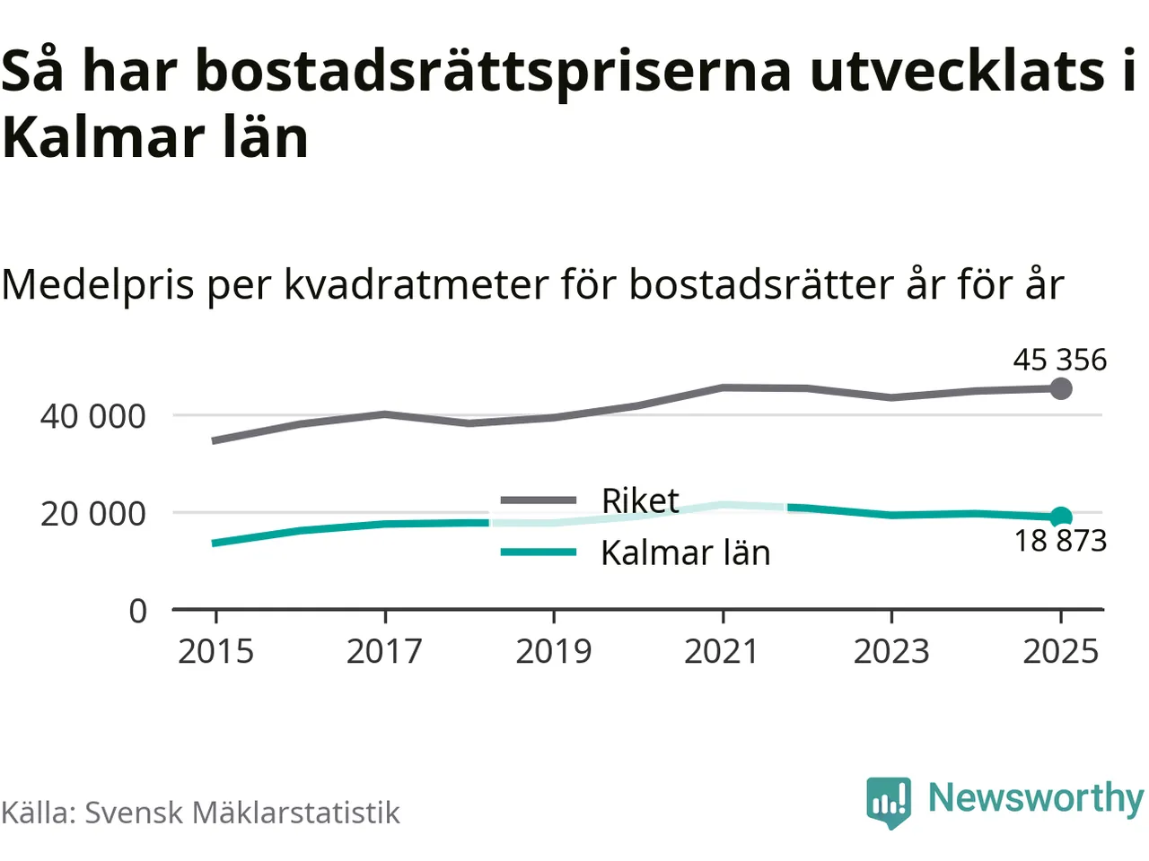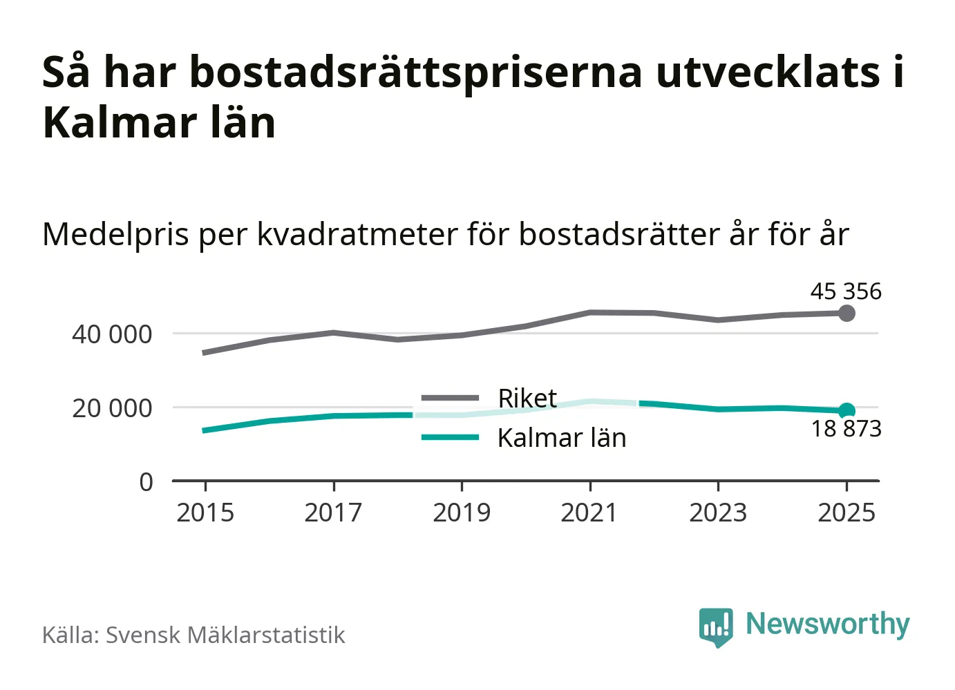 Det såldes totalt 1 351 bostadsrätter i Kalmar län under året. Genomsnittspriset per kvadratmeter landade på 18 873 kronor. Det är en minskning med fyra procent i länet på ett år.