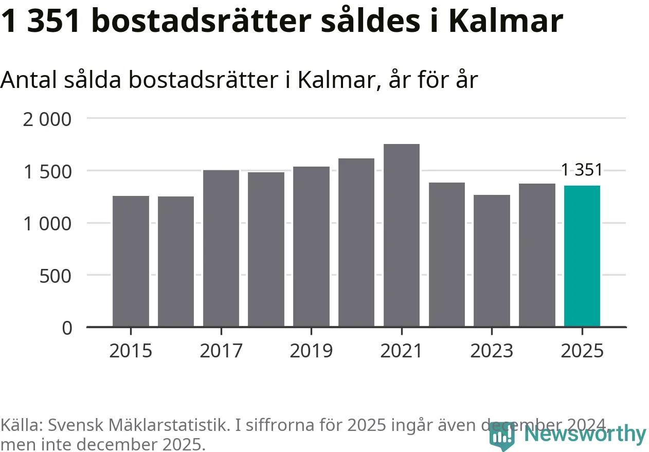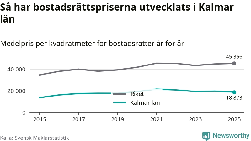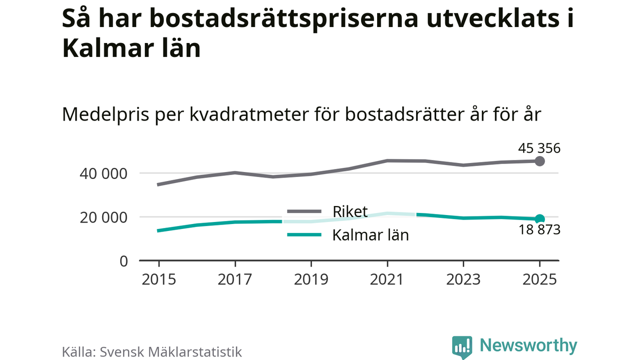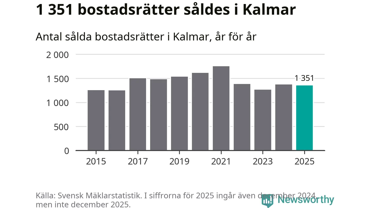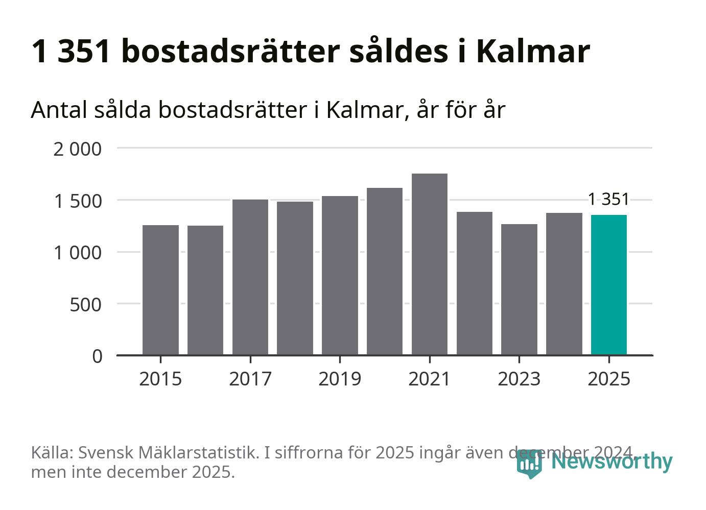 Det såldes totalt 1 351 bostadsrätter i Kalmar län under året. Genomsnittspriset per kvadratmeter landade på 18 873 kronor. Det är en minskning med fyra procent i länet på ett år.