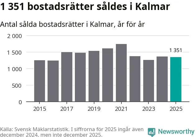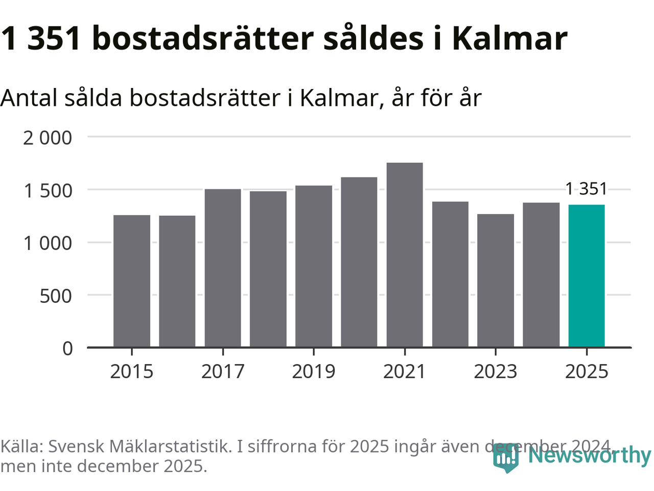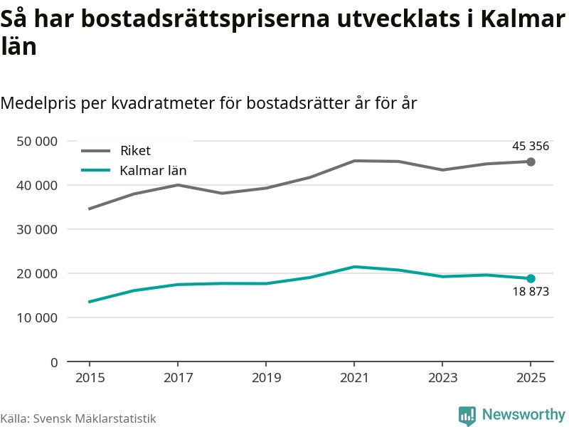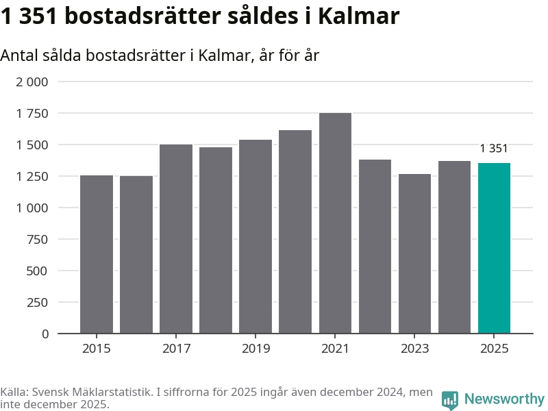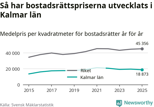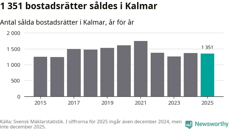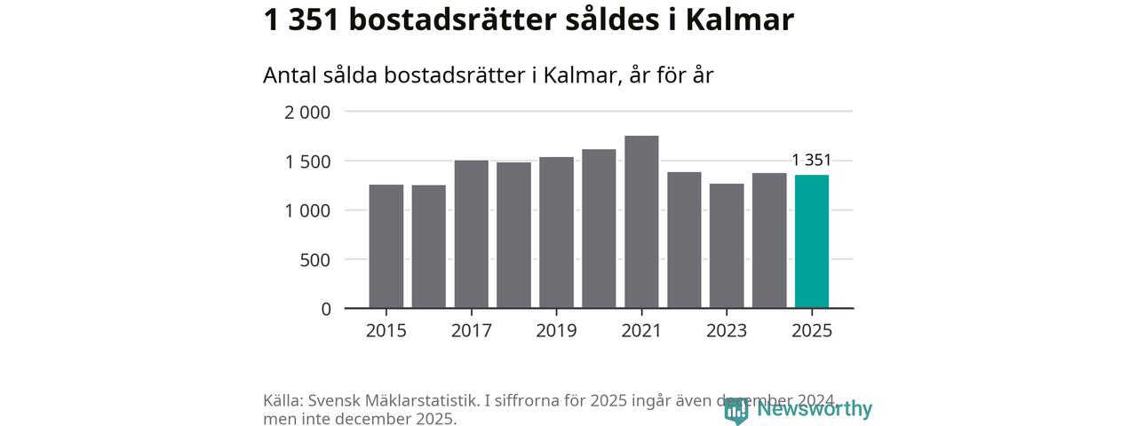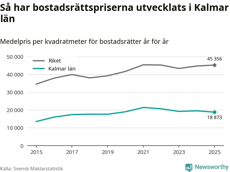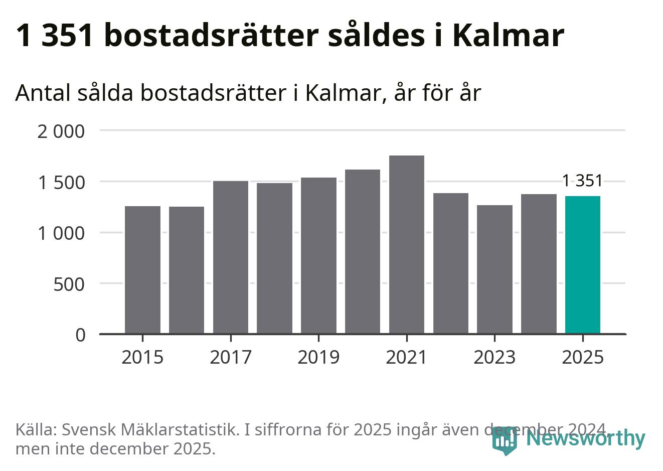 Det såldes totalt 1 351 bostadsrätter i Kalmar län under året. Genomsnittspriset per kvadratmeter landade på 18 873 kronor. Det är en minskning med fyra procent i länet på ett år.