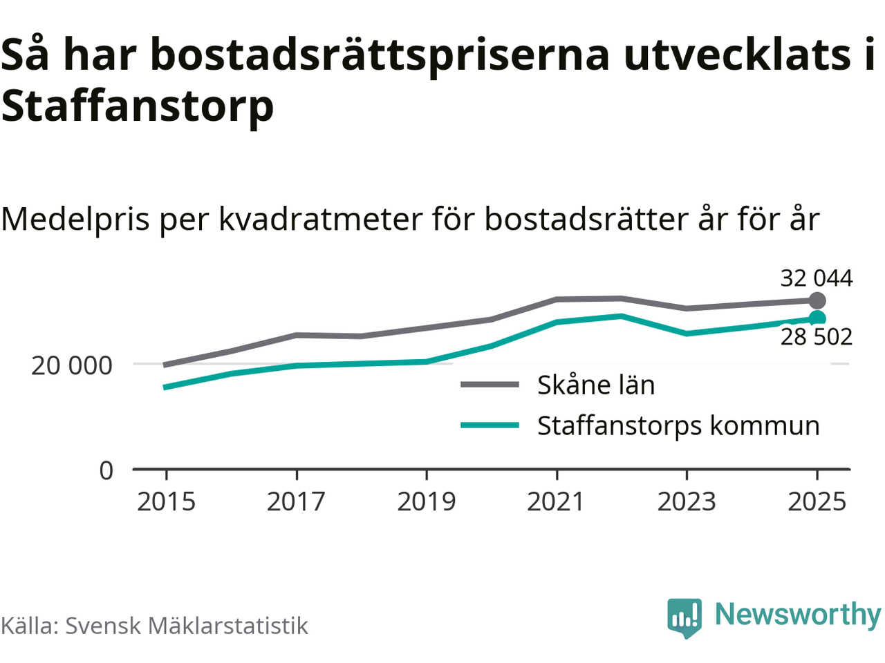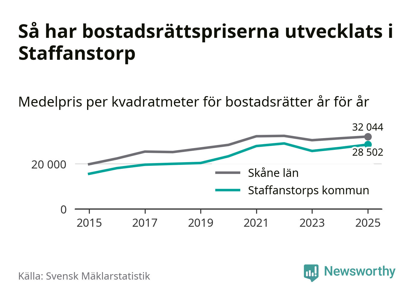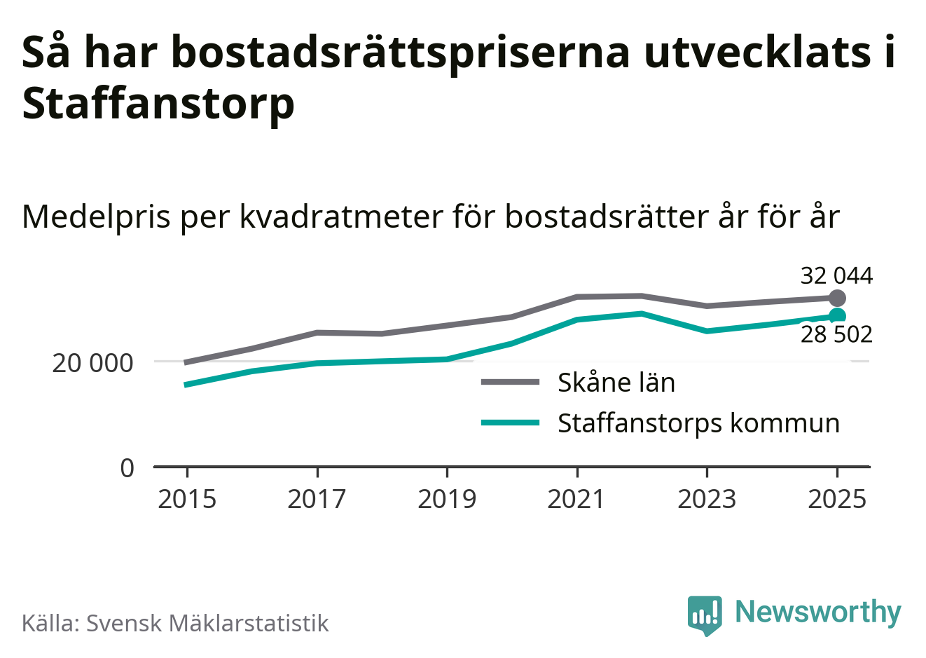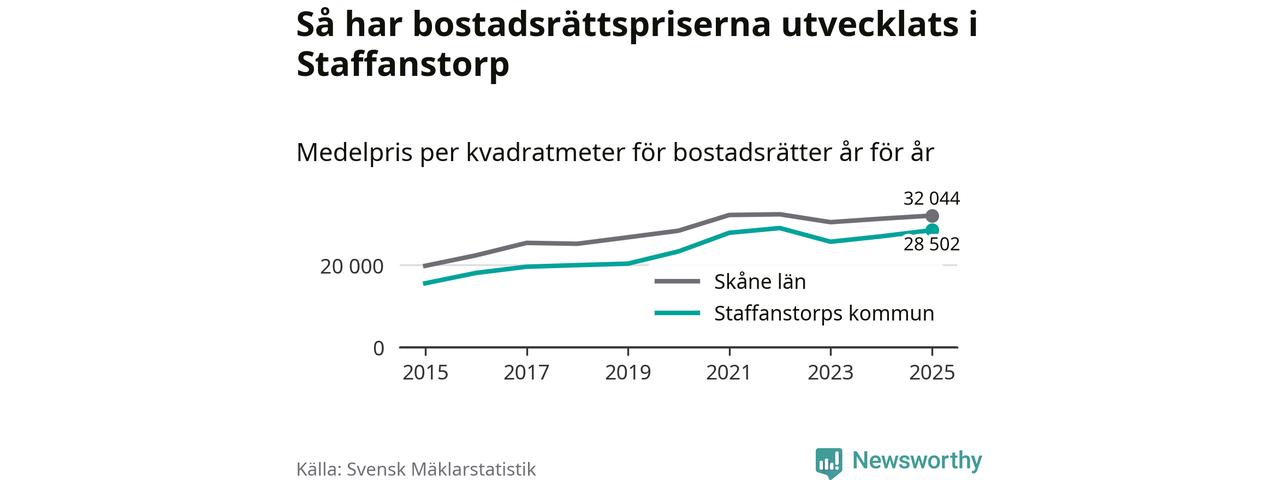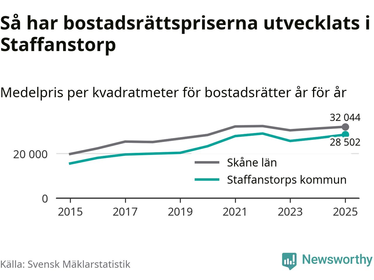 Det såldes totalt 180 bostadsrätter i Staffanstorps kommun under året. Genomsnittspriset per kvadratmeter landade på 28 502 kronor. Det är en ökning med sex procent i kommunen på ett år.