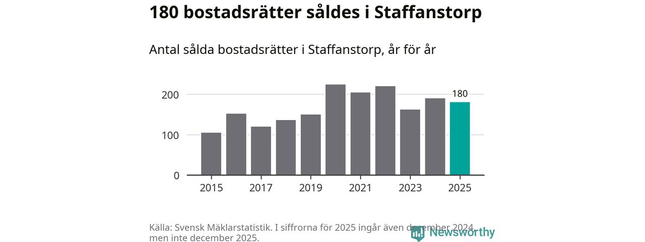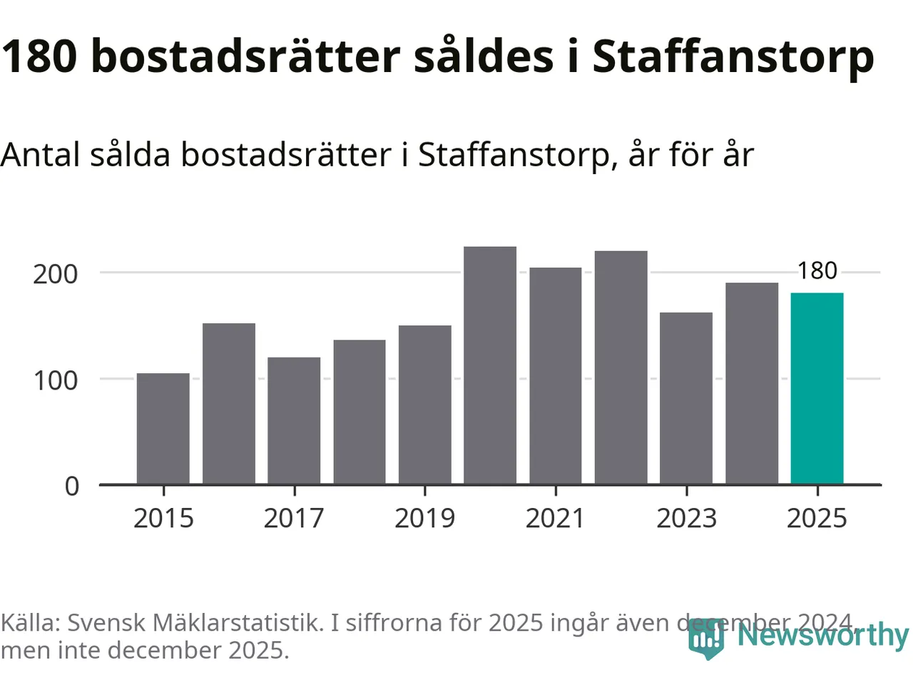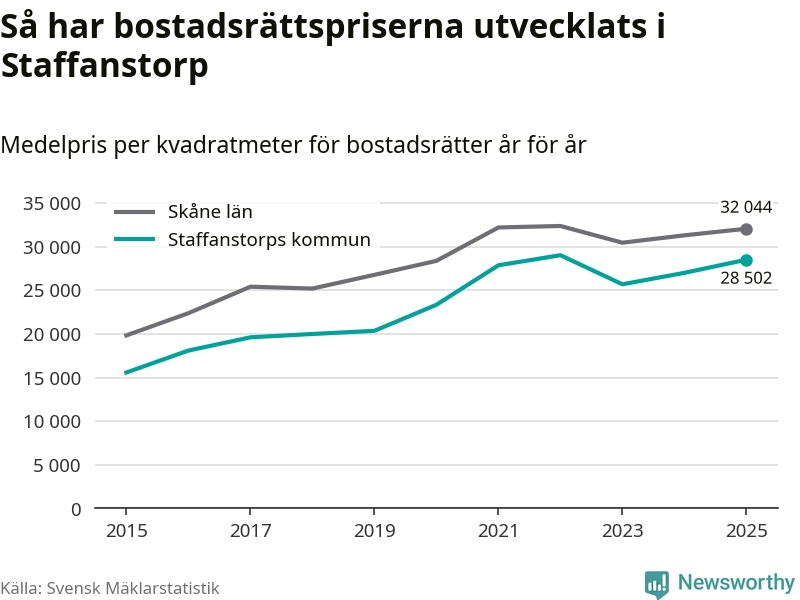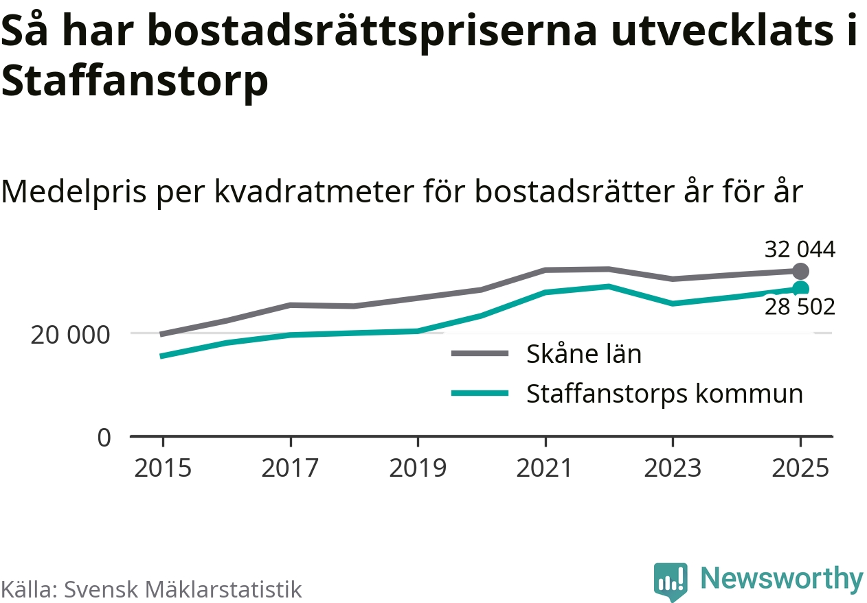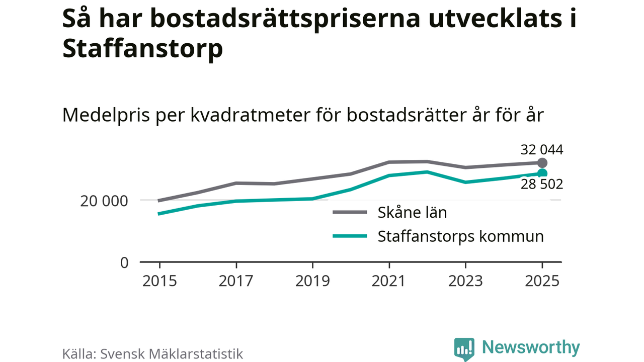 Det såldes totalt 180 bostadsrätter i Staffanstorps kommun under året. Genomsnittspriset per kvadratmeter landade på 28 502 kronor. Det är en ökning med sex procent i kommunen på ett år.