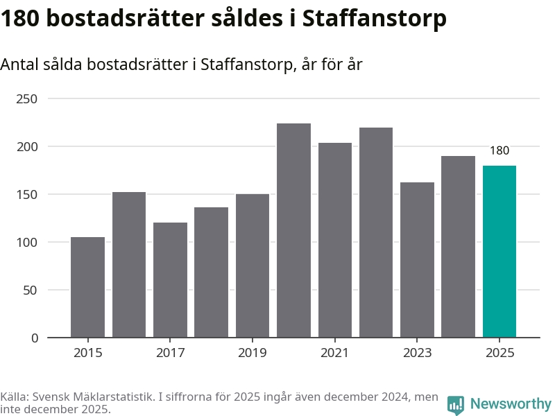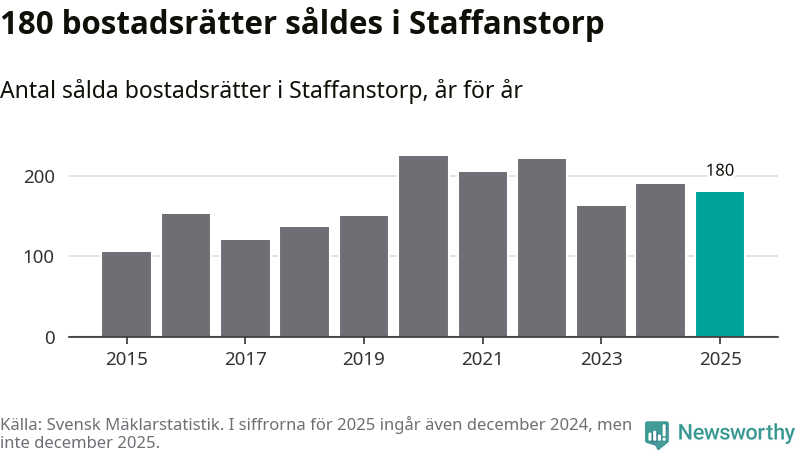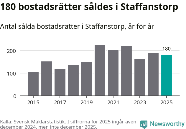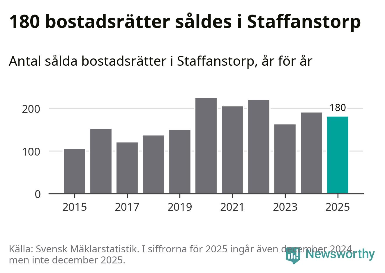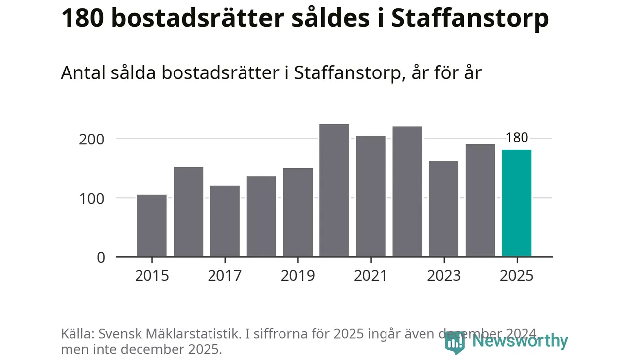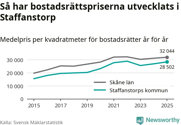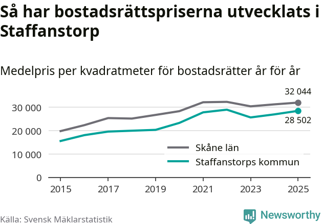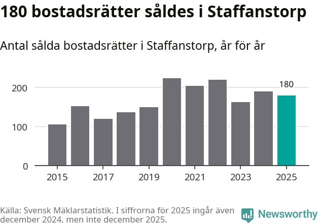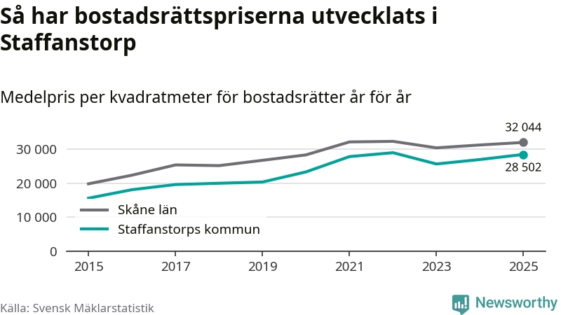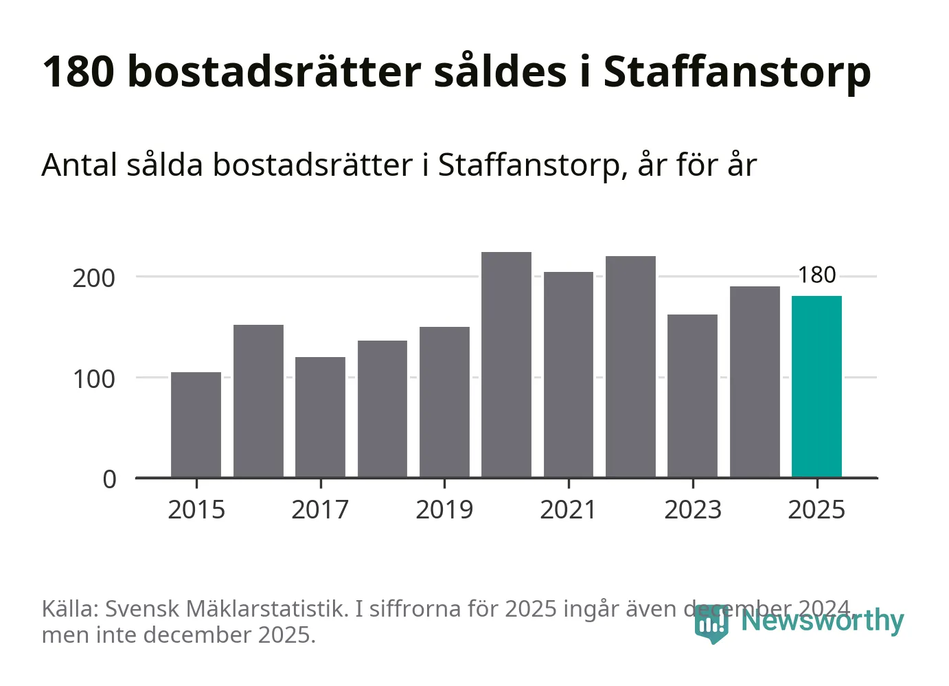 Det såldes totalt 180 bostadsrätter i Staffanstorps kommun under året. Genomsnittspriset per kvadratmeter landade på 28 502 kronor. Det är en ökning med sex procent i kommunen på ett år.