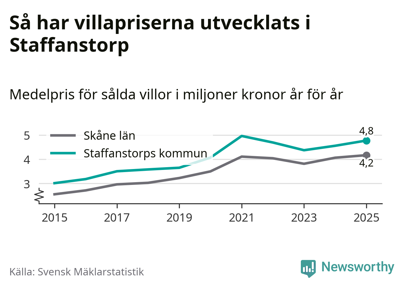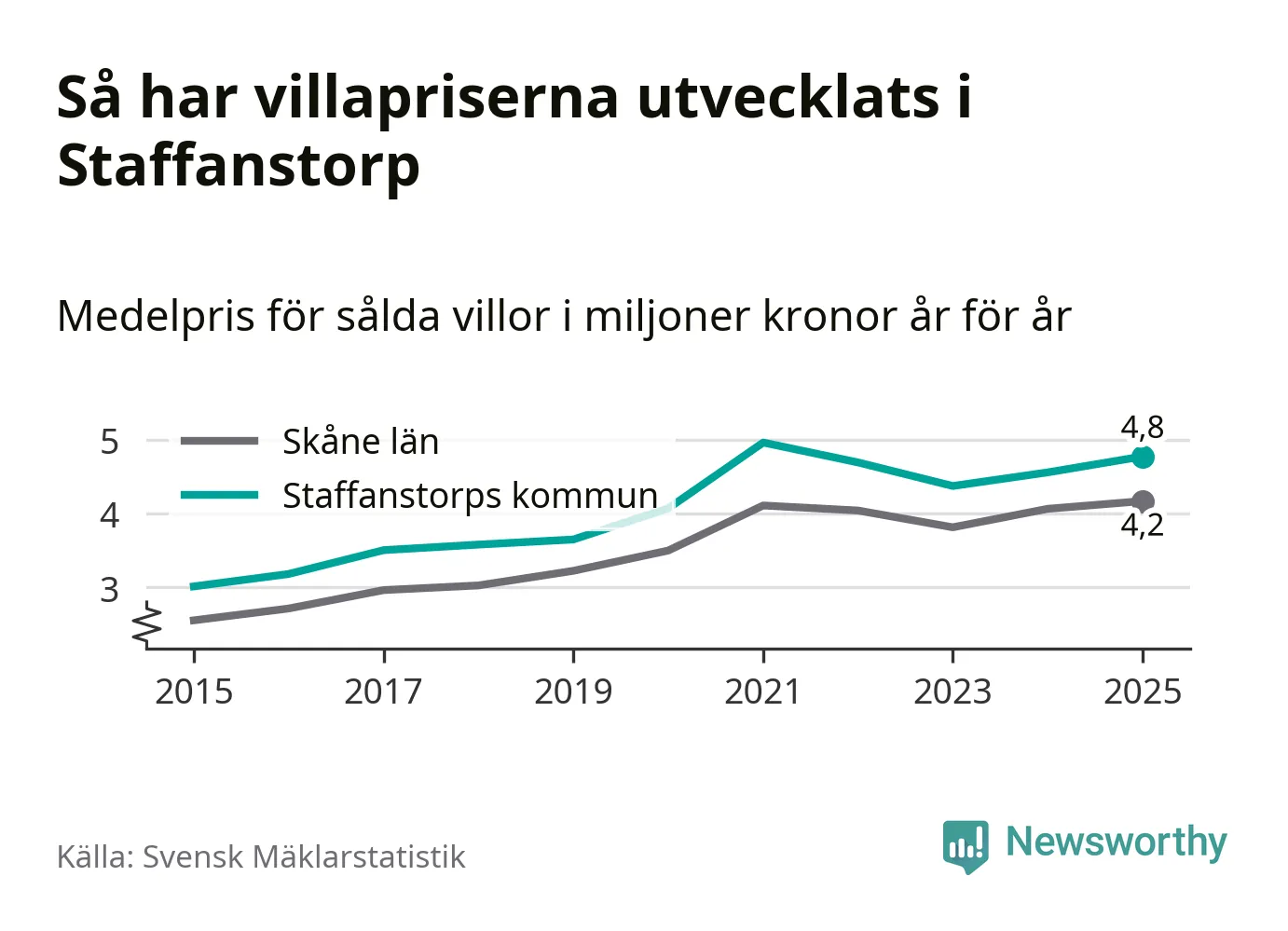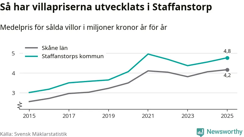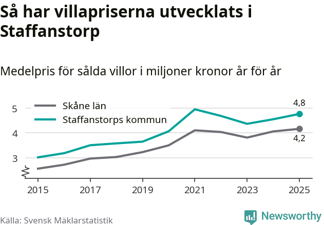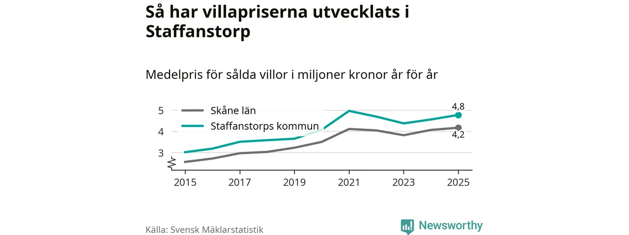 4,8 miljoner kronor är medelpriset för de villor som såldes i Staffanstorps kommun under året, eller 34 131 kronor per kvadratmeter. Det innebär en prisökning med fem procent på ett år och är andra året i rad som priserna ökar i kommunen.