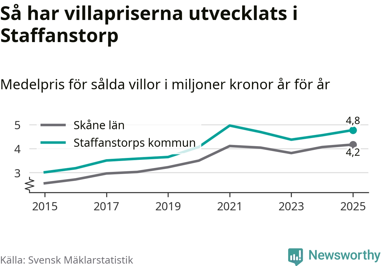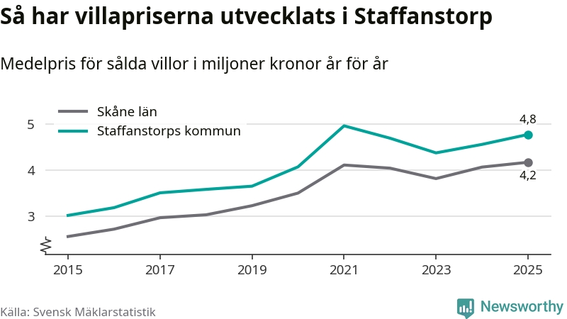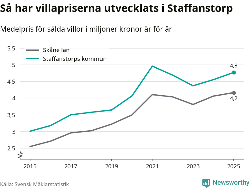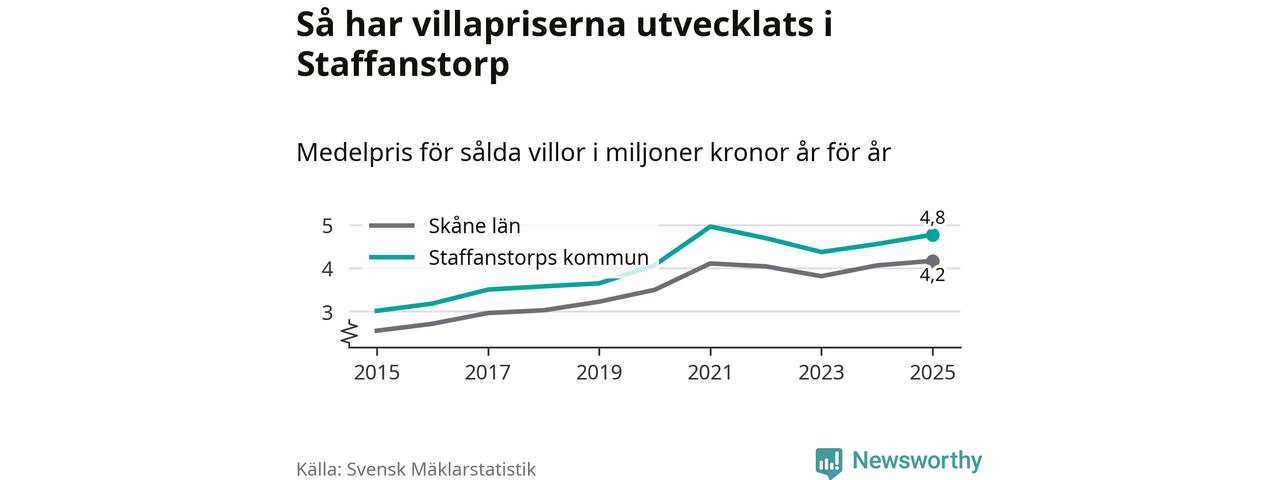 4,8 miljoner kronor är medelpriset för de villor som såldes i Staffanstorps kommun under året, eller 34 131 kronor per kvadratmeter. Det innebär en prisökning med fem procent på ett år och är andra året i rad som priserna ökar i kommunen.
