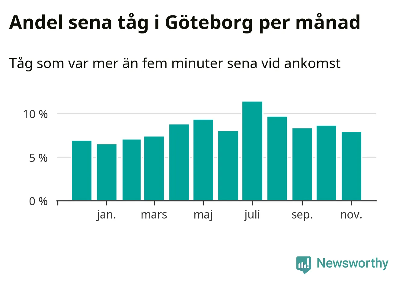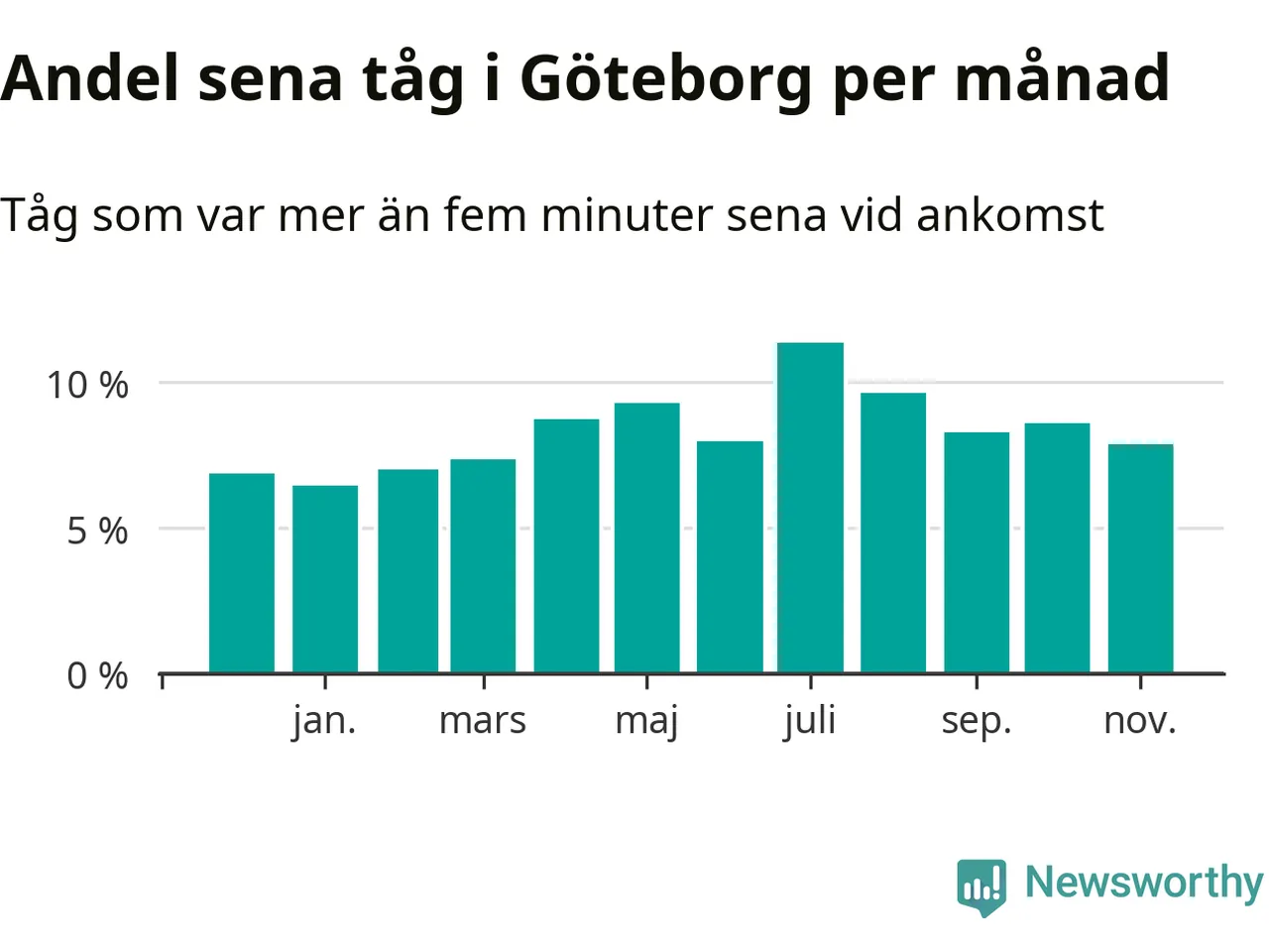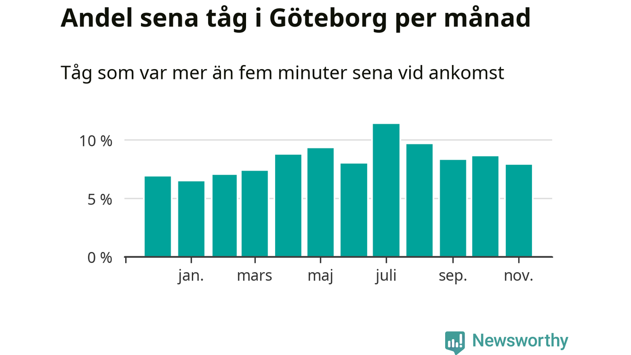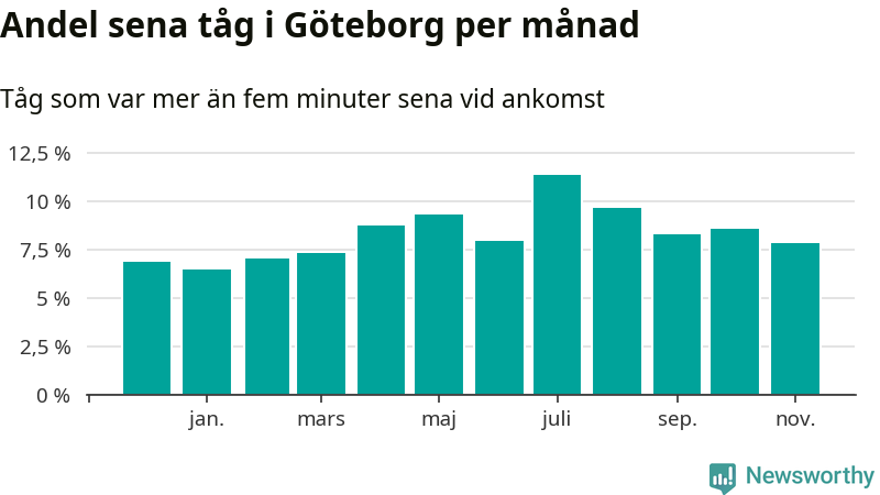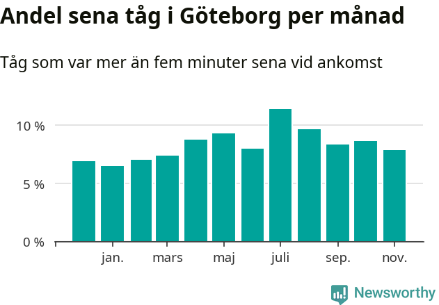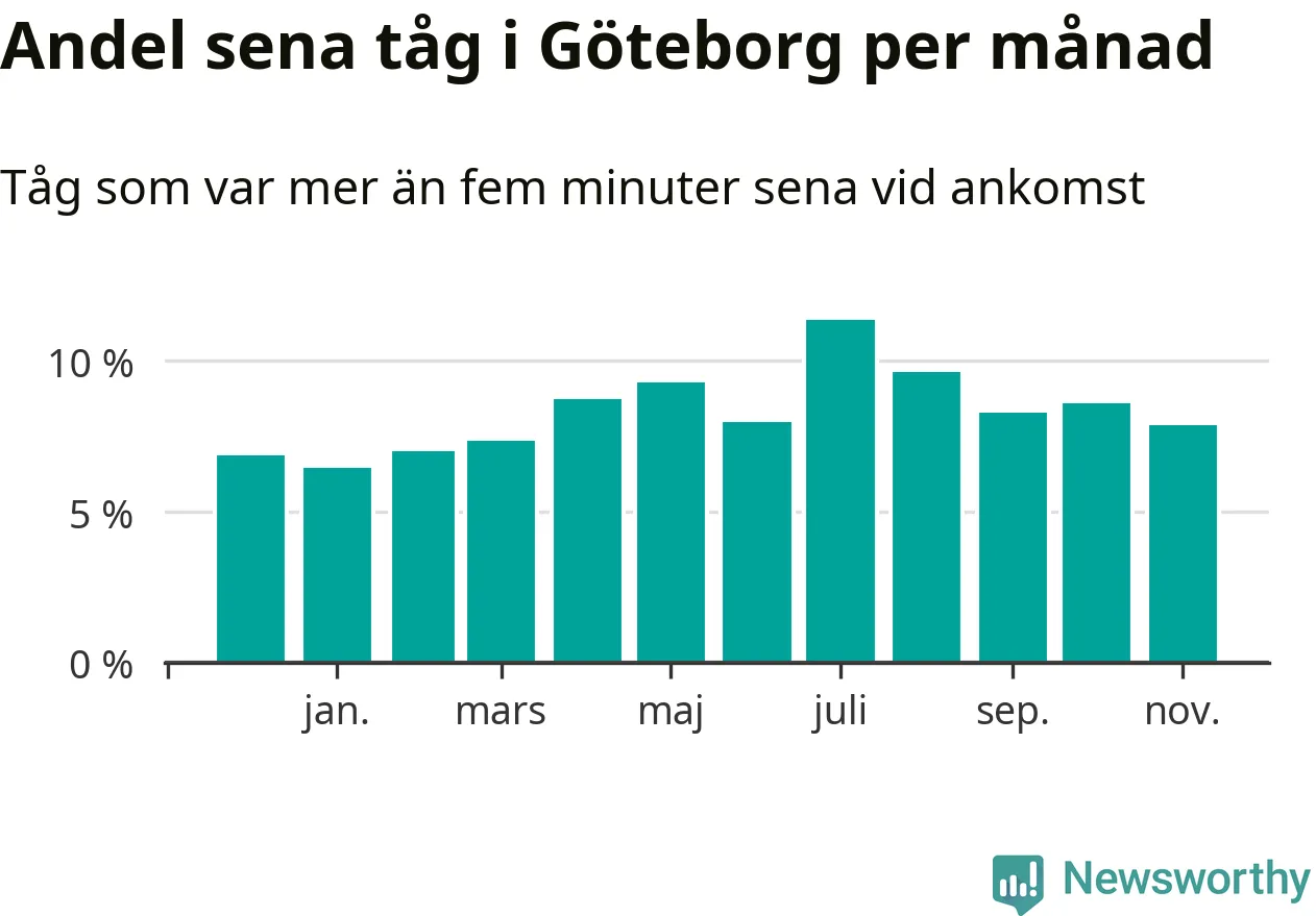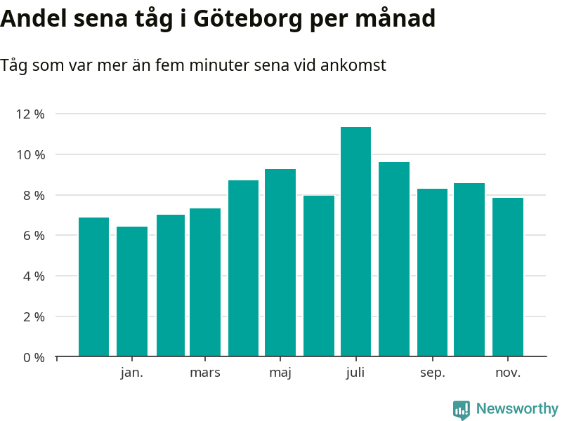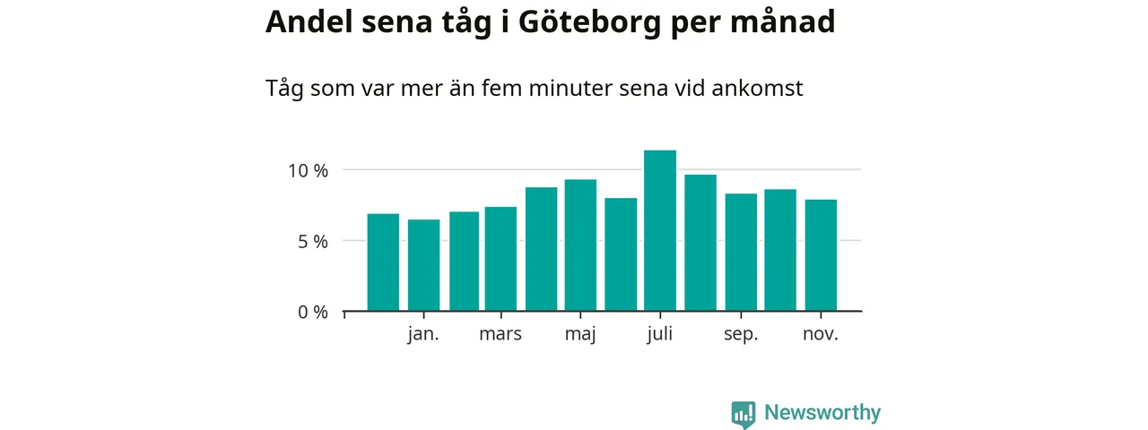 Den mest förseningsdrabbade månaden var juli, med i snitt elva procent sena tåg enligt det måttet. Det senaste halvåret har andelen sena tåg varit högre än genomsnittet för halvåret innan dess.
