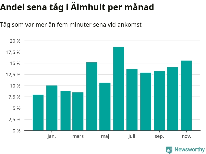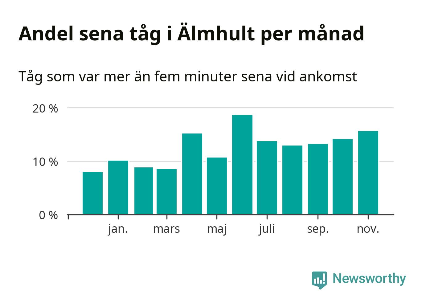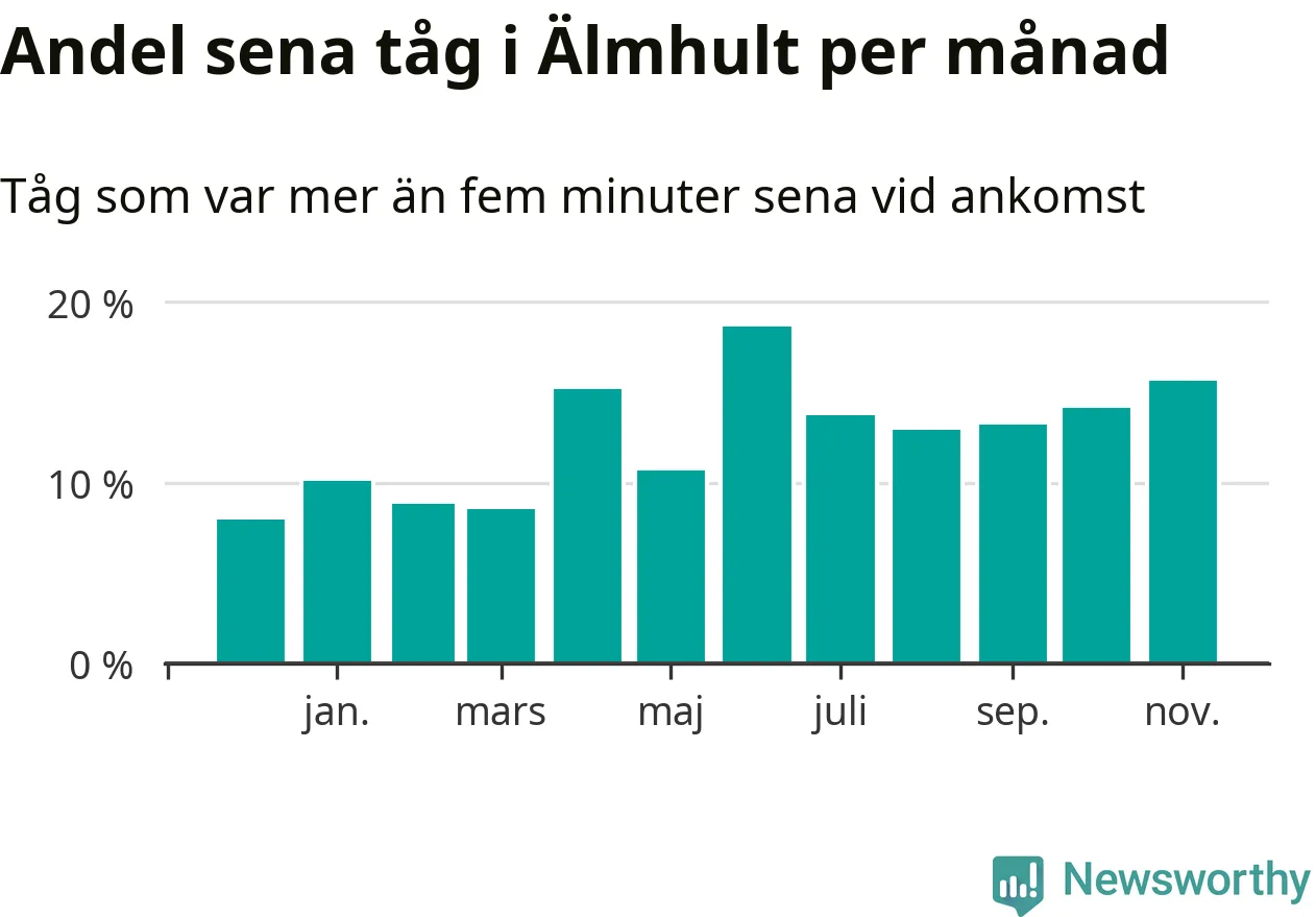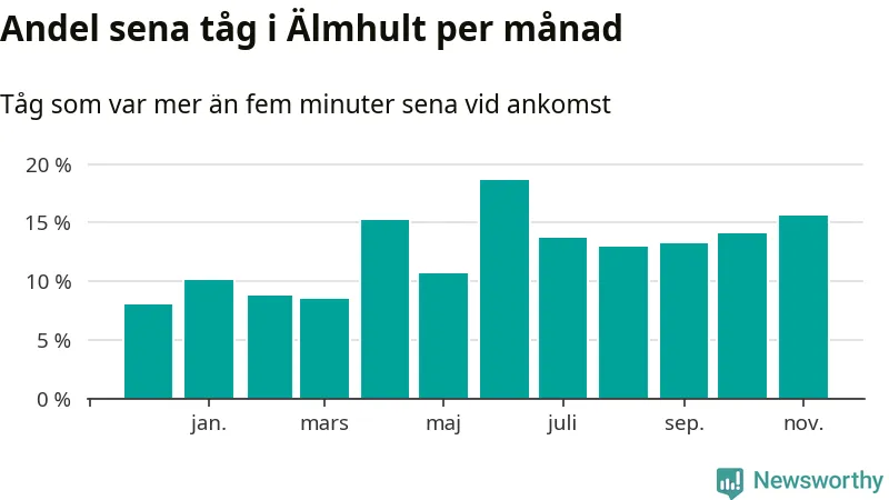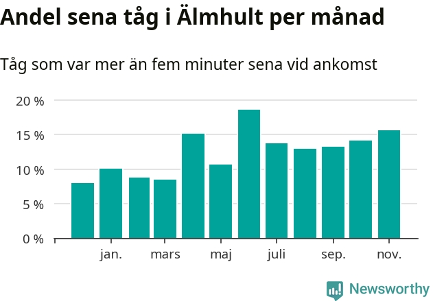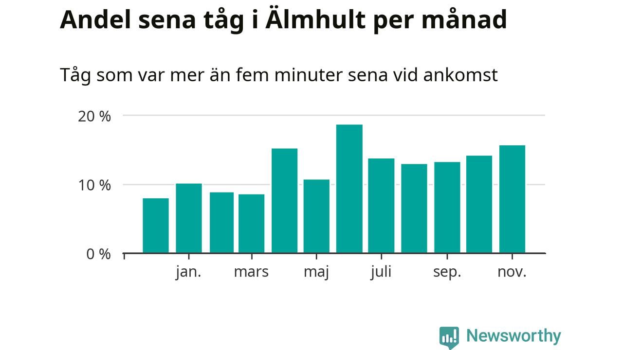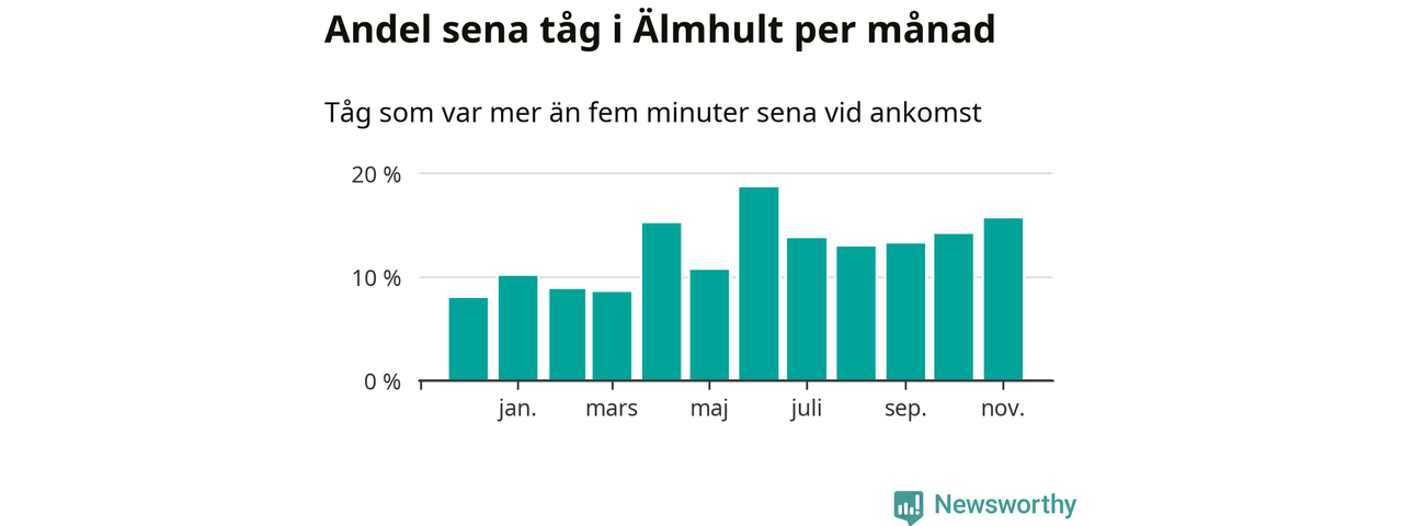 Den mest förseningsdrabbade månaden var juni, med i snitt 19 procent sena tåg enligt det måttet. De senaste månaderna tre har andelen sena tåg varit på uppåtgående. Det senaste halvåret har andelen sena tåg varit högre än genomsnittet för halvåret innan dess.