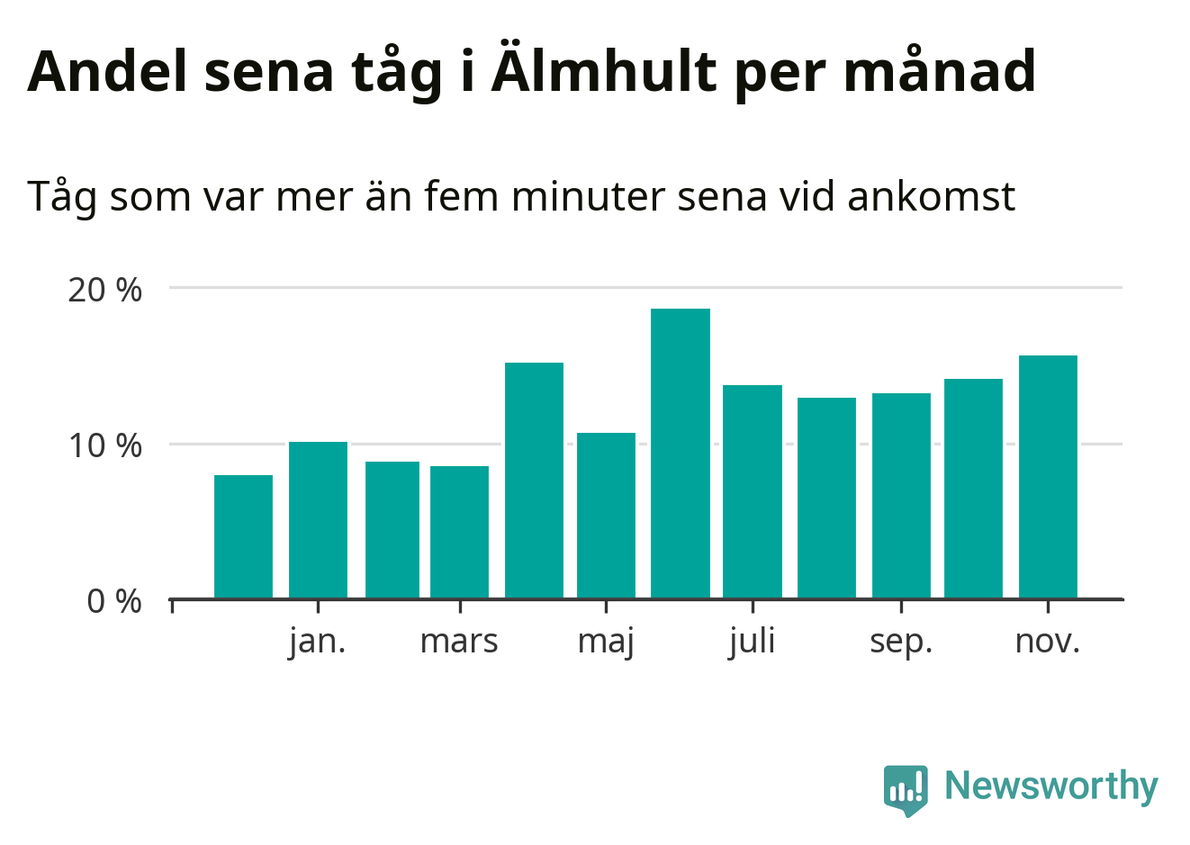 Under det senaste året har tolv procent av tågen varit sena när de passerat Älmhult eller Diö i Älmhults kommun. Ett tåg räknas här som sent om det varit mer än fem minuter efter tidtabellen.1