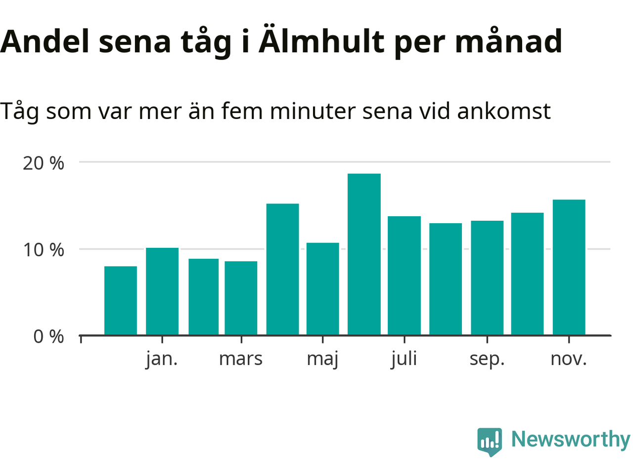 Den svenska järnvägsbranschen och Trafikverket har ett gemensamt mål om att 95 procent av tågen ska komma fram med högst fem minuters försening till sin slutstation. Dit är det alltså långt i Älmhult, även om det officiella punktlighetsmåttet (ankomst till slutstation) inte är rakt av jämförbart med det som används i den här artikeln (där vi tittar på alla tåg som passerar en station).