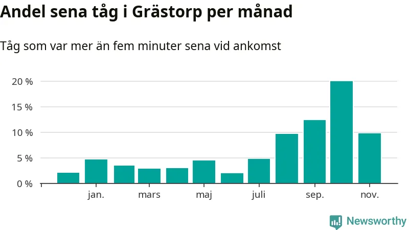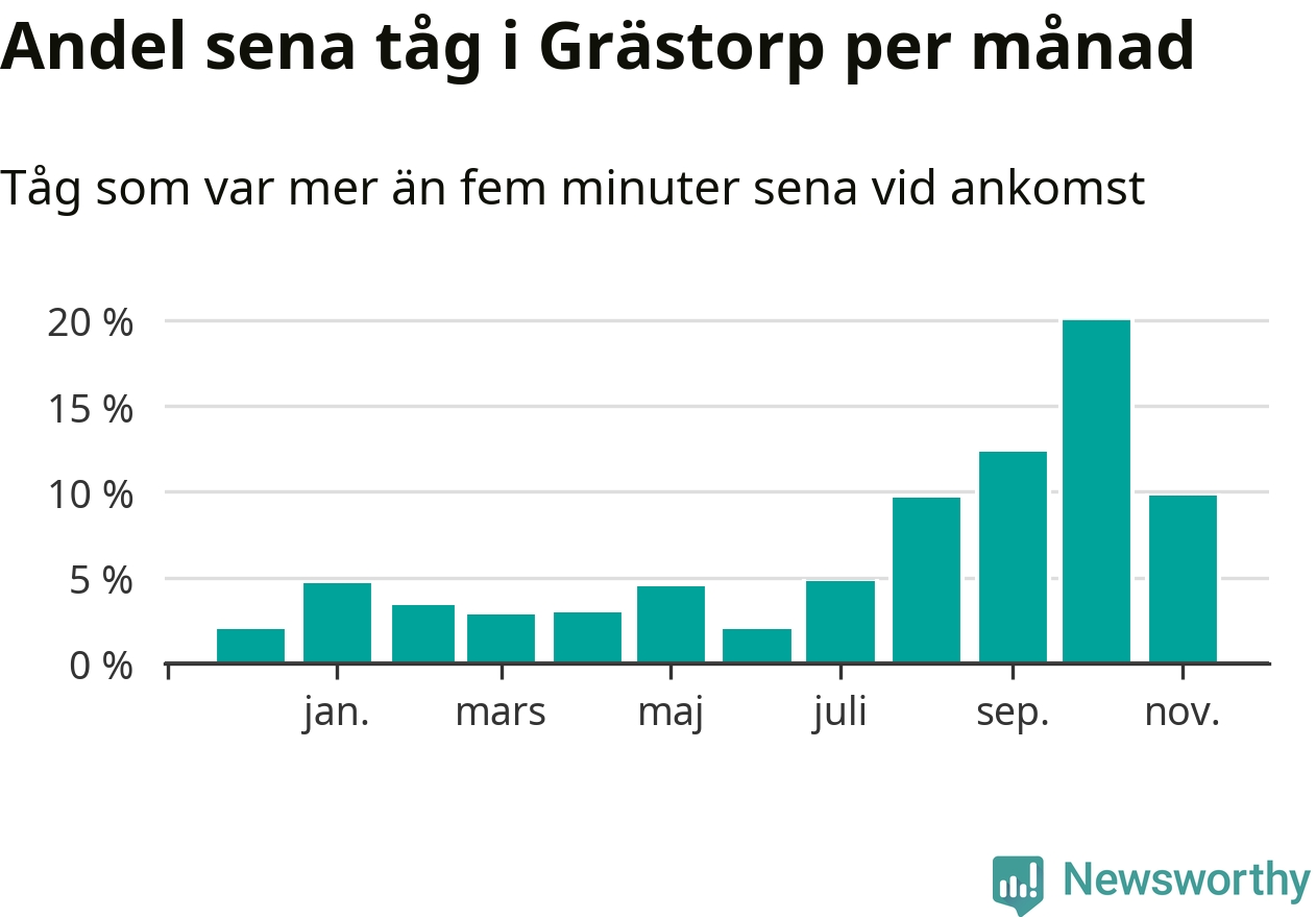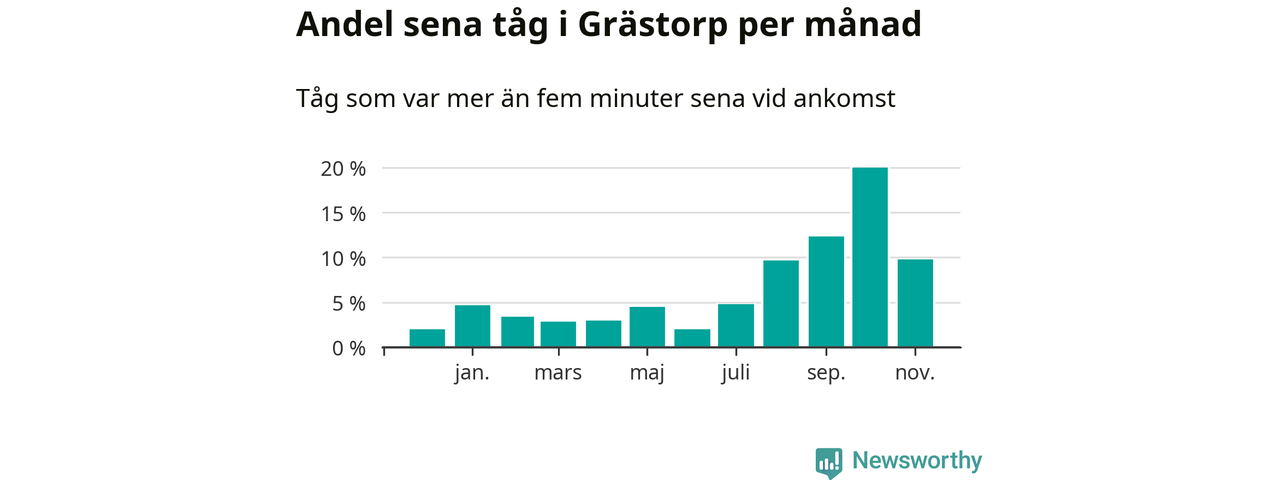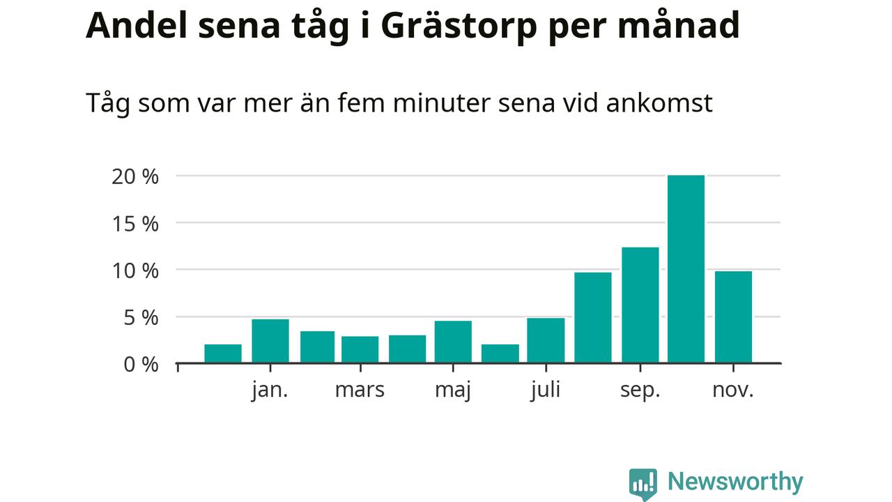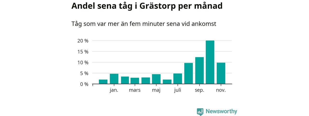 Den svenska järnvägsbranschen och Trafikverket har ett gemensamt mål om att 95 procent av tågen ska komma fram med högst fem minuters försening till sin slutstation. Tågtrafiken vid Grästorps station låg på rätt sida om den gränsen 29 av 52 veckor det senaste året, även om det officiella punktlighetsmåttet (ankomst till slutstation) inte är rakt av jämförbart med det som används i den här artikeln (där vi tittar på alla tåg som passerar en station).