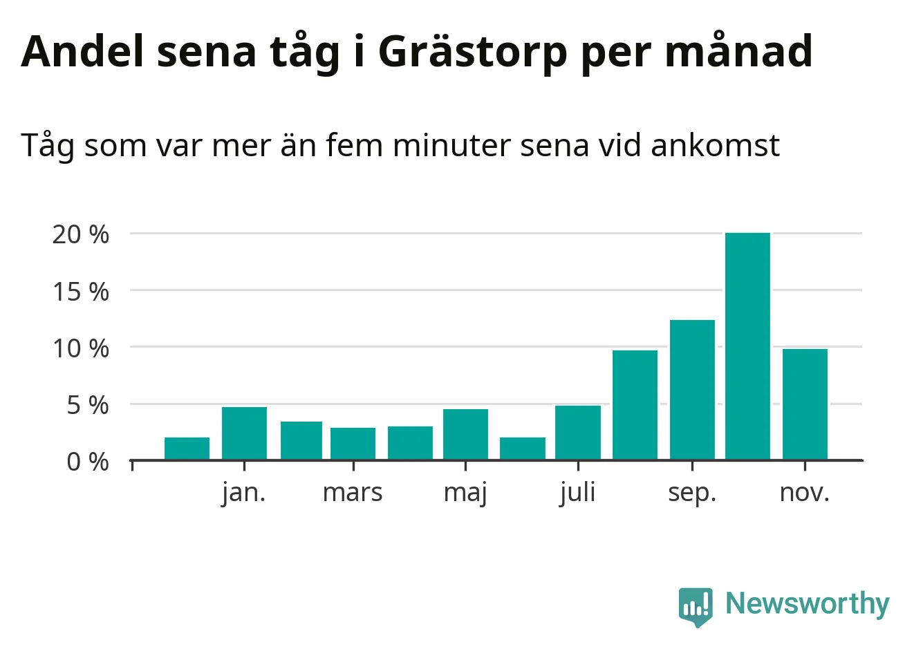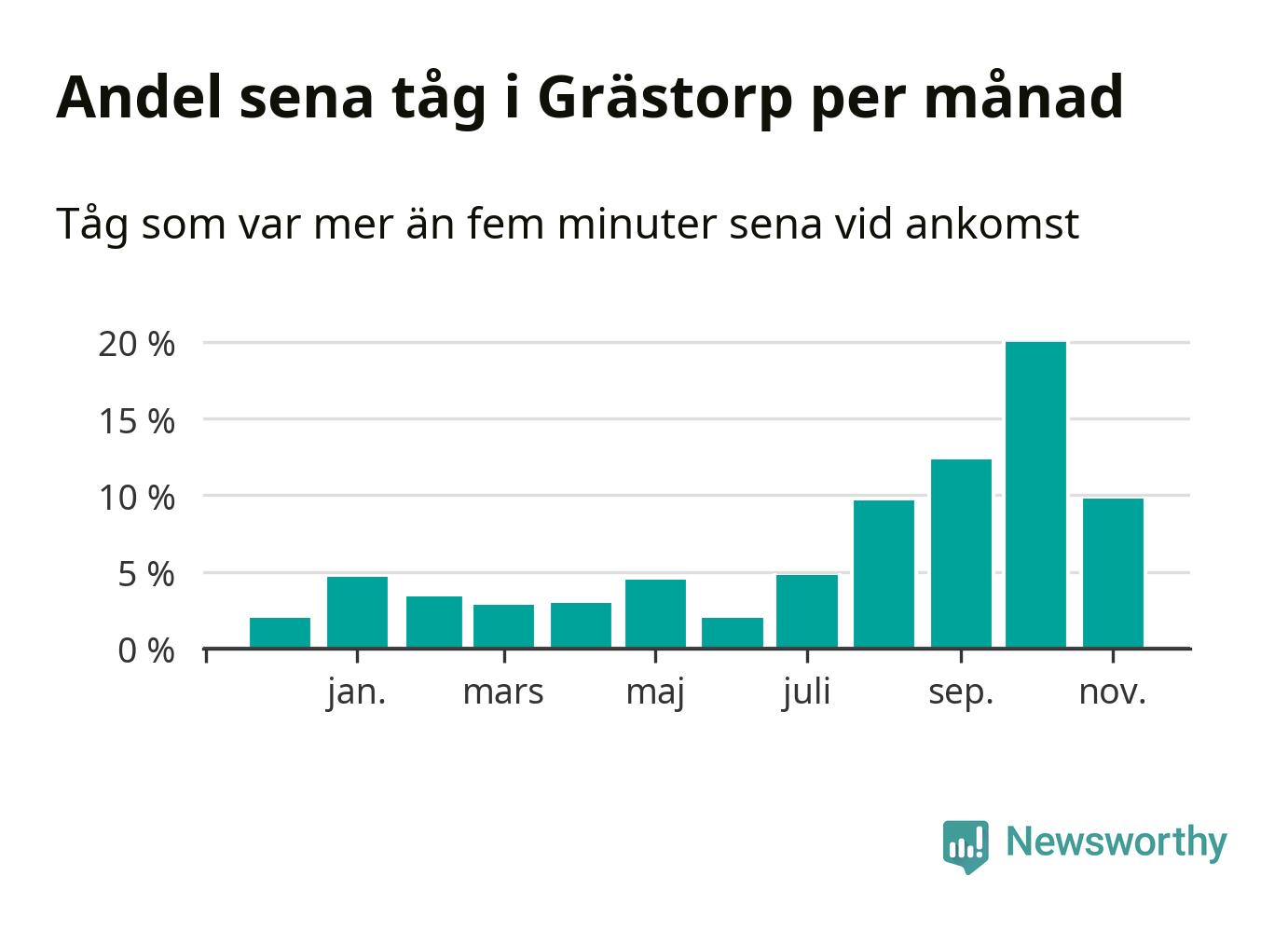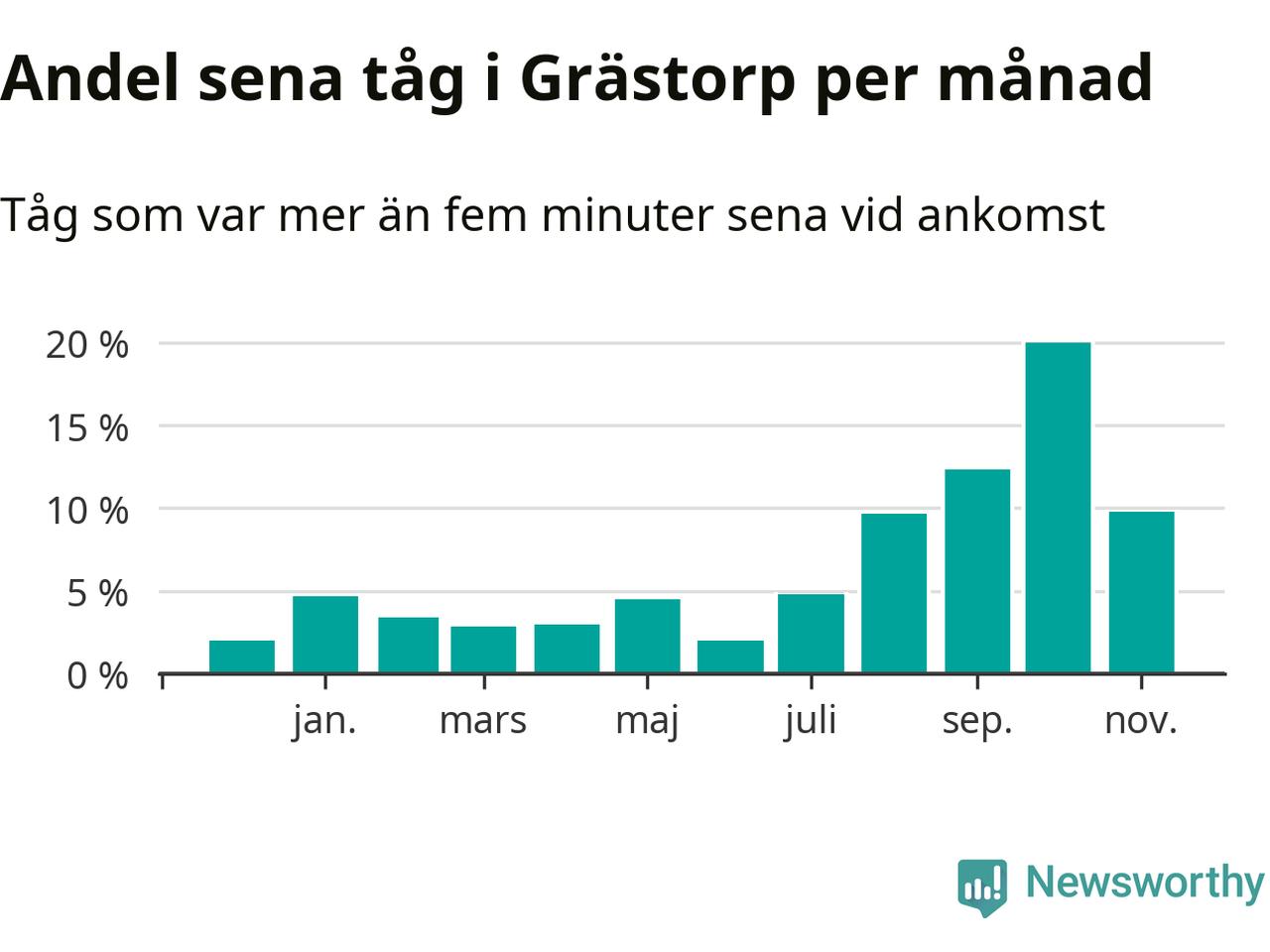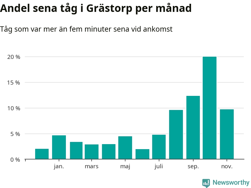 Den svenska järnvägsbranschen och Trafikverket har ett gemensamt mål om att 95 procent av tågen ska komma fram med högst fem minuters försening till sin slutstation. Tågtrafiken vid Grästorps station låg på rätt sida om den gränsen 29 av 52 veckor det senaste året, även om det officiella punktlighetsmåttet (ankomst till slutstation) inte är rakt av jämförbart med det som används i den här artikeln (där vi tittar på alla tåg som passerar en station).