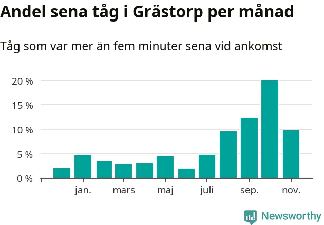 Det senaste halvåret har andelen sena tåg vid Grästorps station varit högre än halvåret innan dess. Newsworthy och Sveriges Natur har studerat tågens punktlighet det senaste året, på jakt efter järnvägens flaskhalsar.