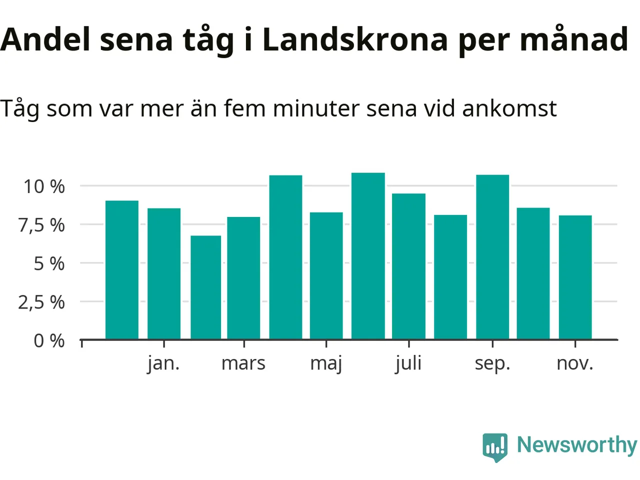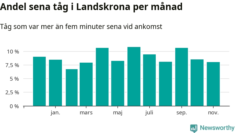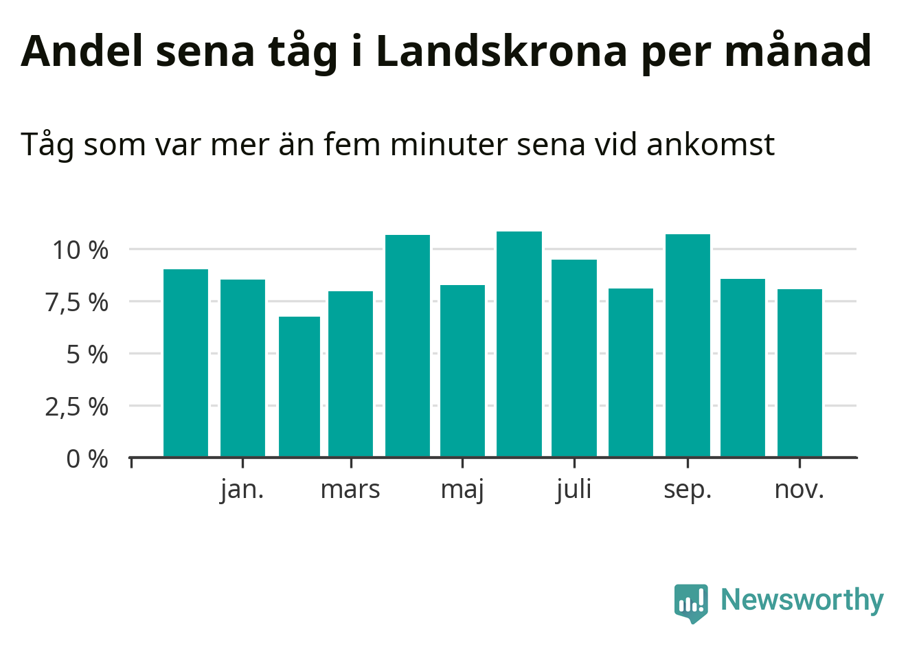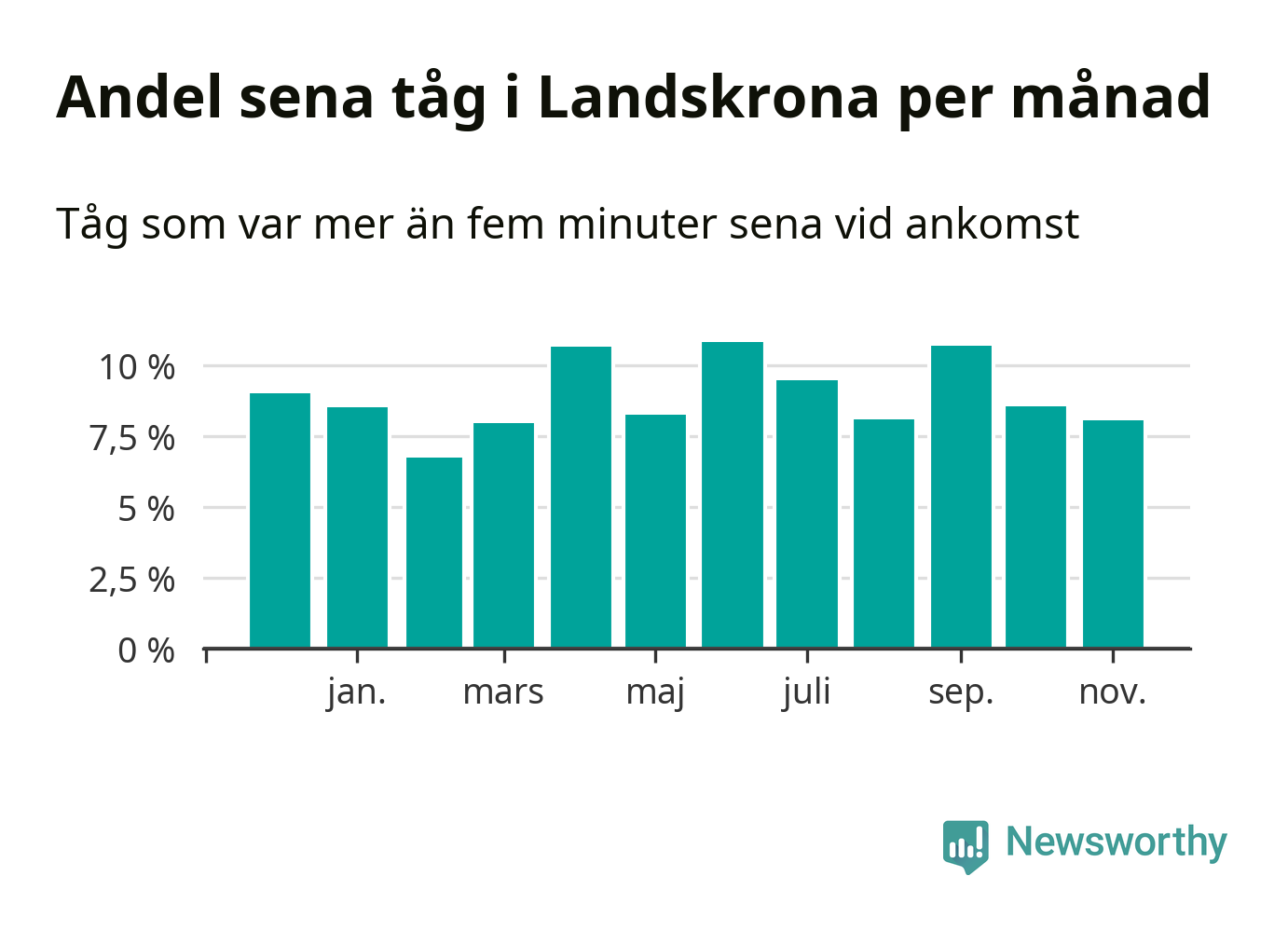 Den svenska järnvägsbranschen och Trafikverket har ett gemensamt mål om att 95 procent av tågen ska komma fram med högst fem minuters försening till sin slutstation. Dit är det långt i de flesta delar av landet. I Landskrona var förseningarna färre än 5 procent under endast en vecka av 52 det senaste året. Det ska noteras att siffrorna i den här artikeln skiljer sig från det officiella punktlighetsmåttet, som bara beaktar ankomster till slutstationer, och där insamlingen sker på ett annat sätt än i den här artikeln.