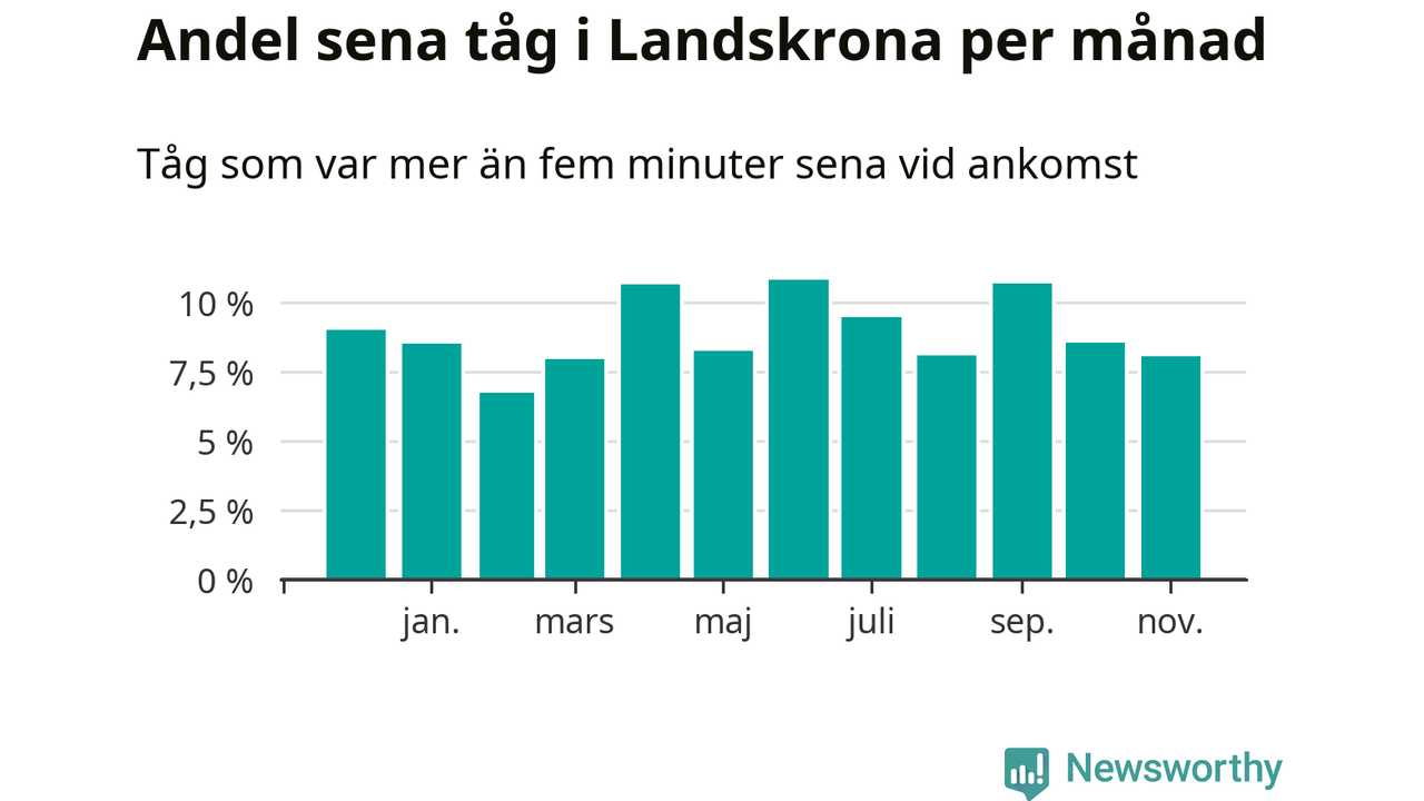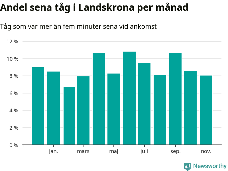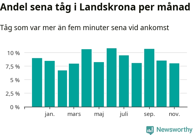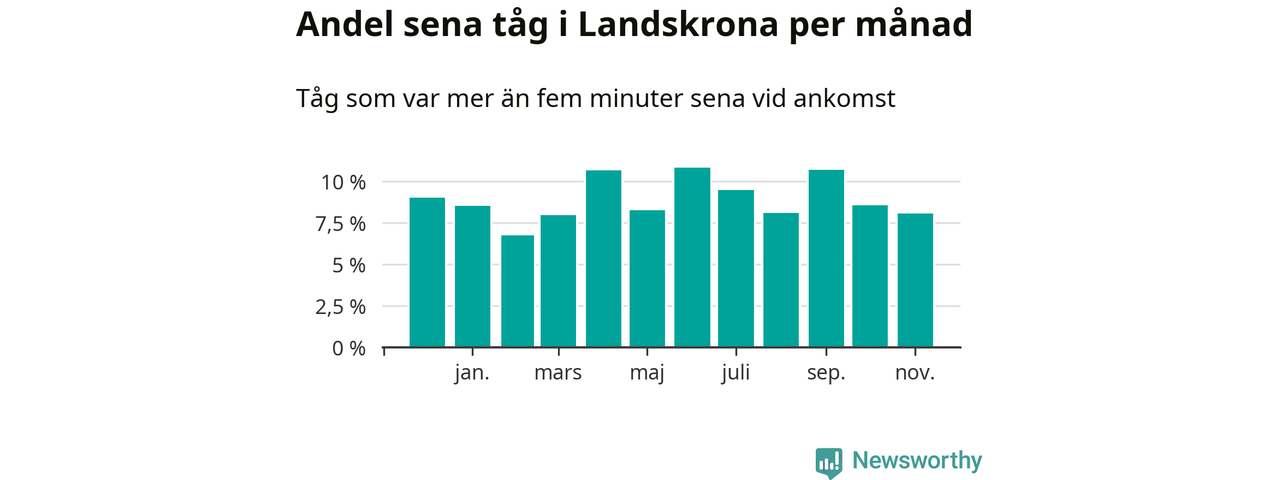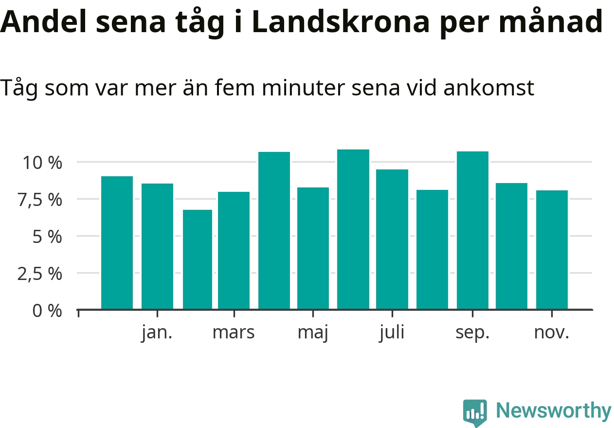 Den svenska järnvägsbranschen och Trafikverket har ett gemensamt mål om att 95 procent av tågen ska komma fram med högst fem minuters försening till sin slutstation. Dit är det långt i de flesta delar av landet. I Landskrona var förseningarna färre än 5 procent under endast en vecka av 52 det senaste året. Det ska noteras att siffrorna i den här artikeln skiljer sig från det officiella punktlighetsmåttet, som bara beaktar ankomster till slutstationer, och där insamlingen sker på ett annat sätt än i den här artikeln.