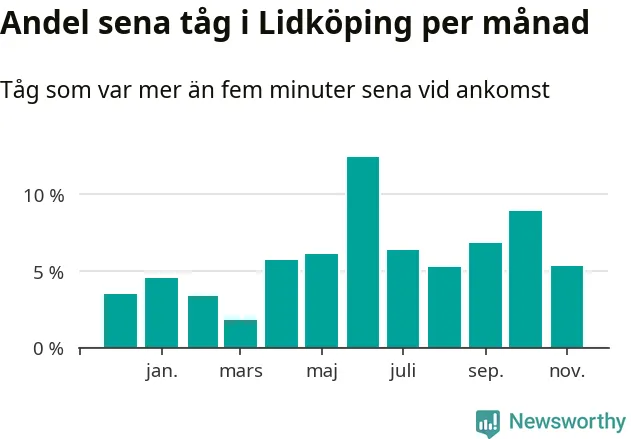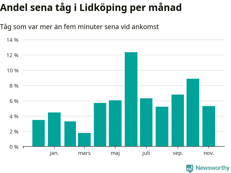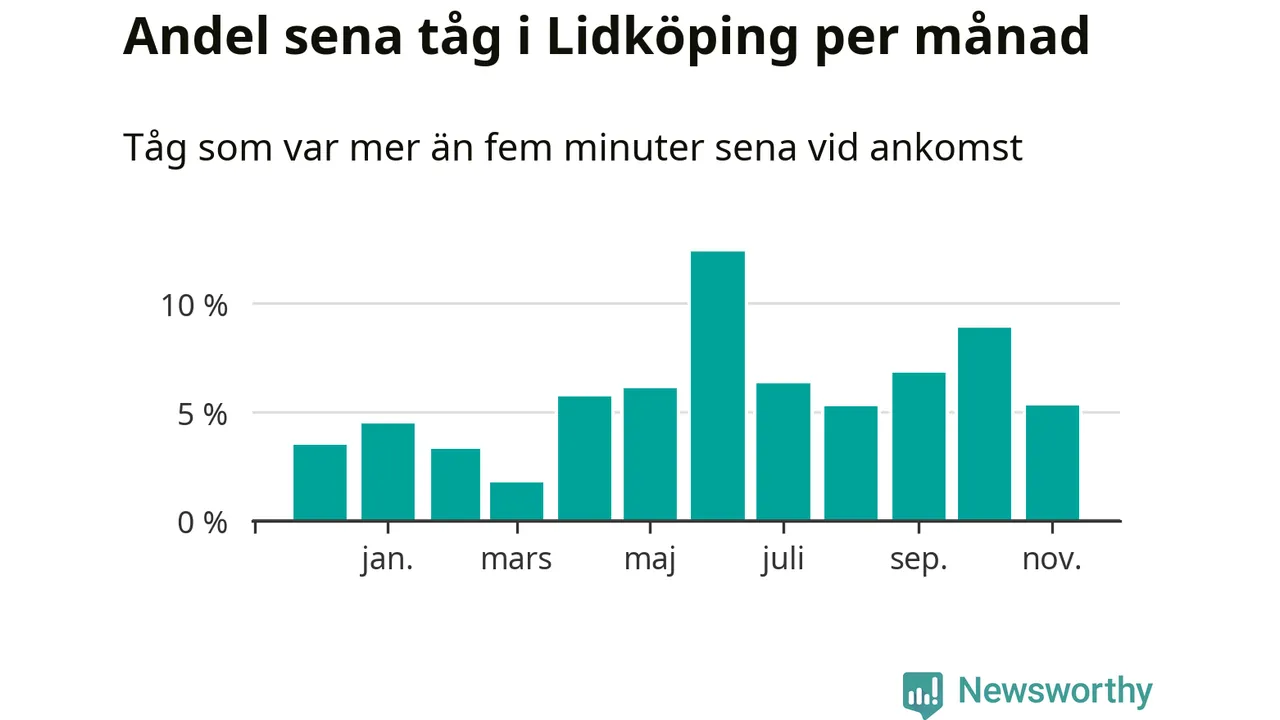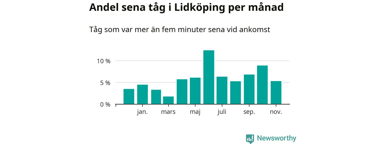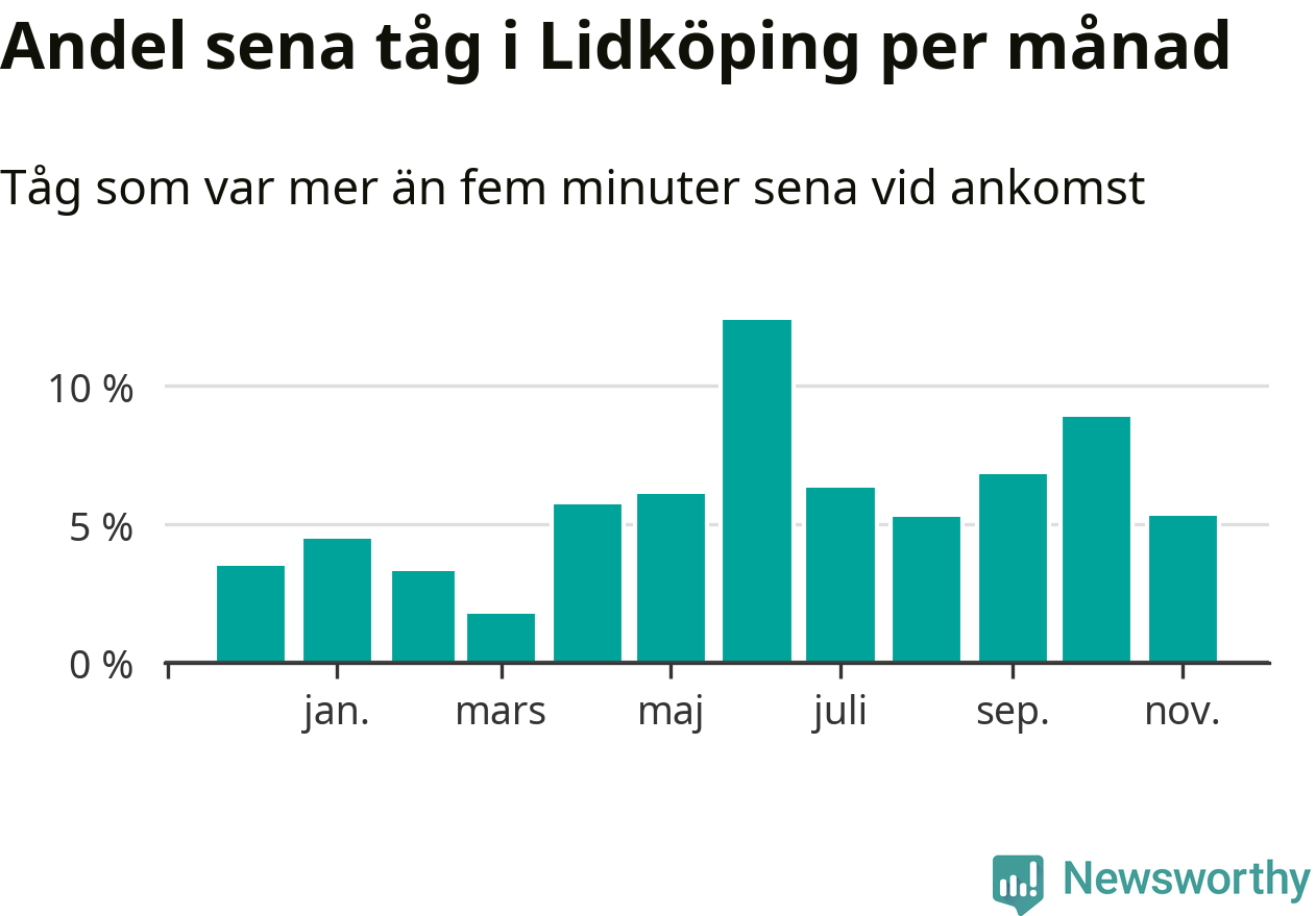 Den mest förseningsdrabbade månaden var juni, med i snitt tolv procent sena tåg enligt det måttet. Det senaste halvåret har andelen sena tåg varit högre än genomsnittet för halvåret innan dess.