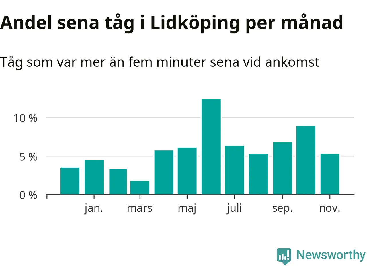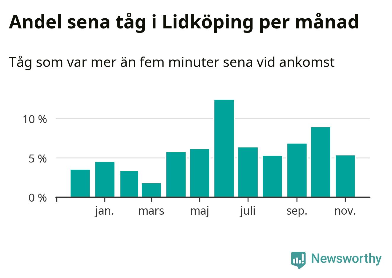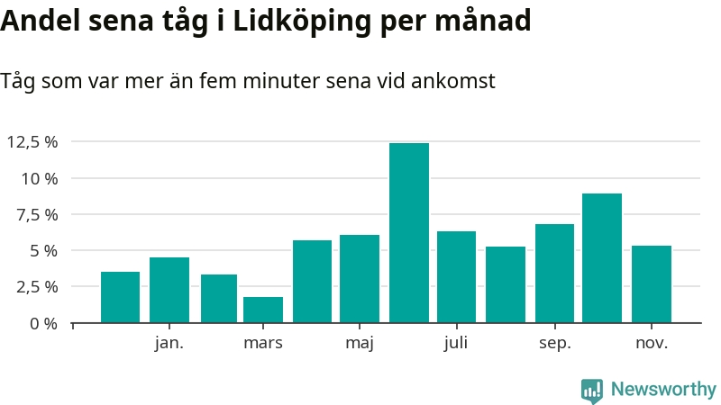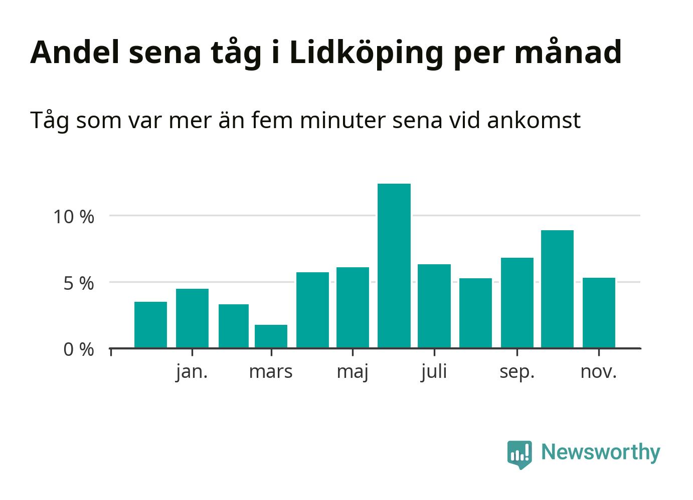Den mest förseningsdrabbade månaden var juni, med i snitt tolv procent sena tåg enligt det måttet. Det senaste halvåret har andelen sena tåg varit högre än genomsnittet för halvåret innan dess.