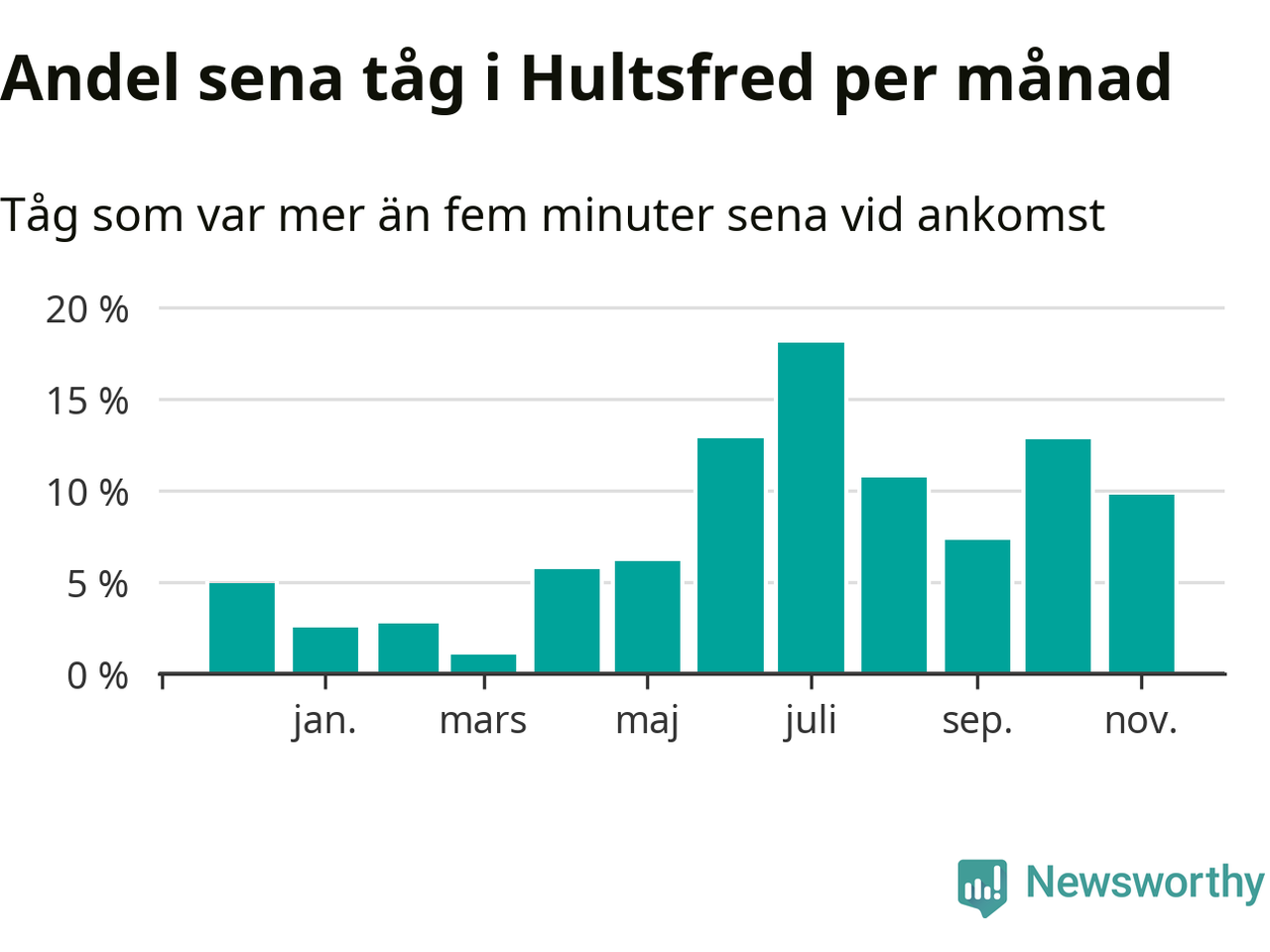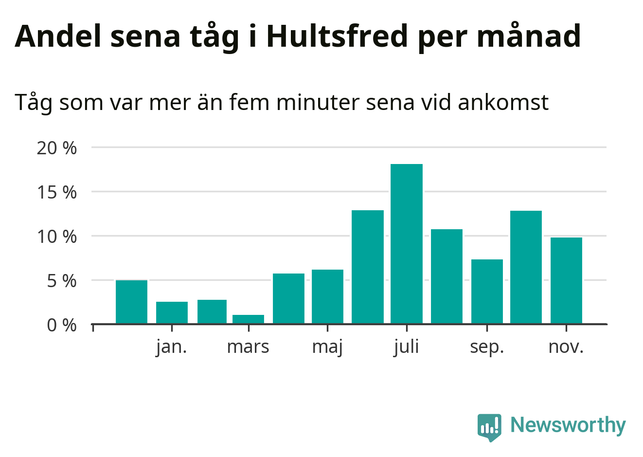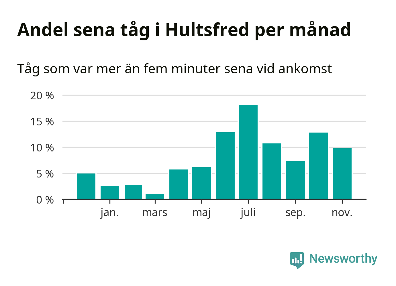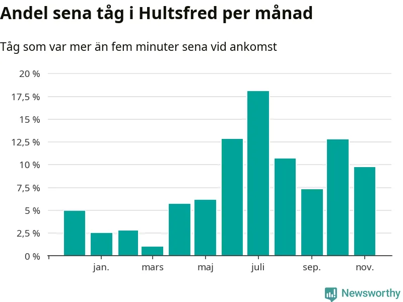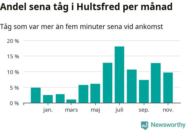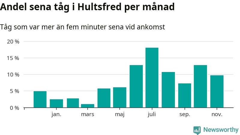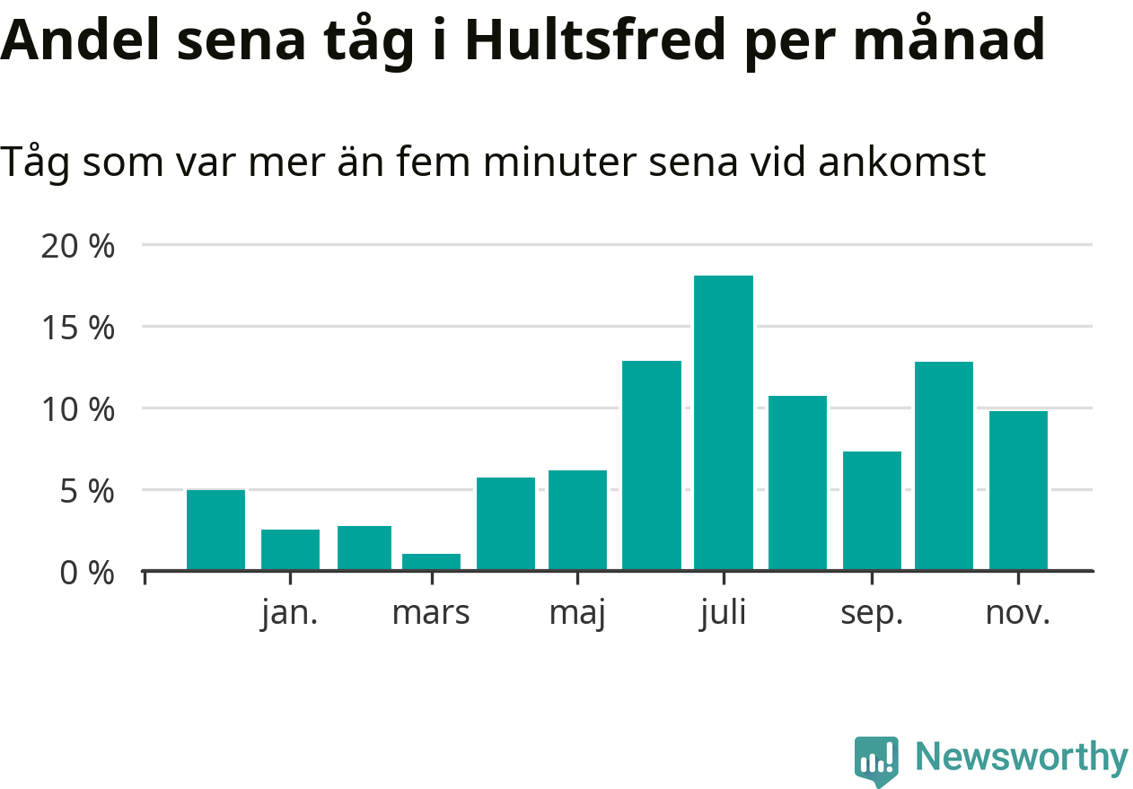 Den mest förseningsdrabbade månaden var juli, med i snitt 18 procent sena tåg enligt det måttet. Det senaste halvåret har andelen sena tåg varit högre än genomsnittet för halvåret innan dess.