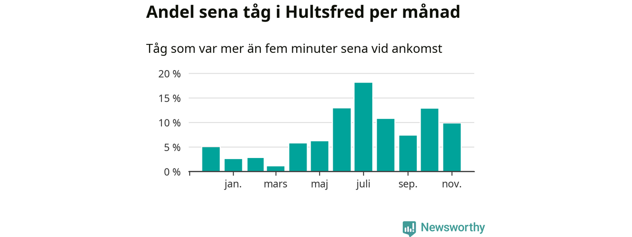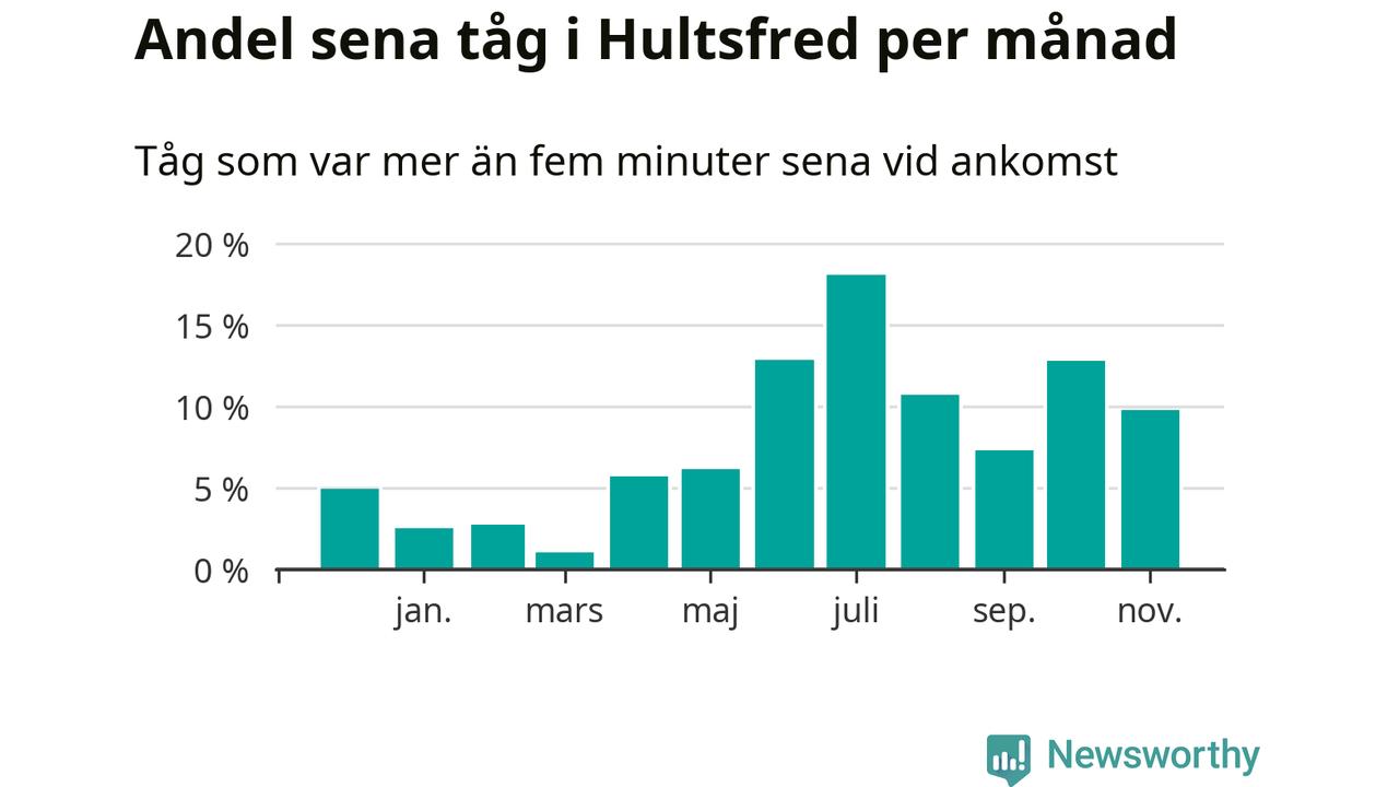 Den svenska järnvägsbranschen och Trafikverket har ett gemensamt mål om att 95 procent av tågen ska komma fram med högst fem minuters försening till sin slutstation. Tågtrafiken vid Hultsfreds station låg på rätt sida om den gränsen 23 av 52 veckor det senaste året, även om det officiella punktlighetsmåttet (ankomst till slutstation) inte är rakt av jämförbart med det som används i den här artikeln (där vi tittar på alla tåg som passerar en station).