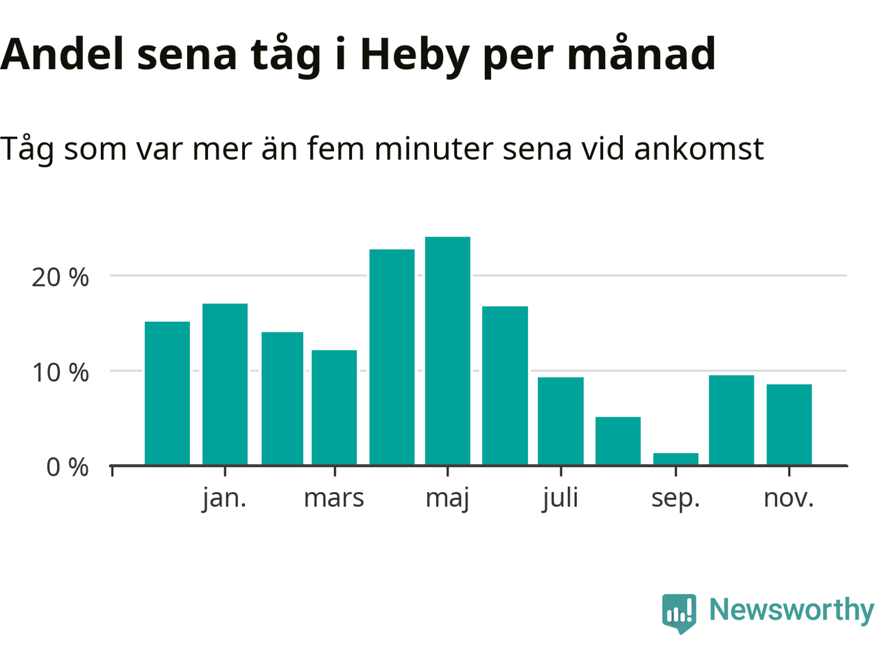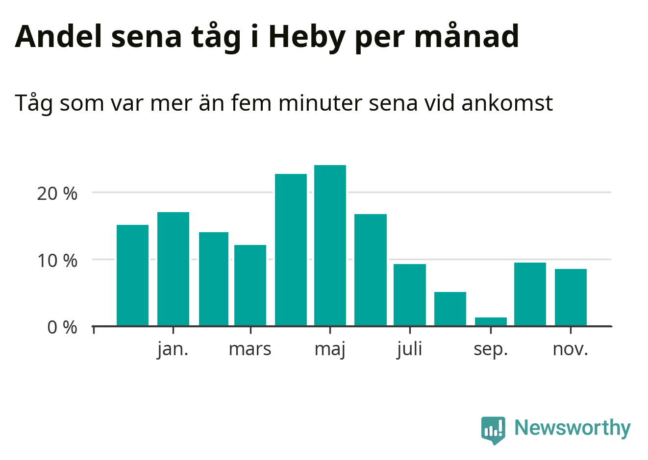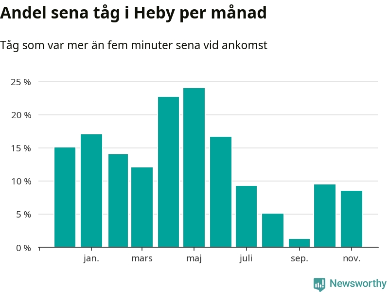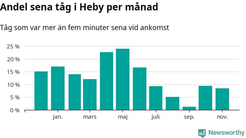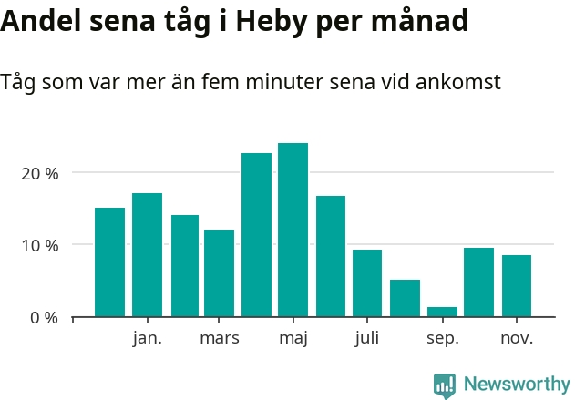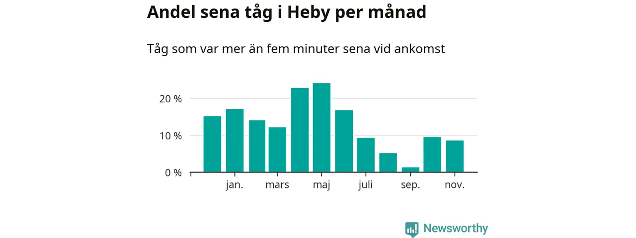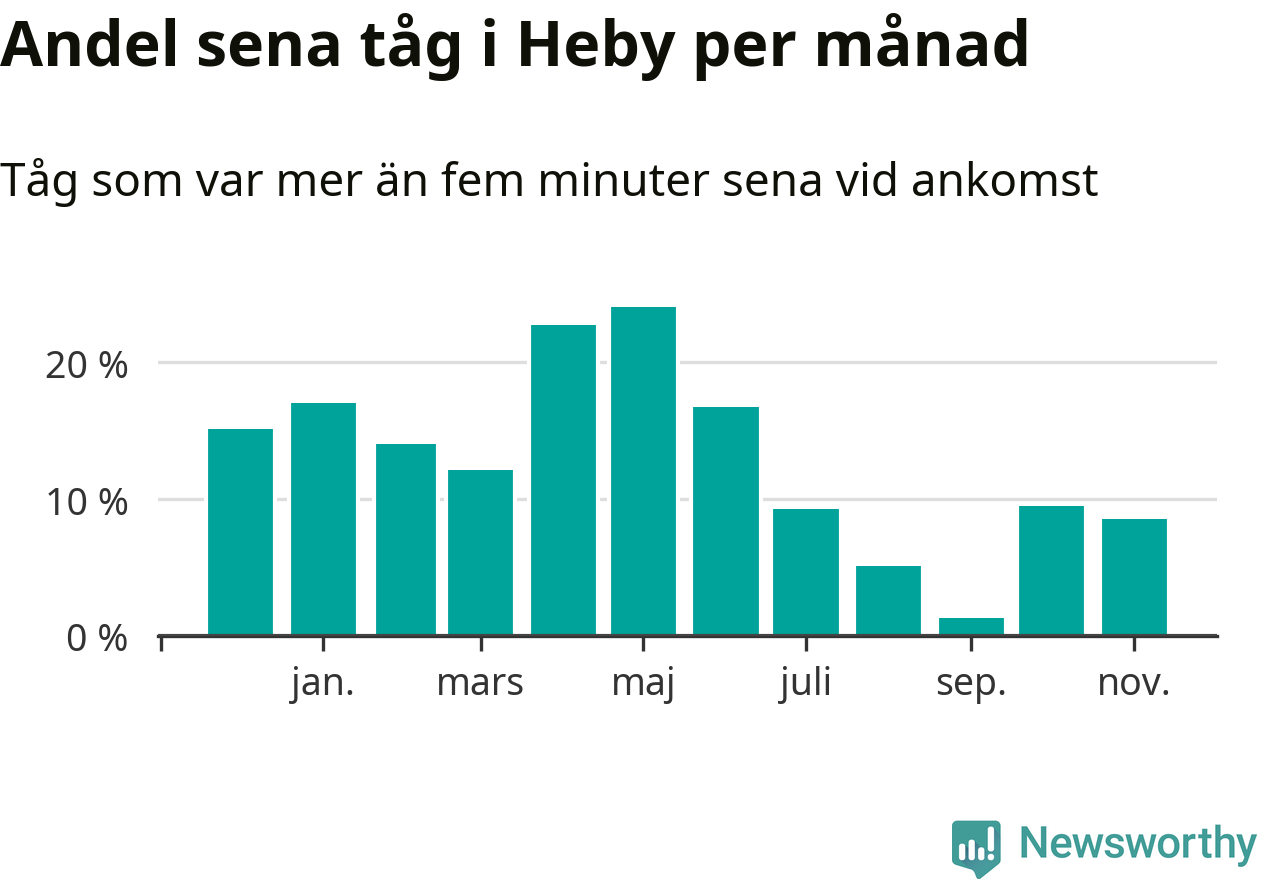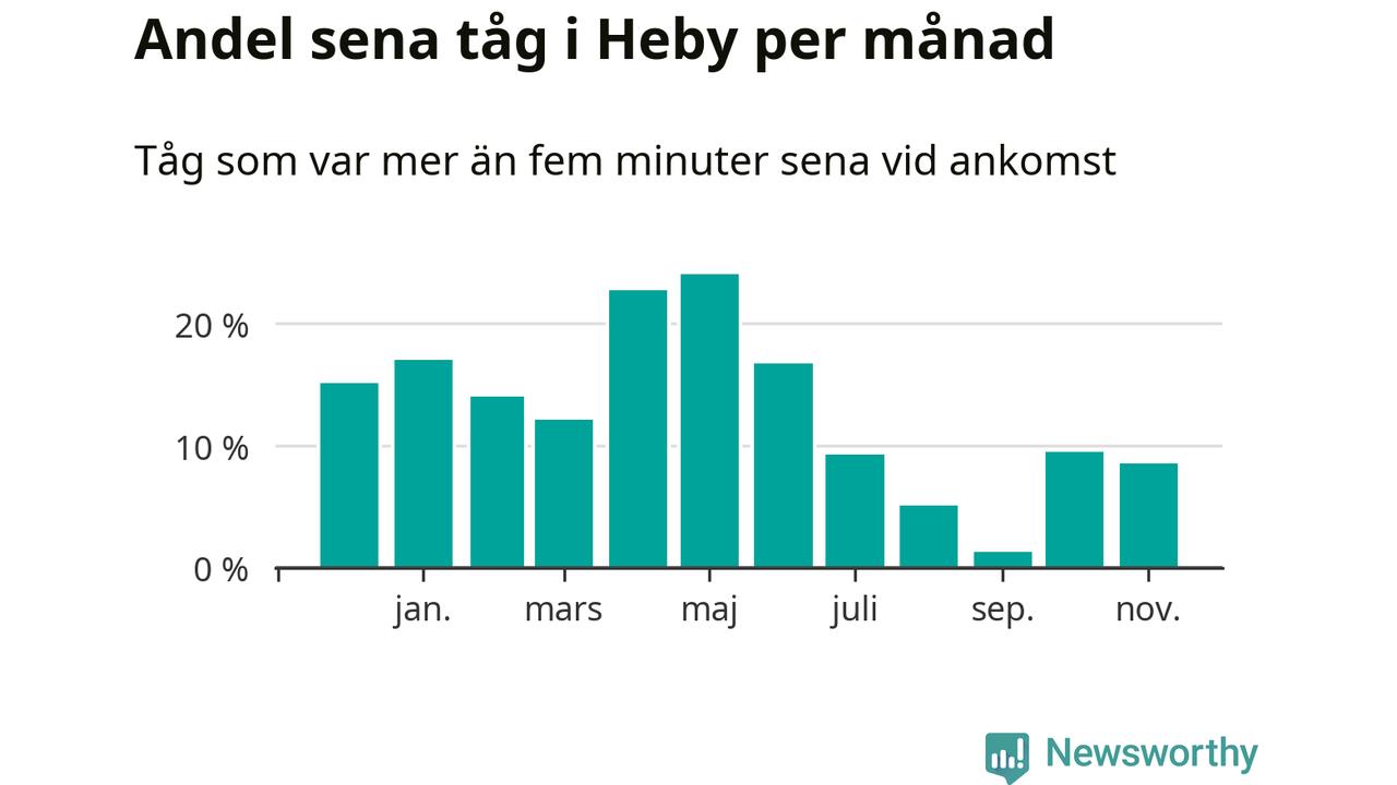 Den svenska järnvägsbranschen och Trafikverket har ett gemensamt mål om att 95 procent av tågen ska komma fram med högst fem minuters försening till sin slutstation. Tågtrafiken i Heby låg på rätt sida om den gränsen tio av 52 veckor det senaste året, även om det officiella punktlighetsmåttet (ankomst till slutstation) inte är rakt av jämförbart med det som används i den här artikeln (där vi tittar på alla tåg som passerar en station).