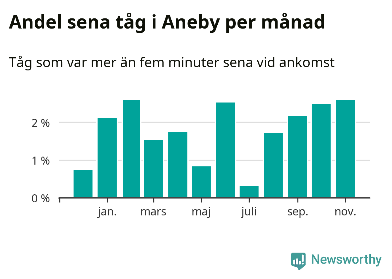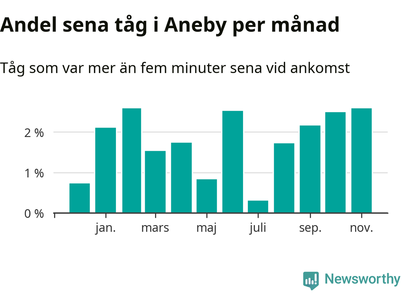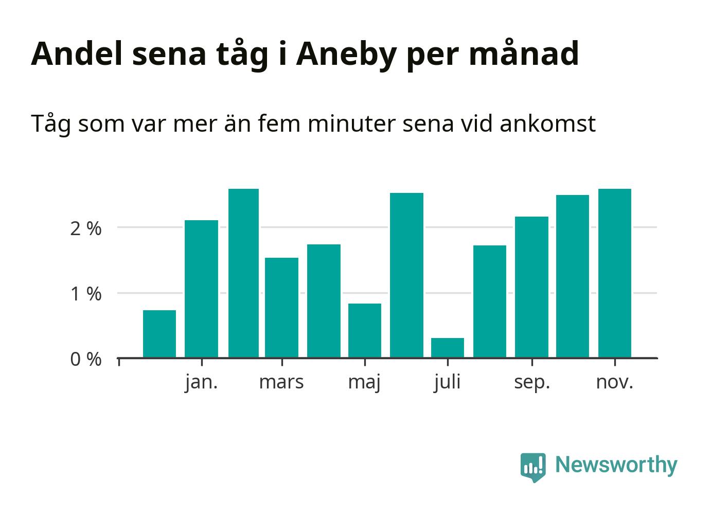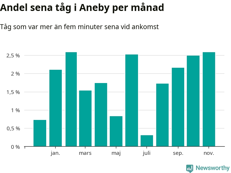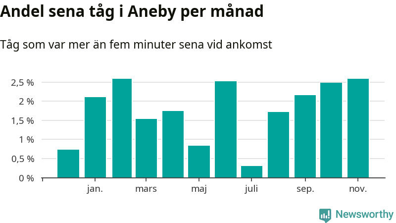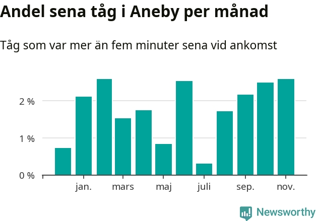 Den mest förseningsdrabbade månaden var november, med i snitt tre procent sena tåg enligt det måttet. De senaste månaderna fyra har andelen sena tåg varit på uppåtgående. Det senaste halvåret har andelen sena tåg varit högre än genomsnittet för halvåret innan dess.