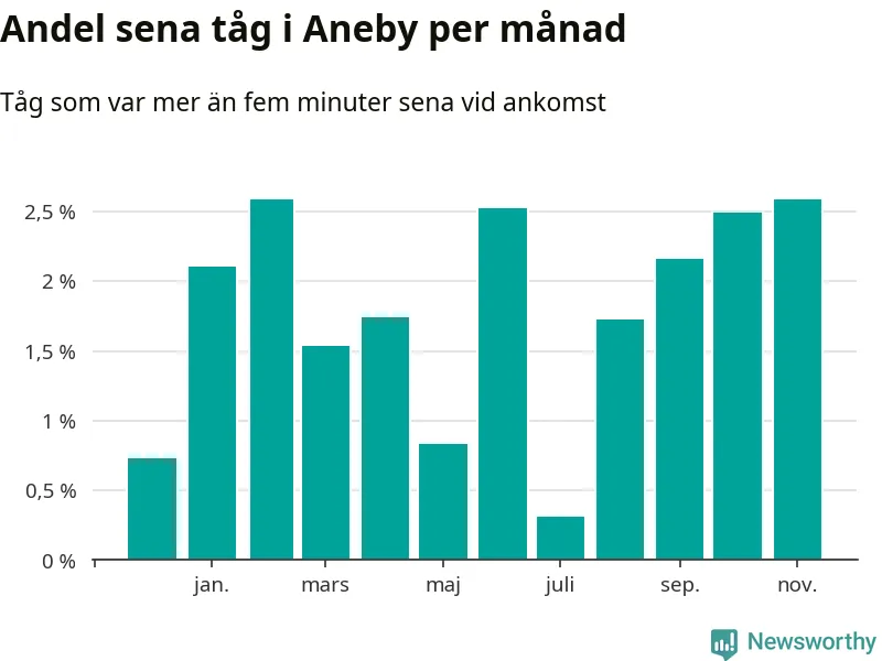 Den svenska järnvägsbranschen och Trafikverket har ett gemensamt mål om att 95 procent av tågen ska komma fram med högst fem minuters försening till sin slutstation. För Anebys del skulle man alltså kunna säga att tågtrafiken legat på rätt sida målgränsen det senaste året, även om det officiella punktlighetsmåttet (ankomst till slutstation) inte är rakt av jämförbart med det som används i den här artikeln (där vi tittar på alla tåg som passerar en station).
