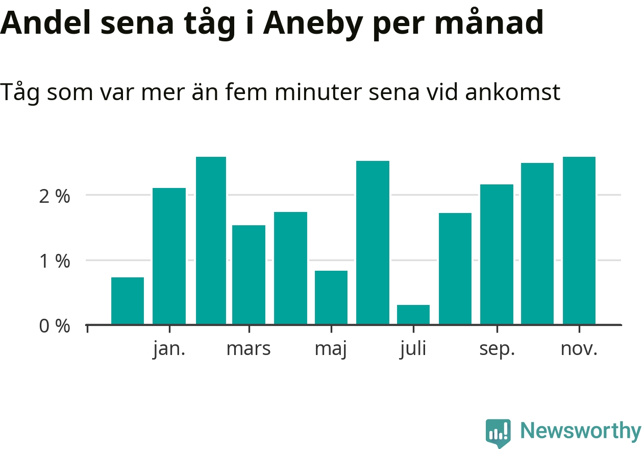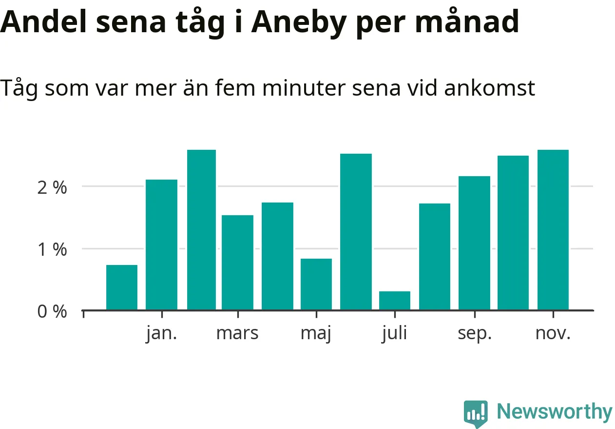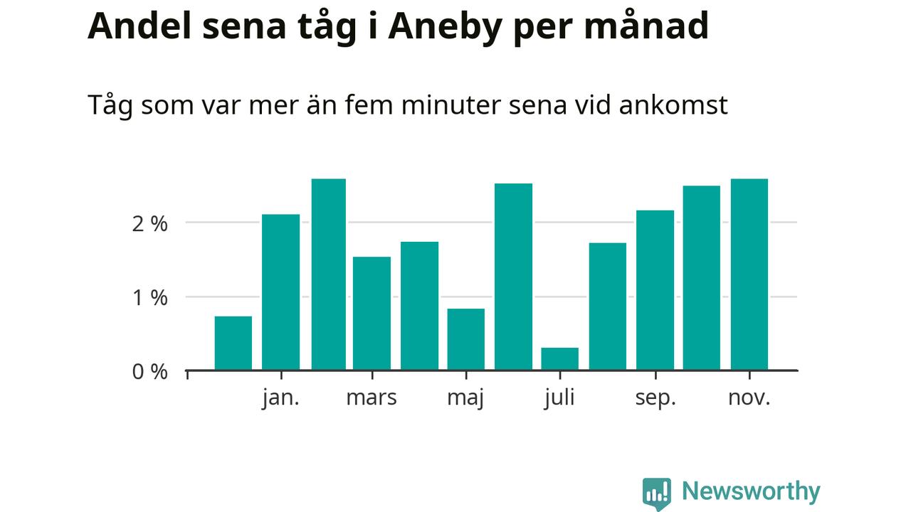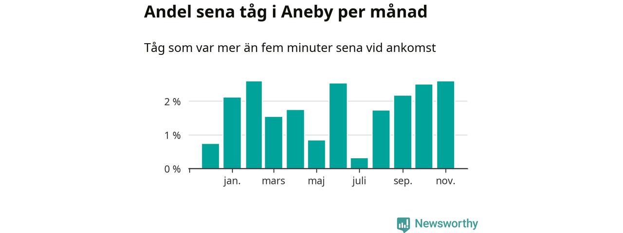 Under det senaste året har två procent av tågen varit sena när de passerat Aneby station. Ett tåg räknas här som sent om det varit mer än fem minuter efter tidtabellen.1