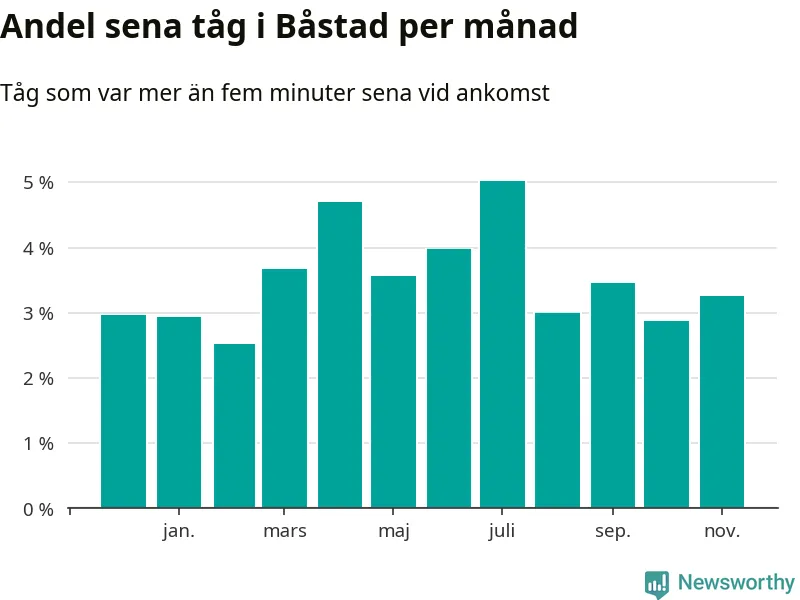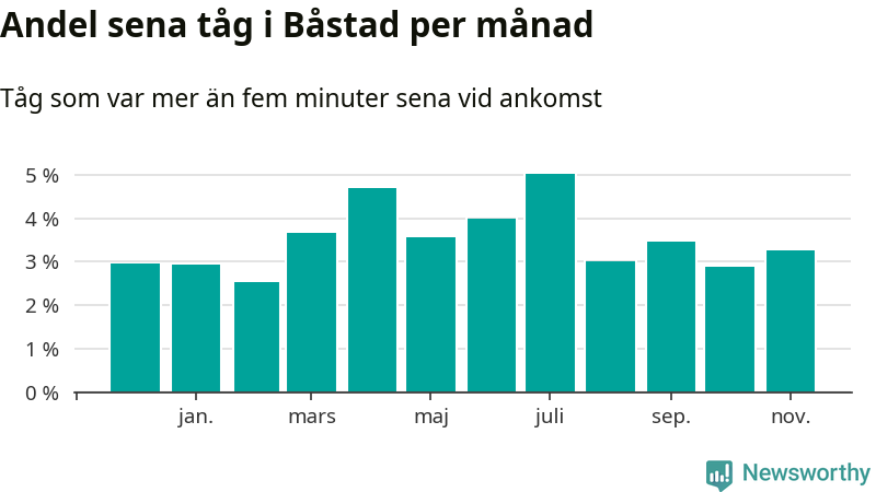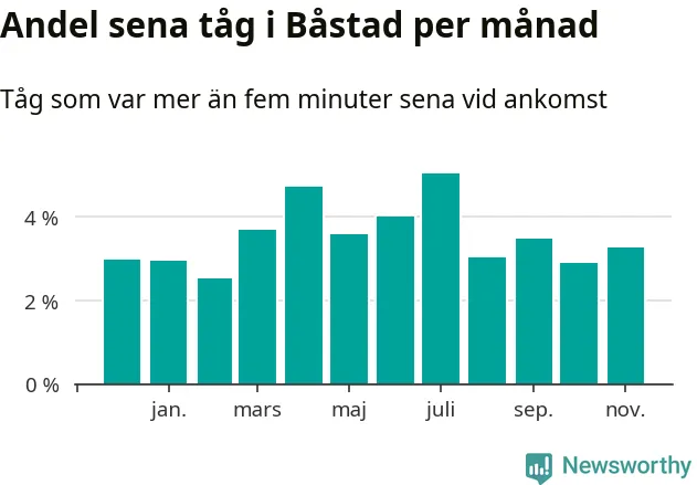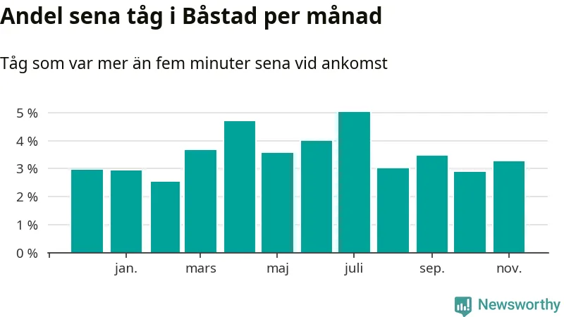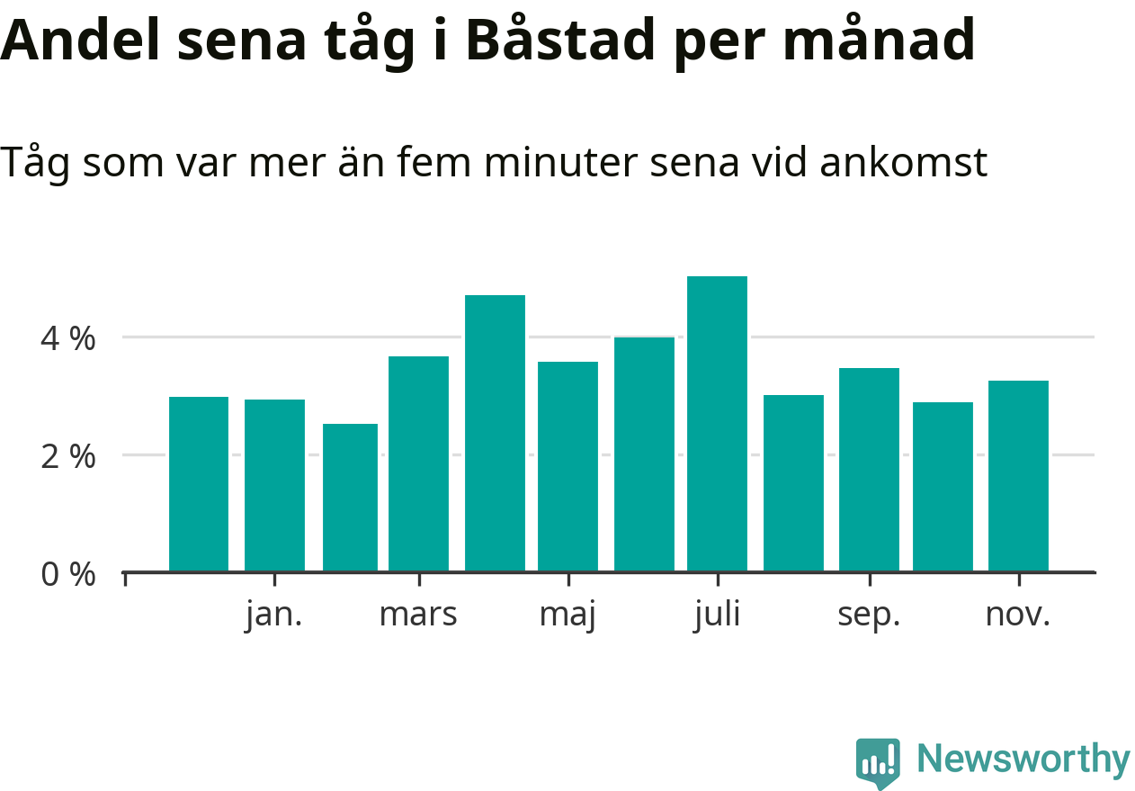 Den mest förseningsdrabbade månaden var juli, med i snitt fem procent sena tåg enligt det måttet.