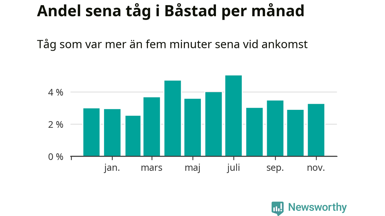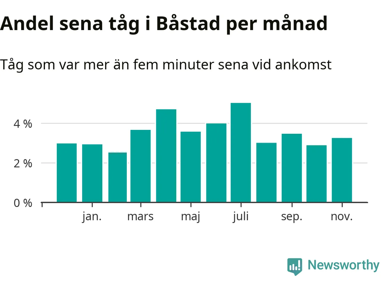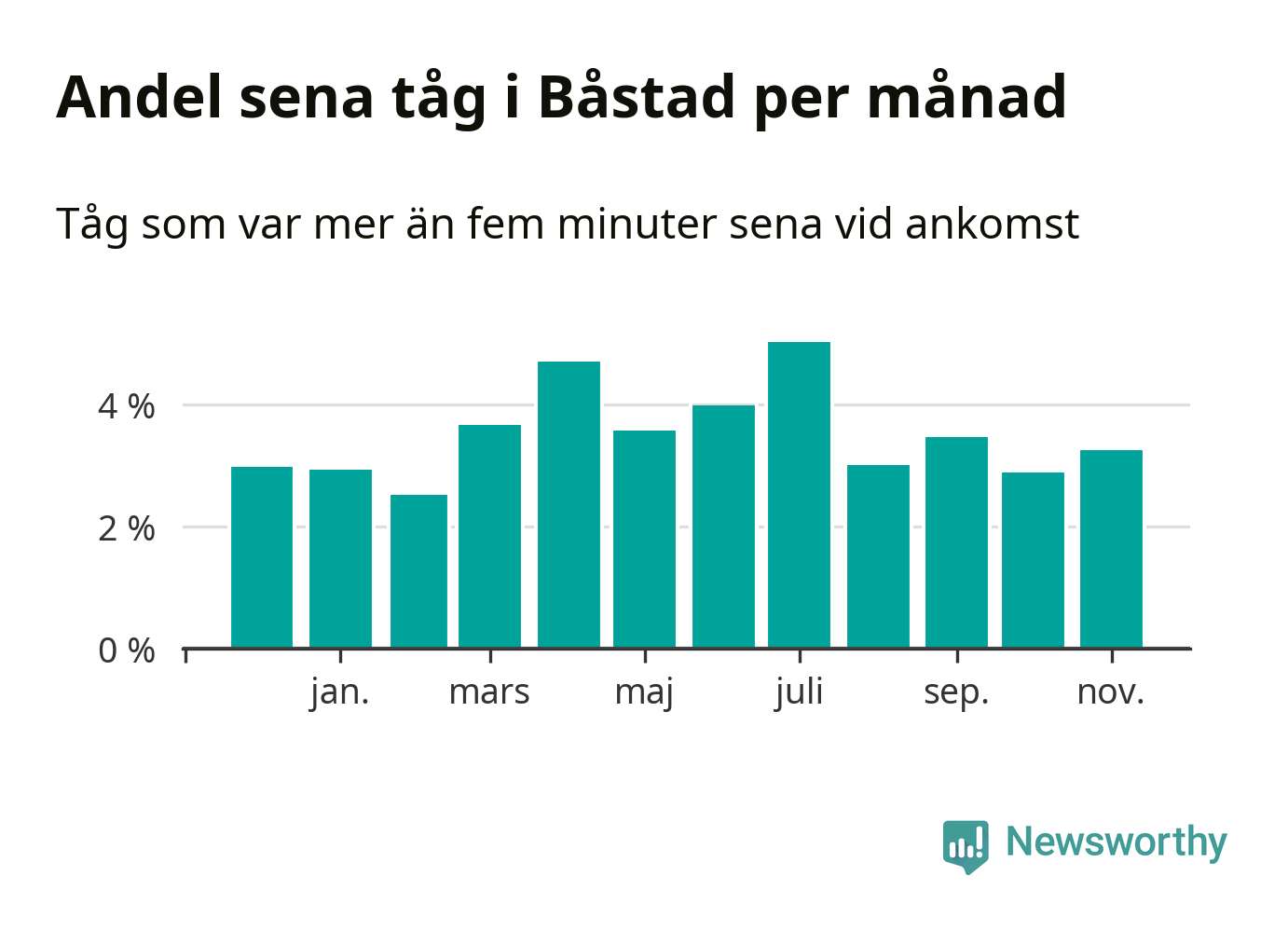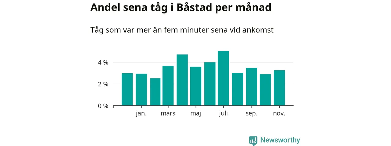 Under det senaste året har tre procent av tågen varit sena när de passerat Båstad eller Förslöv i Båstads kommun. Ett tåg räknas här som sent om det varit mer än fem minuter efter tidtabellen.1