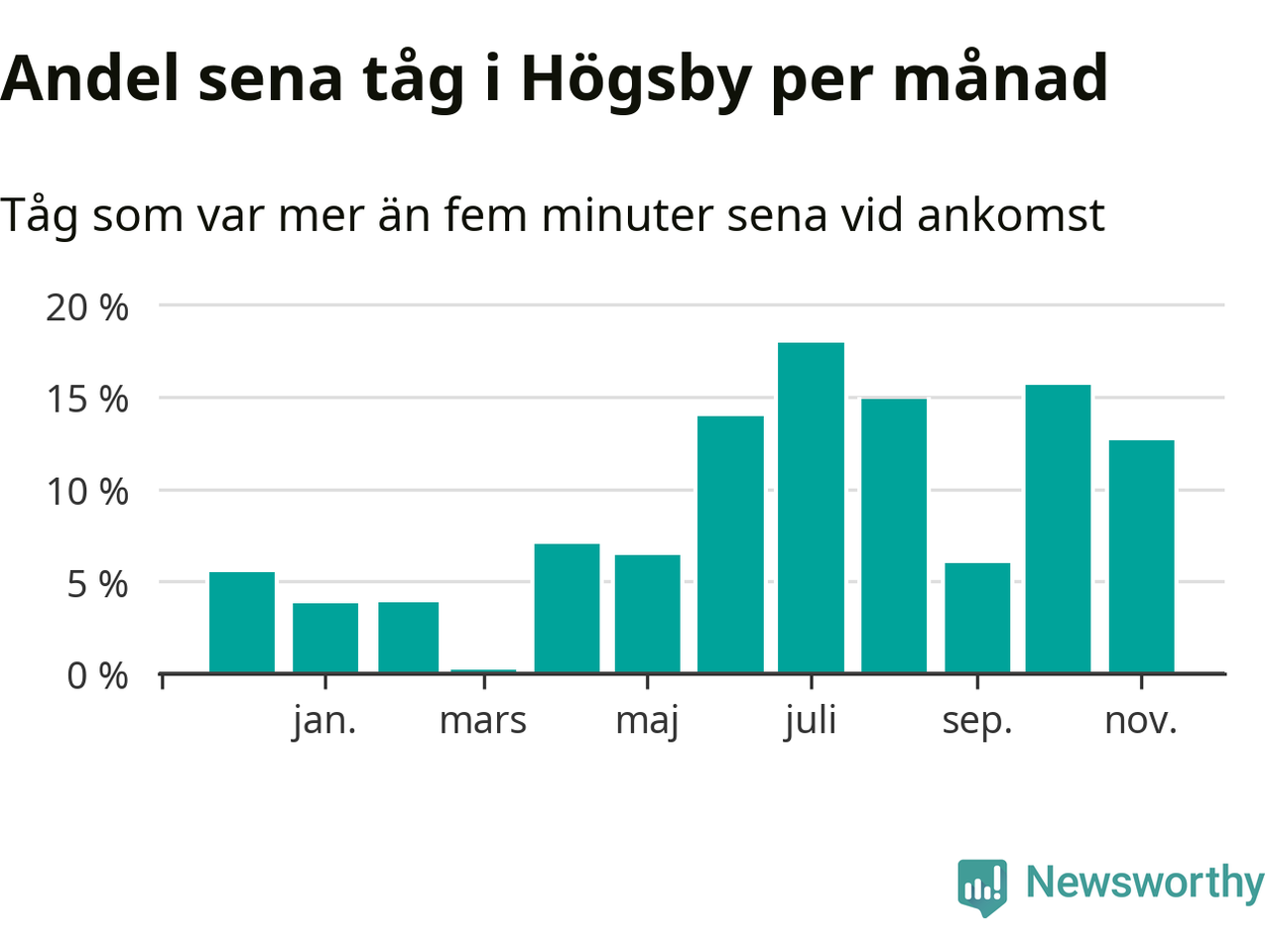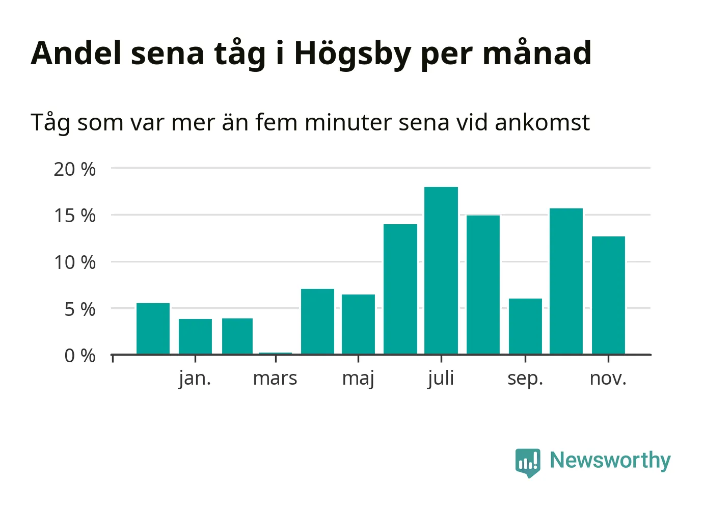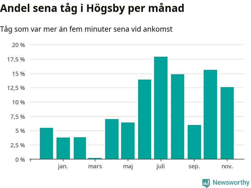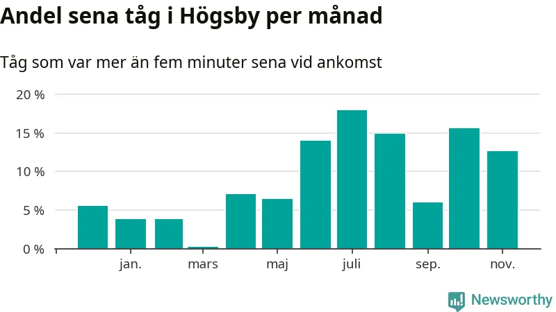 Den mest förseningsdrabbade månaden var juli, med i snitt 18 procent sena tåg enligt det måttet. Det senaste halvåret har andelen sena tåg varit högre än genomsnittet för halvåret innan dess.