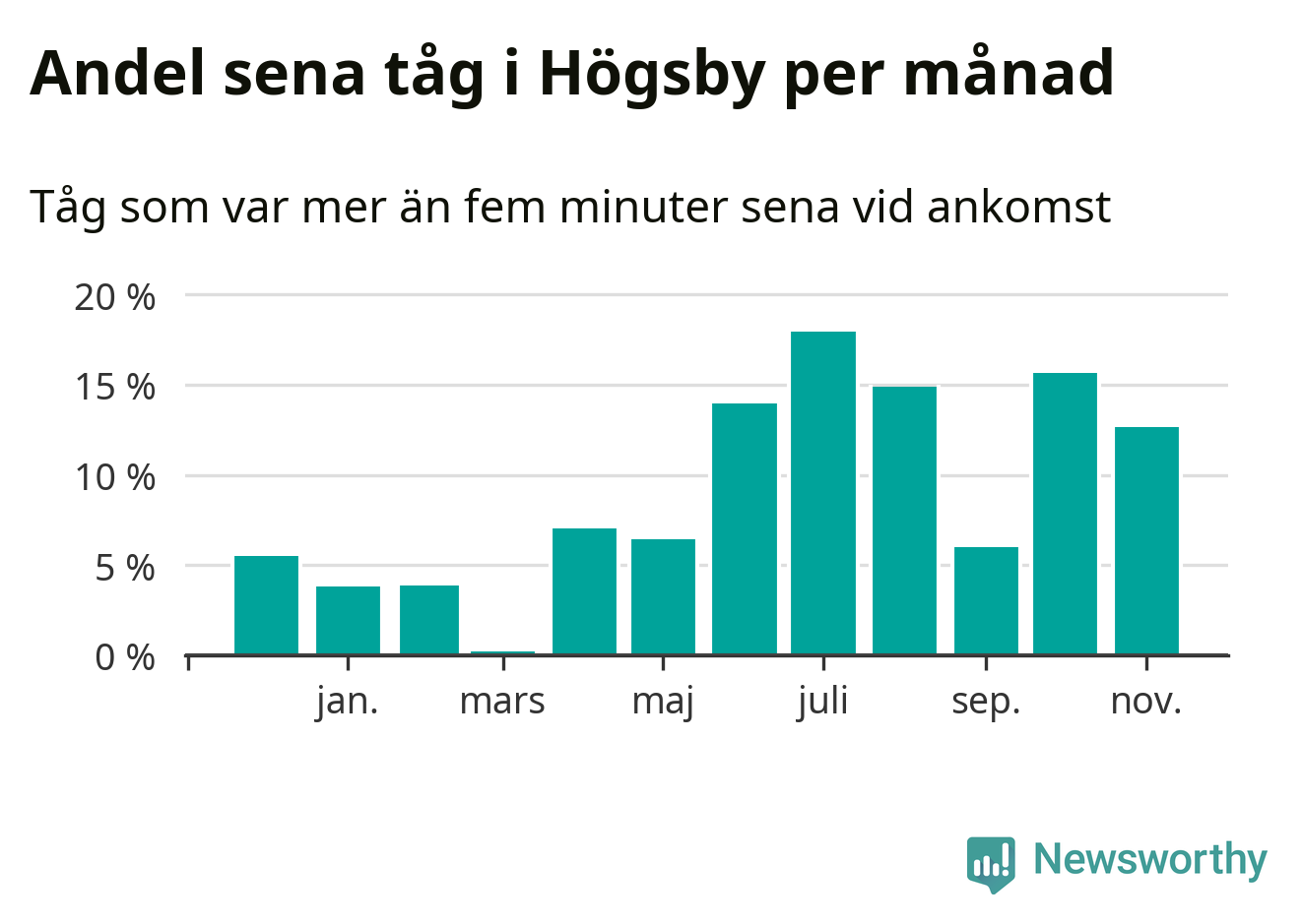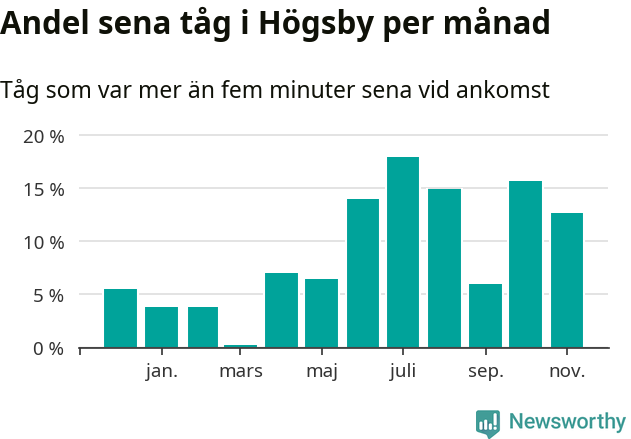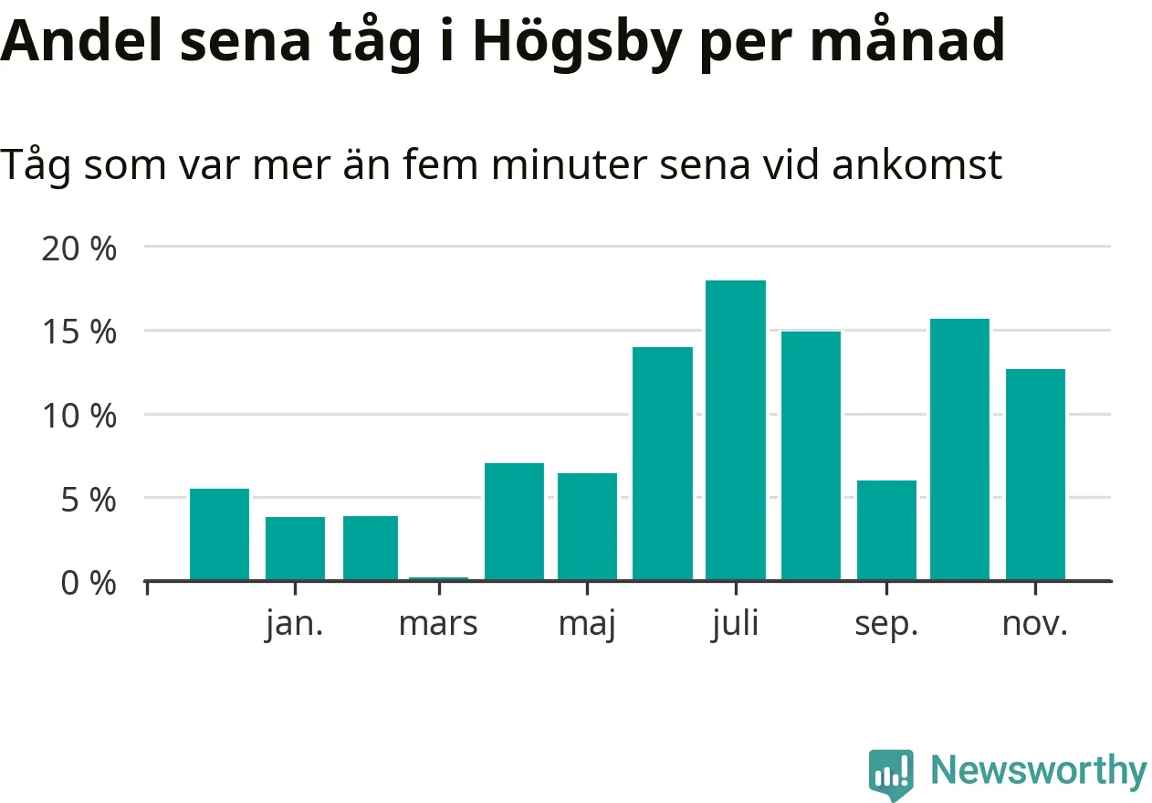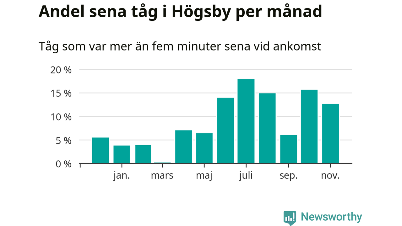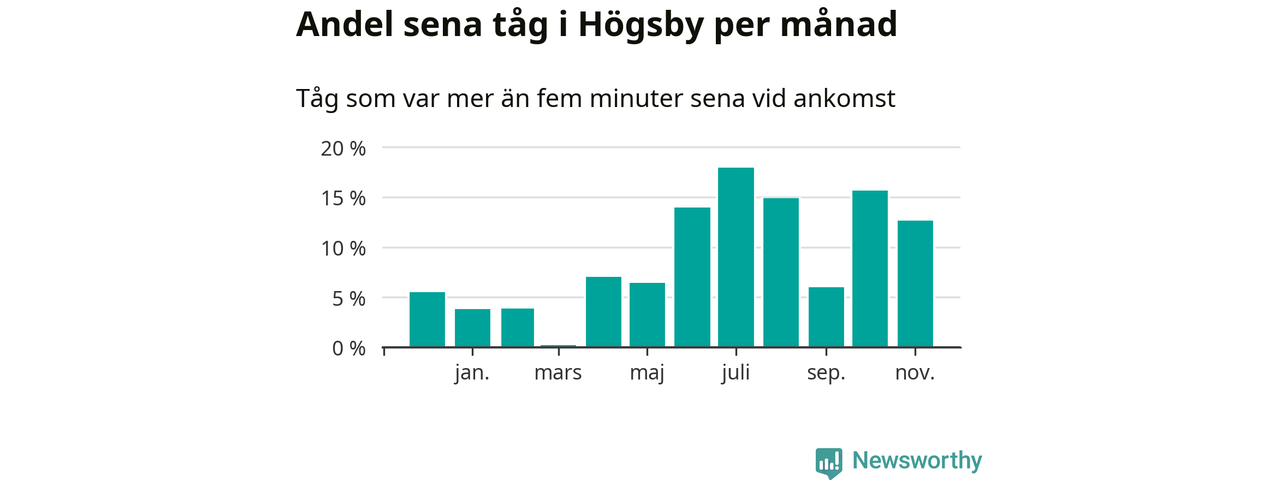 Den svenska järnvägsbranschen och Trafikverket har ett gemensamt mål om att 95 procent av tågen ska komma fram med högst fem minuters försening till sin slutstation. Tågtrafiken i Högsby låg på rätt sida om den gränsen 19 av 52 veckor det senaste året, även om det officiella punktlighetsmåttet (ankomst till slutstation) inte är rakt av jämförbart med det som används i den här artikeln (där vi tittar på alla tåg som passerar en station).