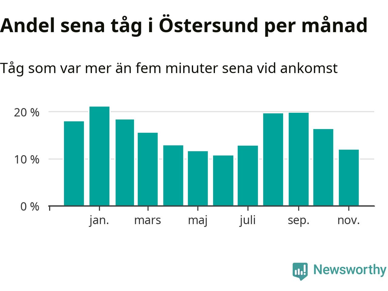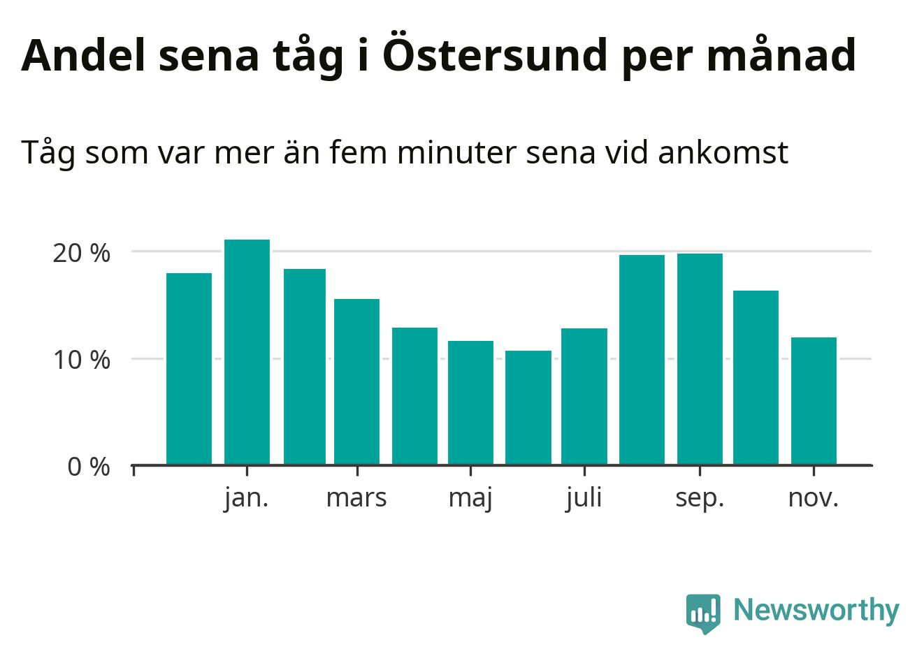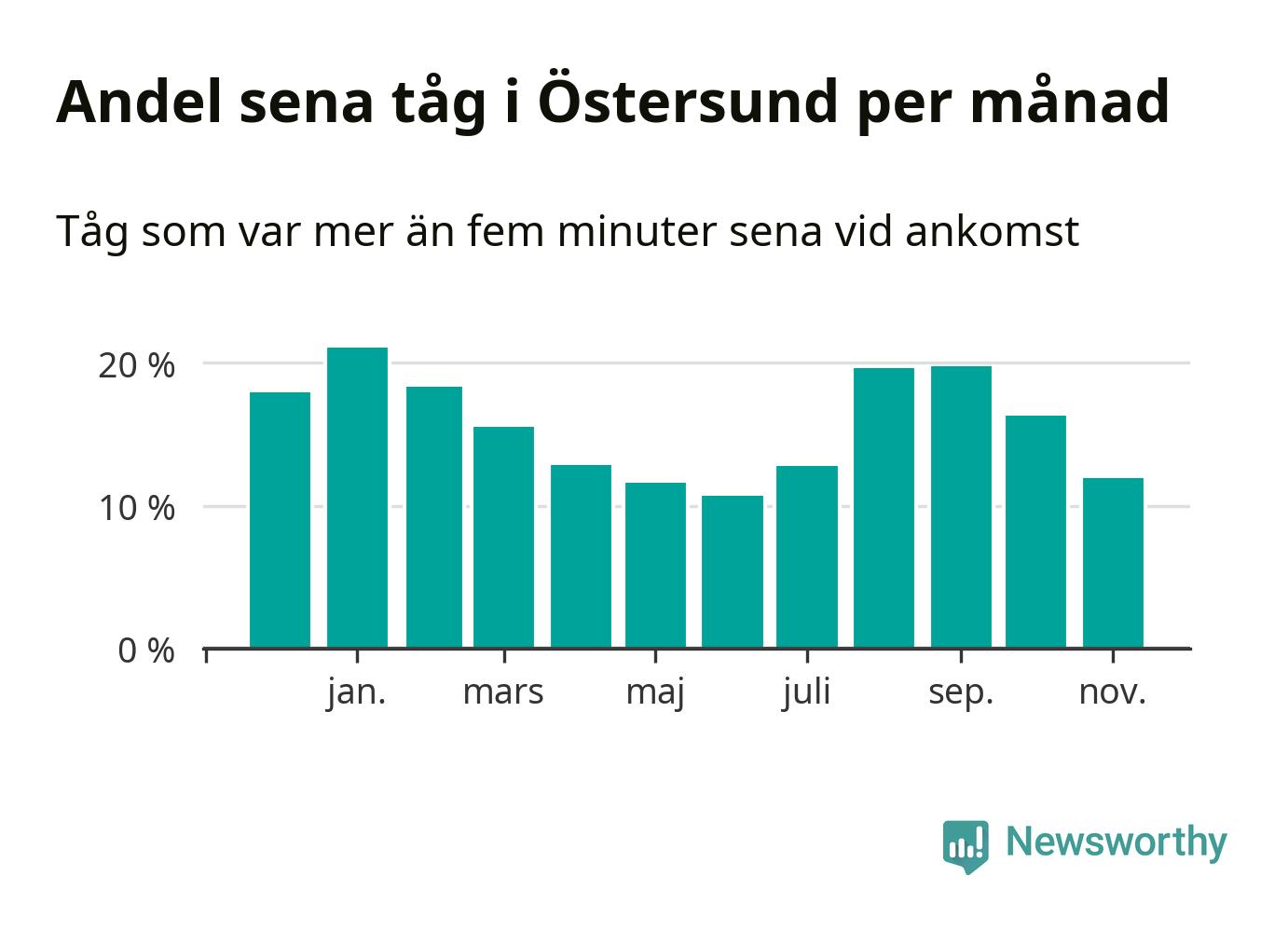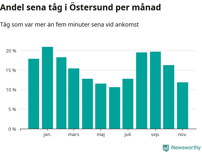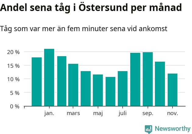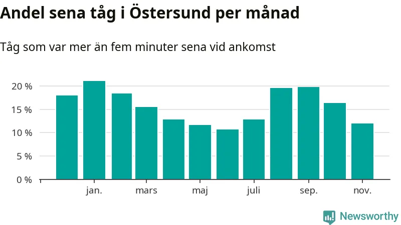 Den mest förseningsdrabbade månaden var januari, med i snitt 21 procent sena tåg enligt det måttet.