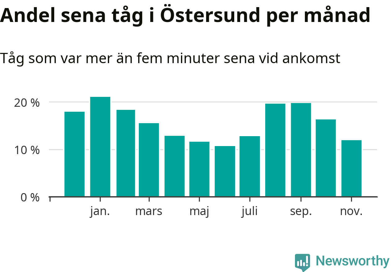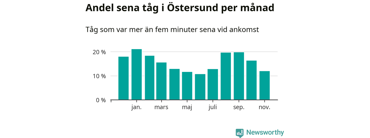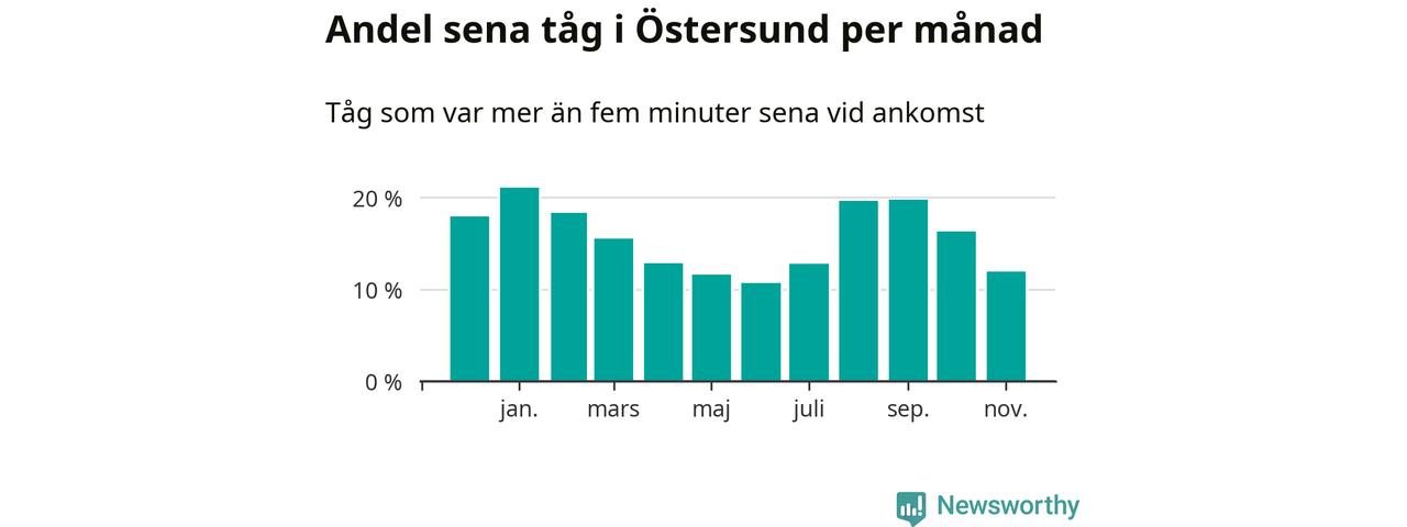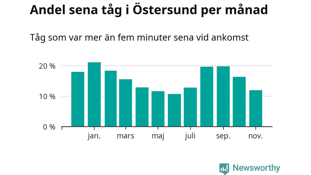 Under det senaste året har 16 procent av tågen varit sena när de passerat Brunflo, Östersund C eller Östersund V i Östersunds kommun. Ett tåg räknas här som sent om det varit mer än fem minuter efter tidtabellen.1
