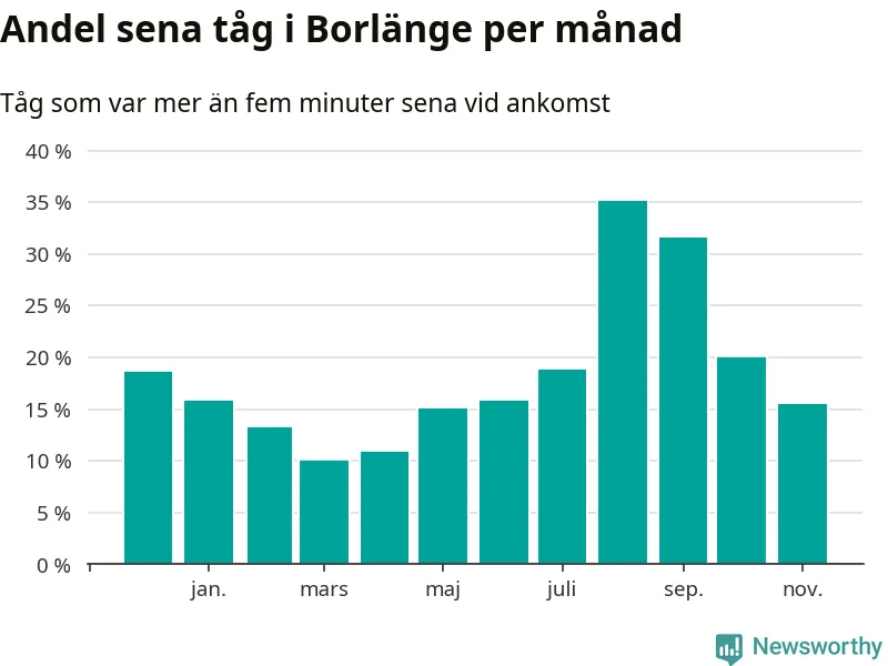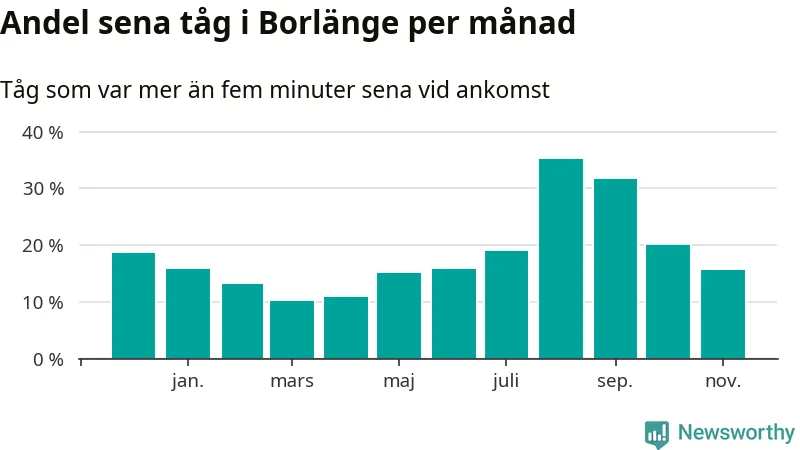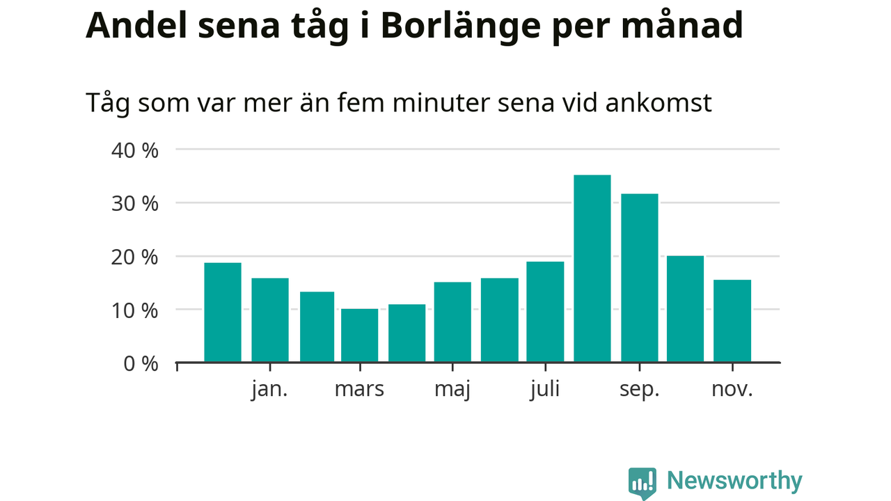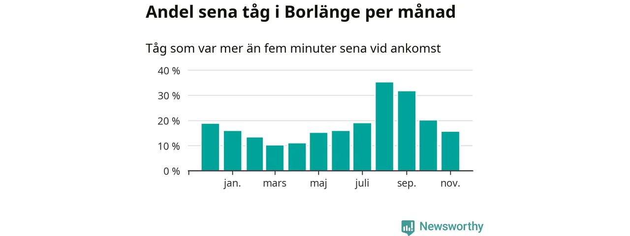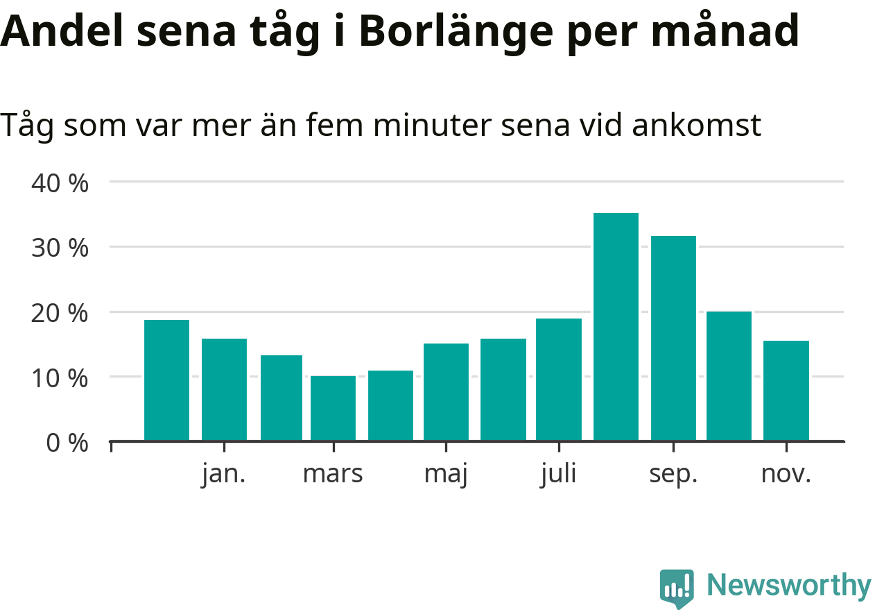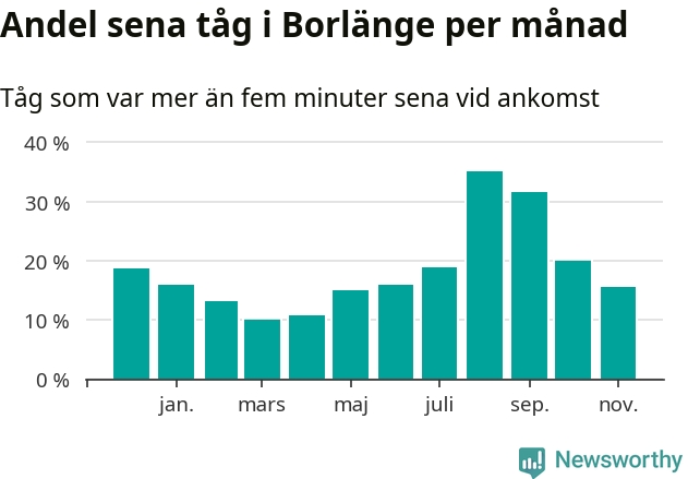 Den mest förseningsdrabbade månaden var augusti, med i snitt 35 procent sena tåg enligt det måttet. Men de senaste tre månaderna har andelen sena tåg varit på nedåtgående sedan augustitoppen. Det senaste halvåret har andelen sena tåg varit högre än genomsnittet för halvåret innan dess. Sommartrafiken på Dalabanan påverkades stort av banarbeten i Borlänge under juli och augusti. Statistiken för de månaderna bygger på färre tåg, eftersom passagerartrafiken var ersatt av buss stora delar av den perioden.
