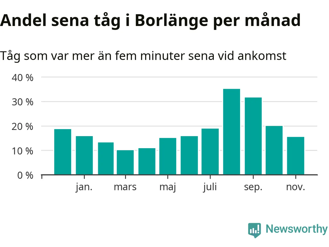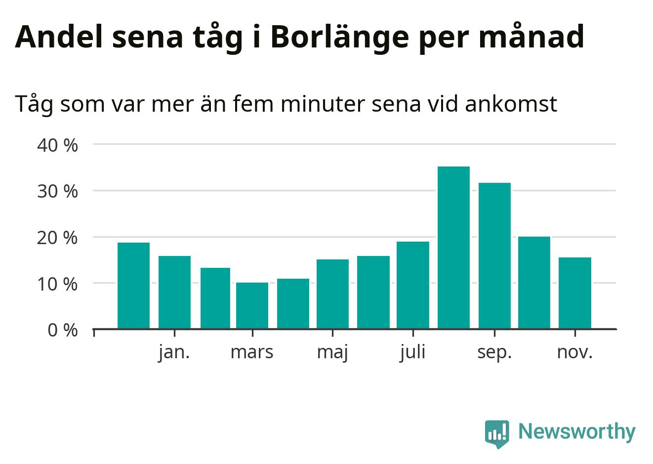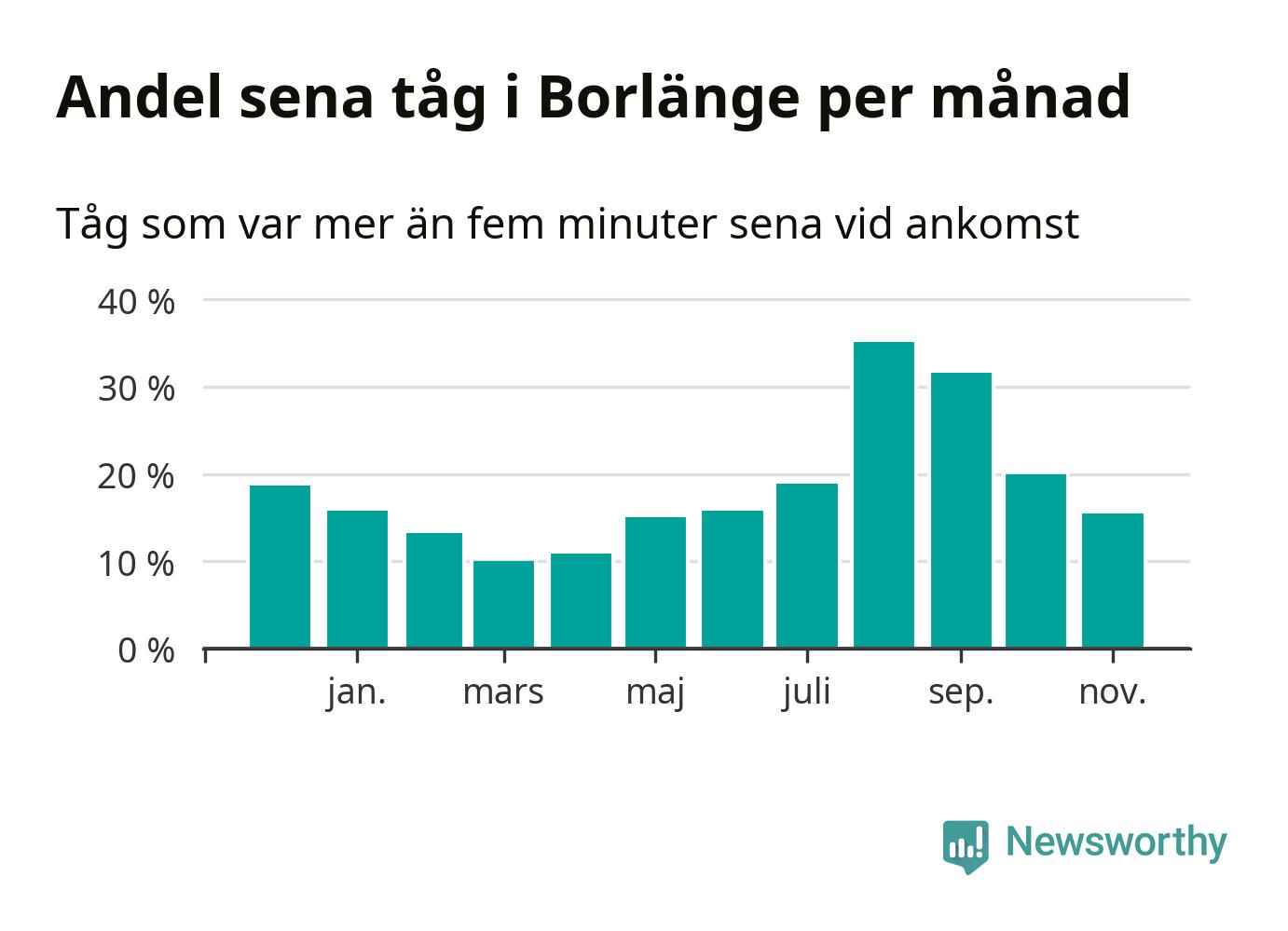 Den mest förseningsdrabbade månaden var augusti, med i snitt 35 procent sena tåg enligt det måttet. Men de senaste tre månaderna har andelen sena tåg varit på nedåtgående sedan augustitoppen. Det senaste halvåret har andelen sena tåg varit högre än genomsnittet för halvåret innan dess. Sommartrafiken på Dalabanan påverkades stort av banarbeten i Borlänge under juli och augusti. Statistiken för de månaderna bygger på färre tåg, eftersom passagerartrafiken var ersatt av buss stora delar av den perioden.
