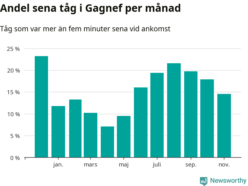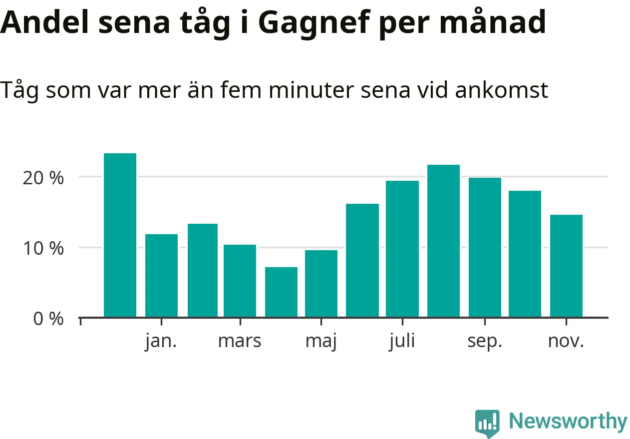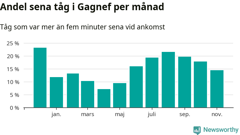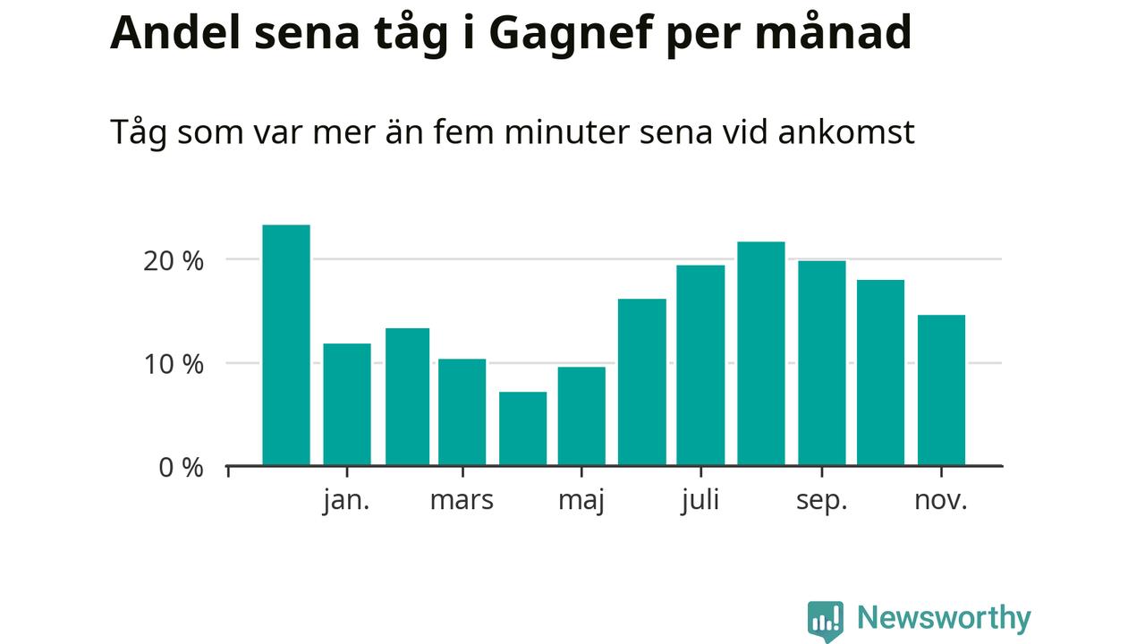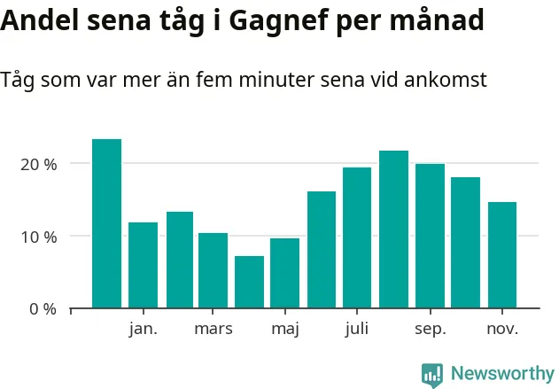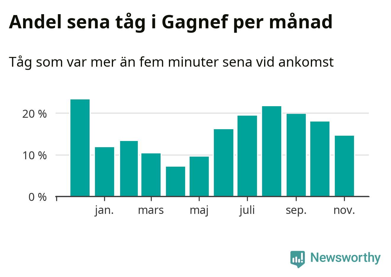 Den mest förseningsdrabbade månaden var december 2024, med i snitt 23 procent sena tåg enligt det måttet. Men de senaste tre månaderna har andelen sena tåg varit på nedåtgående. Det senaste halvåret har andelen sena tåg varit högre än genomsnittet för halvåret innan dess. Sommartrafiken på Dalabanan påverkades stort av banarbeten i Borlänge under juli och augusti. Statistiken för de månaderna bygger på färre tåg, eftersom passagerartrafiken var ersatt av buss stora delar av den perioden.