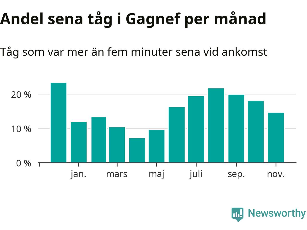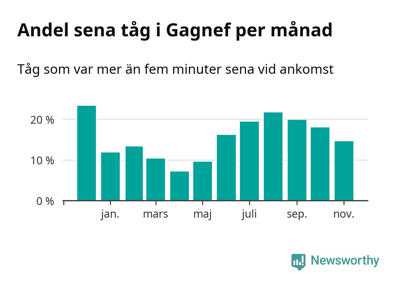 Den svenska järnvägsbranschen och Trafikverket har ett gemensamt mål om att 95 procent av tågen ska komma fram med högst fem minuters försening till sin slutstation. Dit är det alltså långt i Gagnef, även om det officiella punktlighetsmåttet (ankomst till slutstation) inte är rakt av jämförbart med det som används i den här artikeln (där vi tittar på alla tåg som passerar en station).