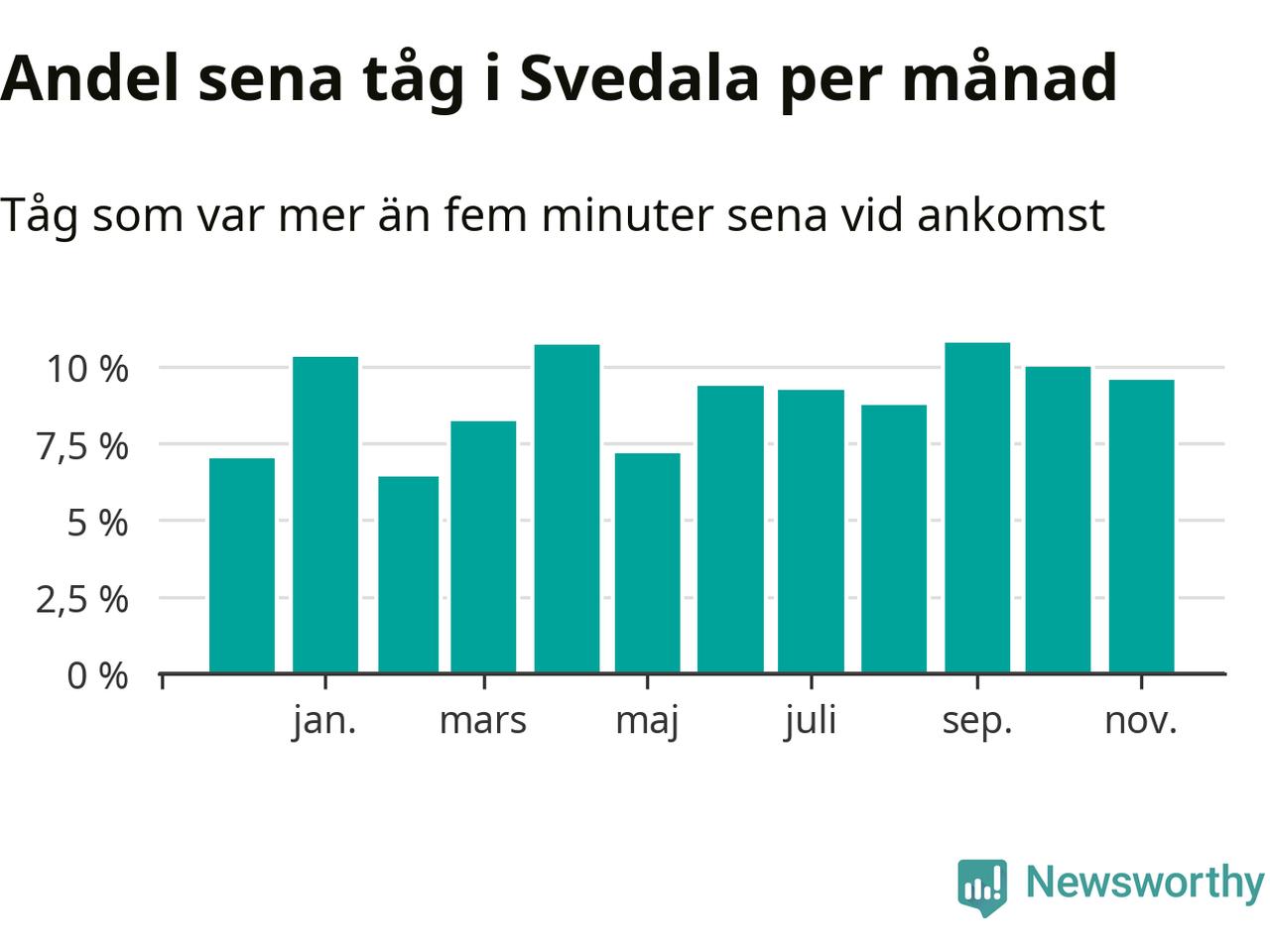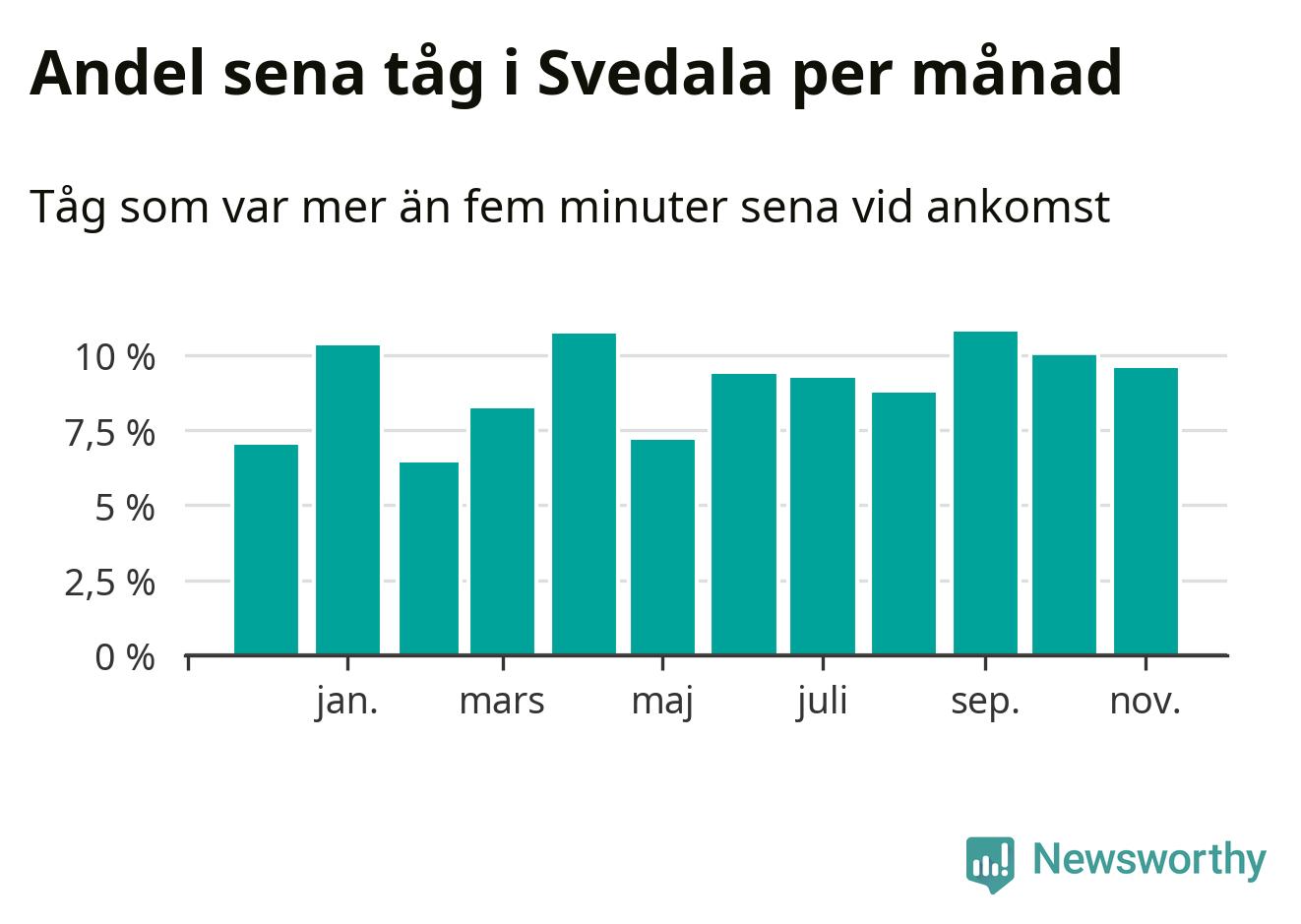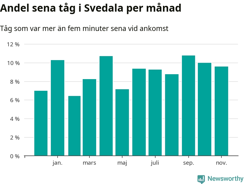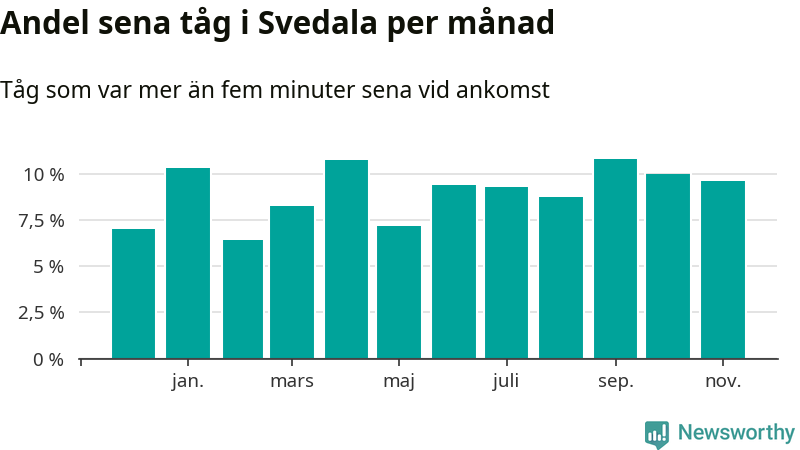 Den mest förseningsdrabbade månaden var september, med i snitt elva procent sena tåg enligt det måttet. Det senaste halvåret har andelen sena tåg varit högre än genomsnittet för halvåret innan dess.