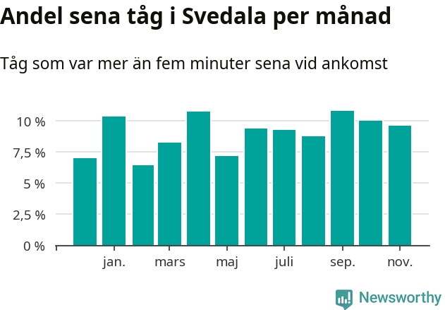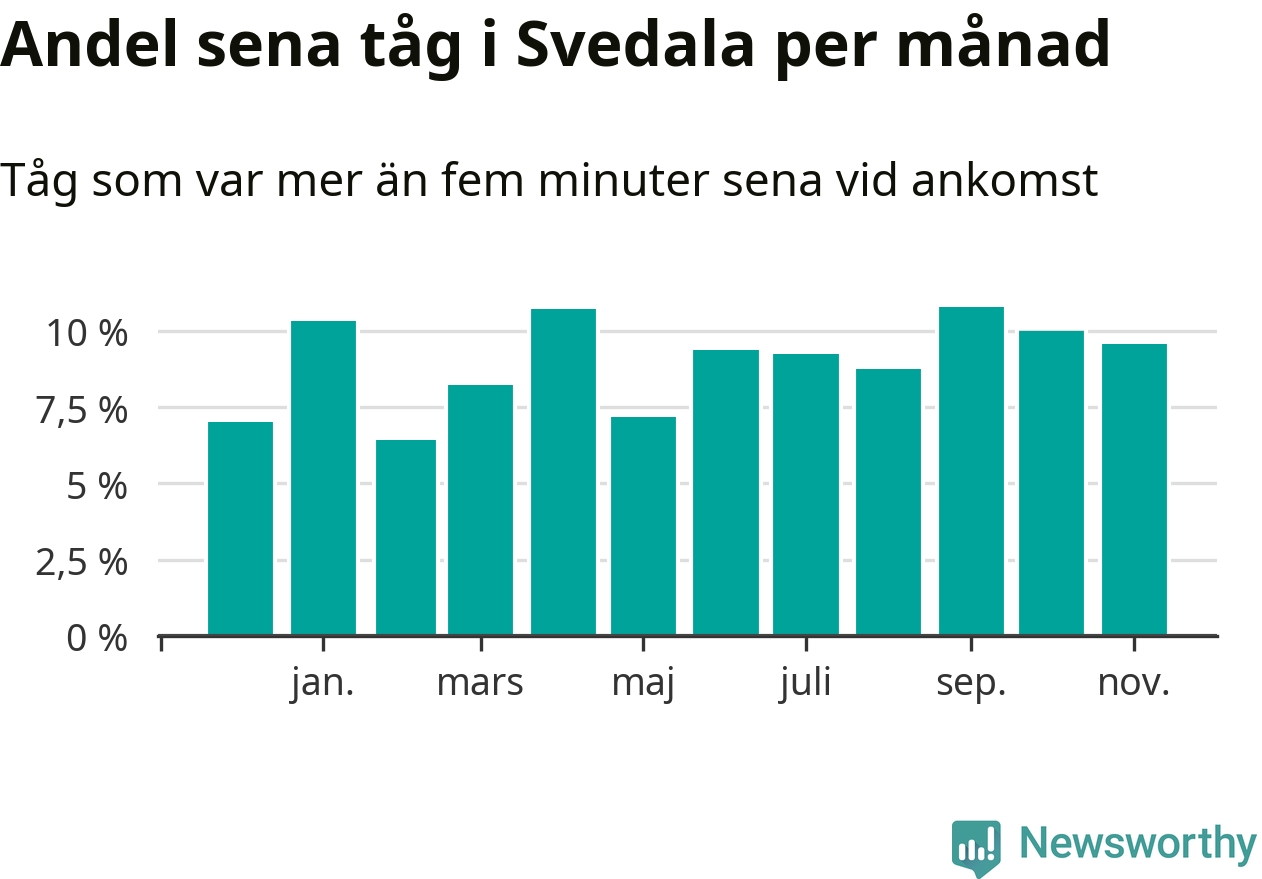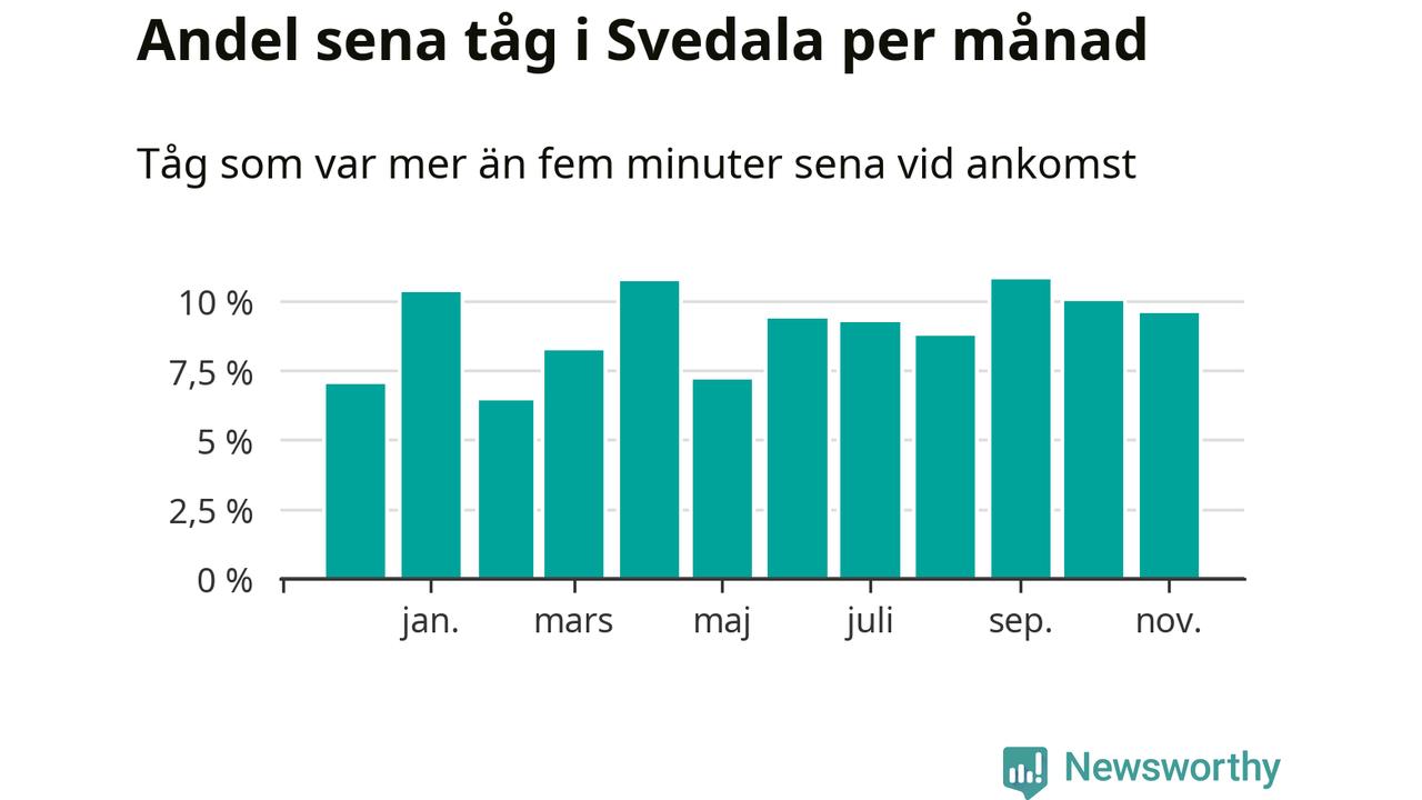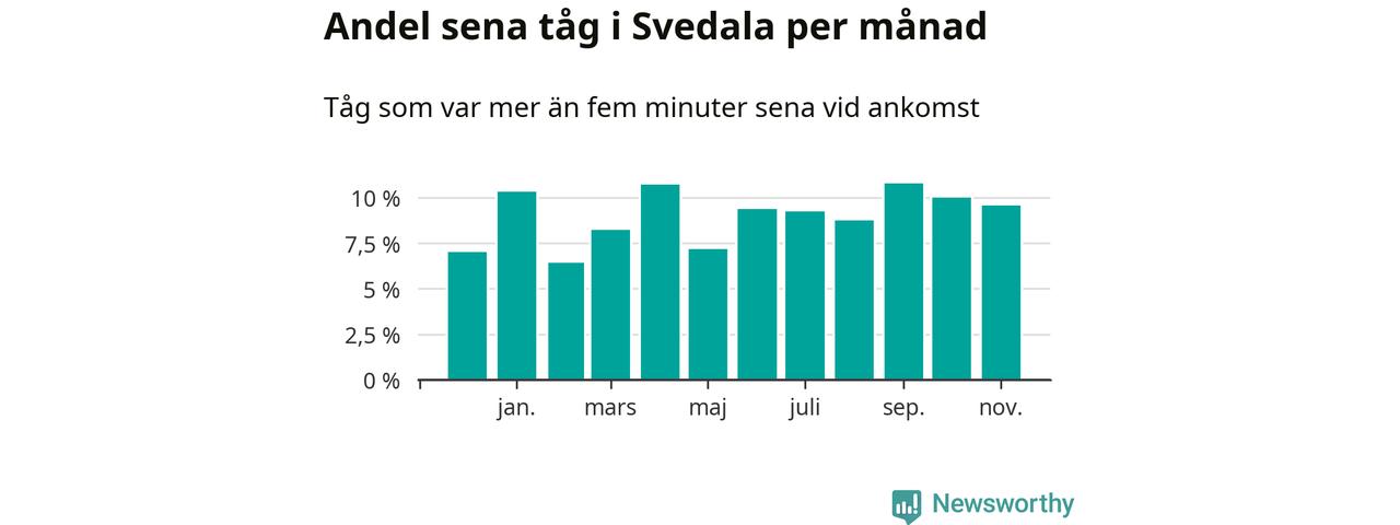 Den svenska järnvägsbranschen och Trafikverket har ett gemensamt mål om att 95 procent av tågen ska komma fram med högst fem minuters försening till sin slutstation. Tågtrafiken vid Svedala station låg på rätt sida om den gränsen fem av 52 veckor det senaste året, även om det officiella punktlighetsmåttet (ankomst till slutstation) inte är rakt av jämförbart med det som används i den här artikeln (där vi tittar på alla tåg som passerar en station).