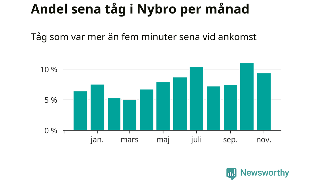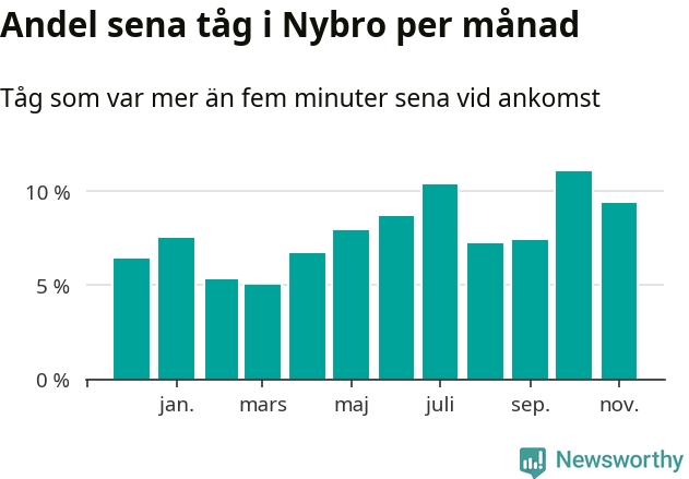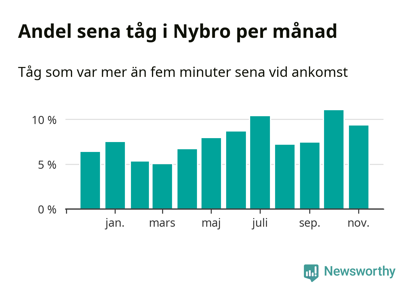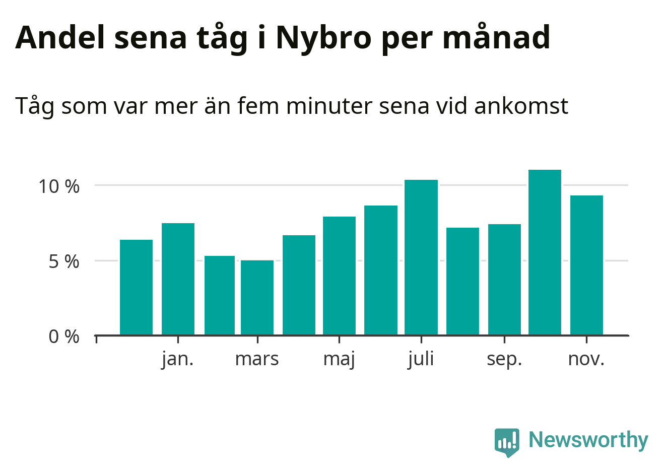 Den svenska järnvägsbranschen och Trafikverket har ett gemensamt mål om att 95 procent av tågen ska komma fram med högst fem minuters försening till sin slutstation. Tågtrafiken i Nybro låg på rätt sida om den gränsen tio av 52 veckor det senaste året, även om det officiella punktlighetsmåttet (ankomst till slutstation) inte är rakt av jämförbart med det som används i den här artikeln (där vi tittar på alla tåg som passerar en station).