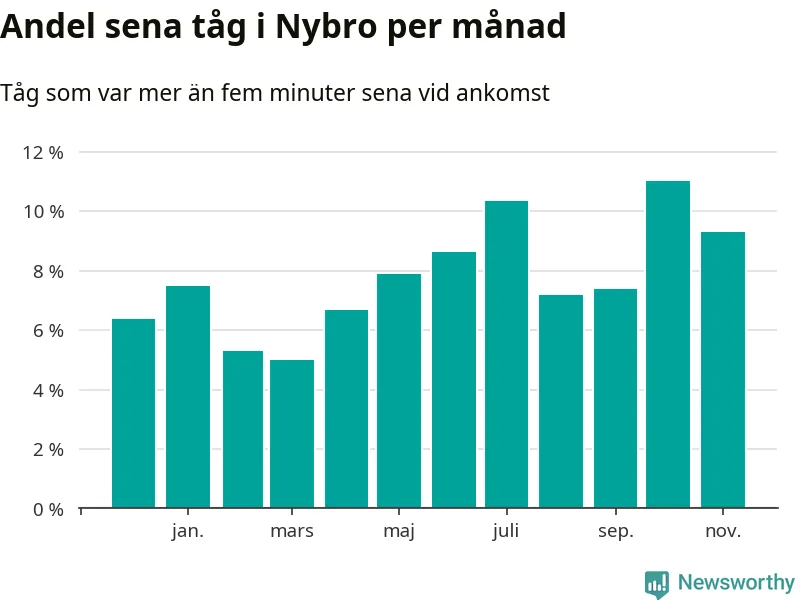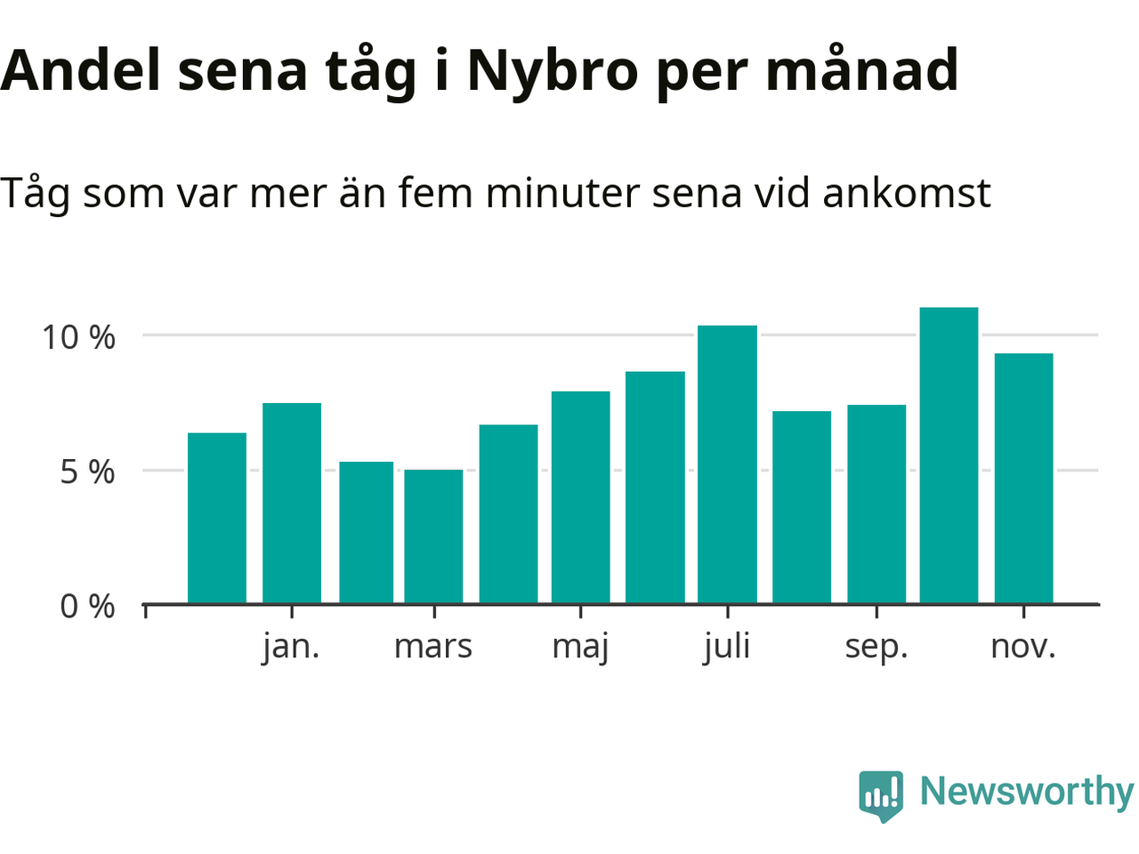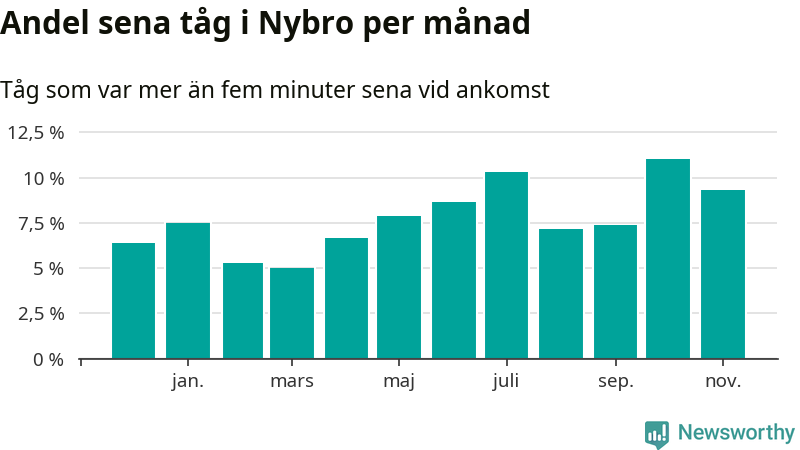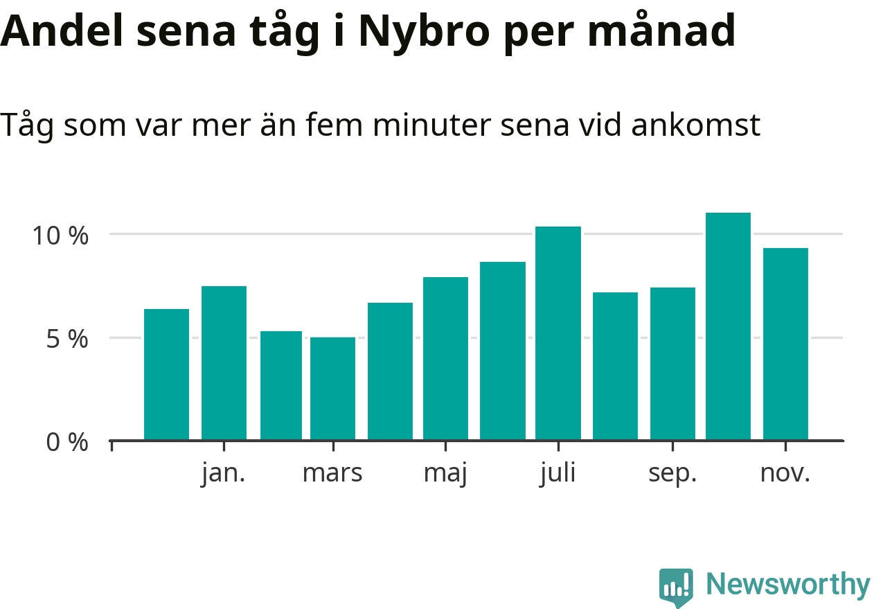 Den svenska järnvägsbranschen och Trafikverket har ett gemensamt mål om att 95 procent av tågen ska komma fram med högst fem minuters försening till sin slutstation. Tågtrafiken i Nybro låg på rätt sida om den gränsen tio av 52 veckor det senaste året, även om det officiella punktlighetsmåttet (ankomst till slutstation) inte är rakt av jämförbart med det som används i den här artikeln (där vi tittar på alla tåg som passerar en station).