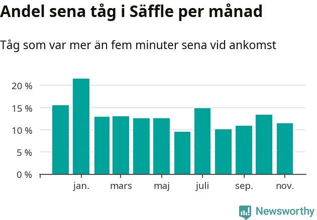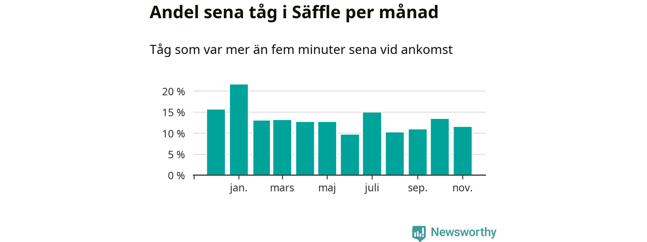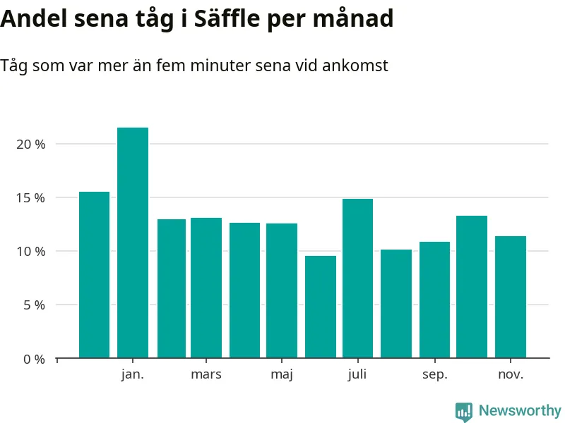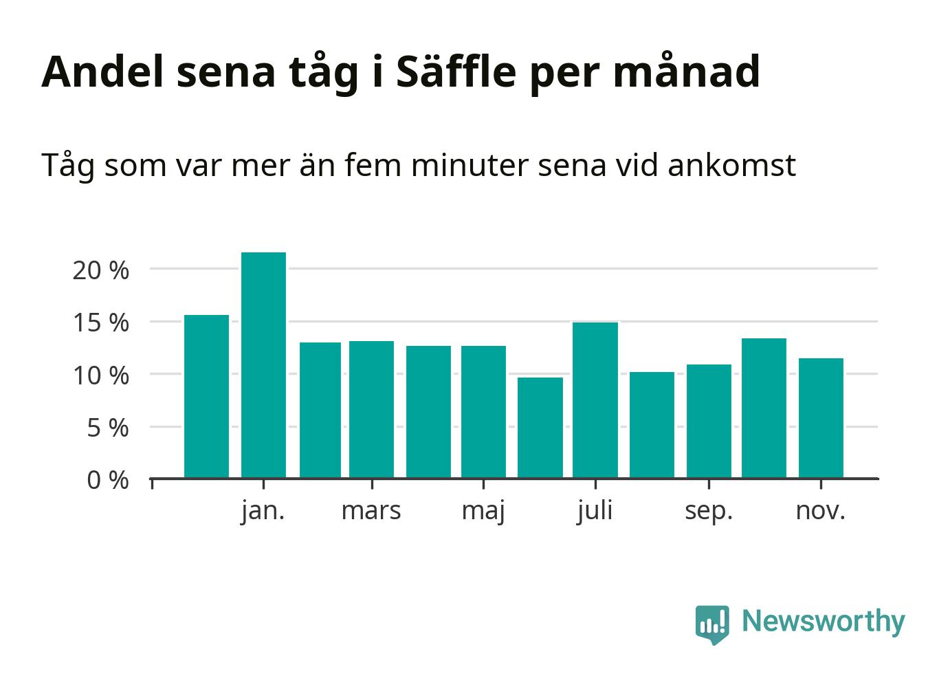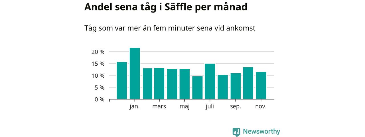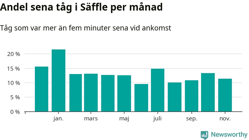 Den mest förseningsdrabbade månaden var januari, med i snitt 22 procent sena tåg enligt det måttet. Det senaste halvåret har andelen sena tåg varit lägre än halvåret innan dess.