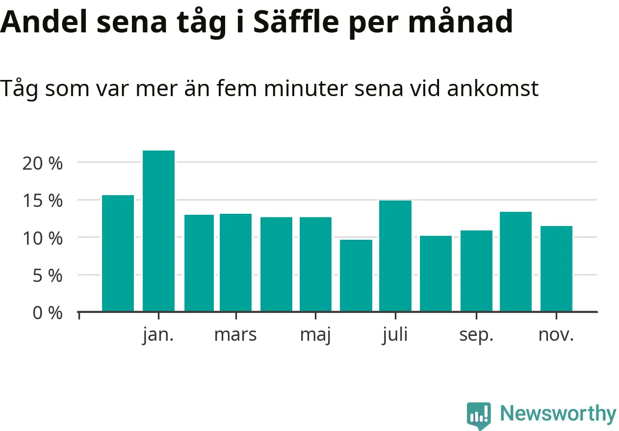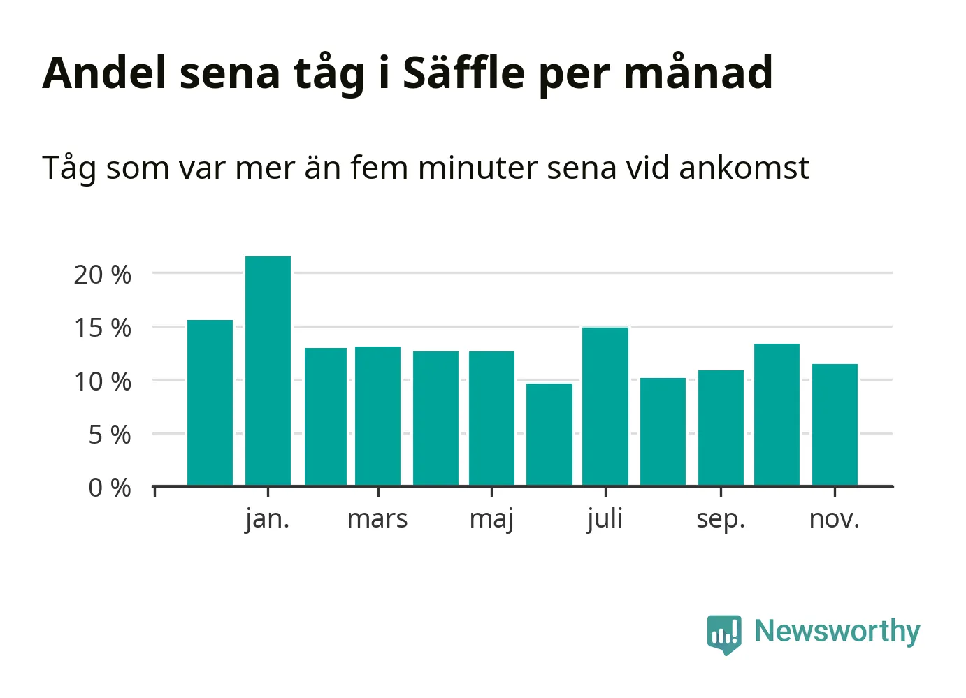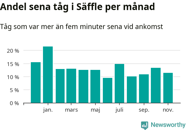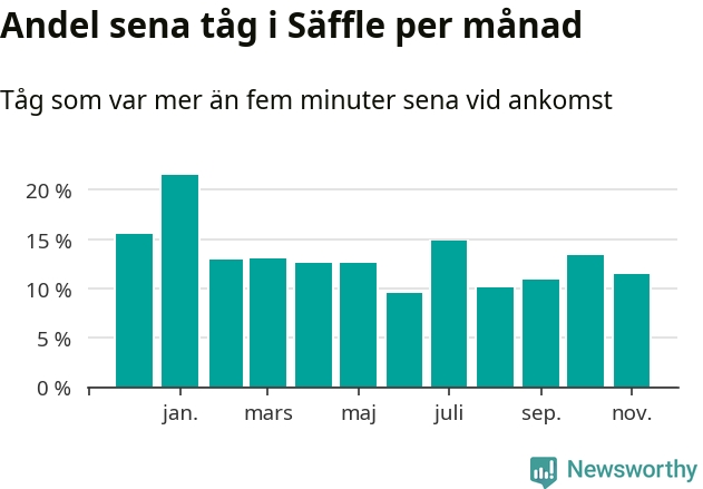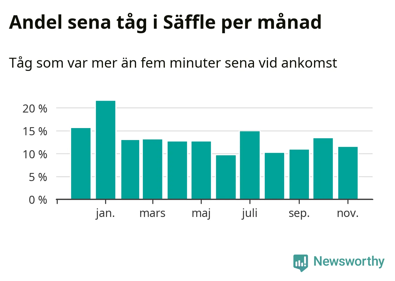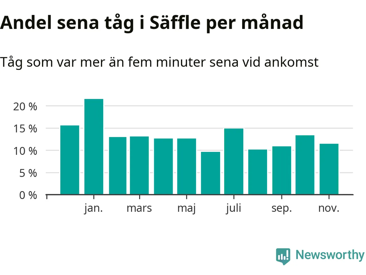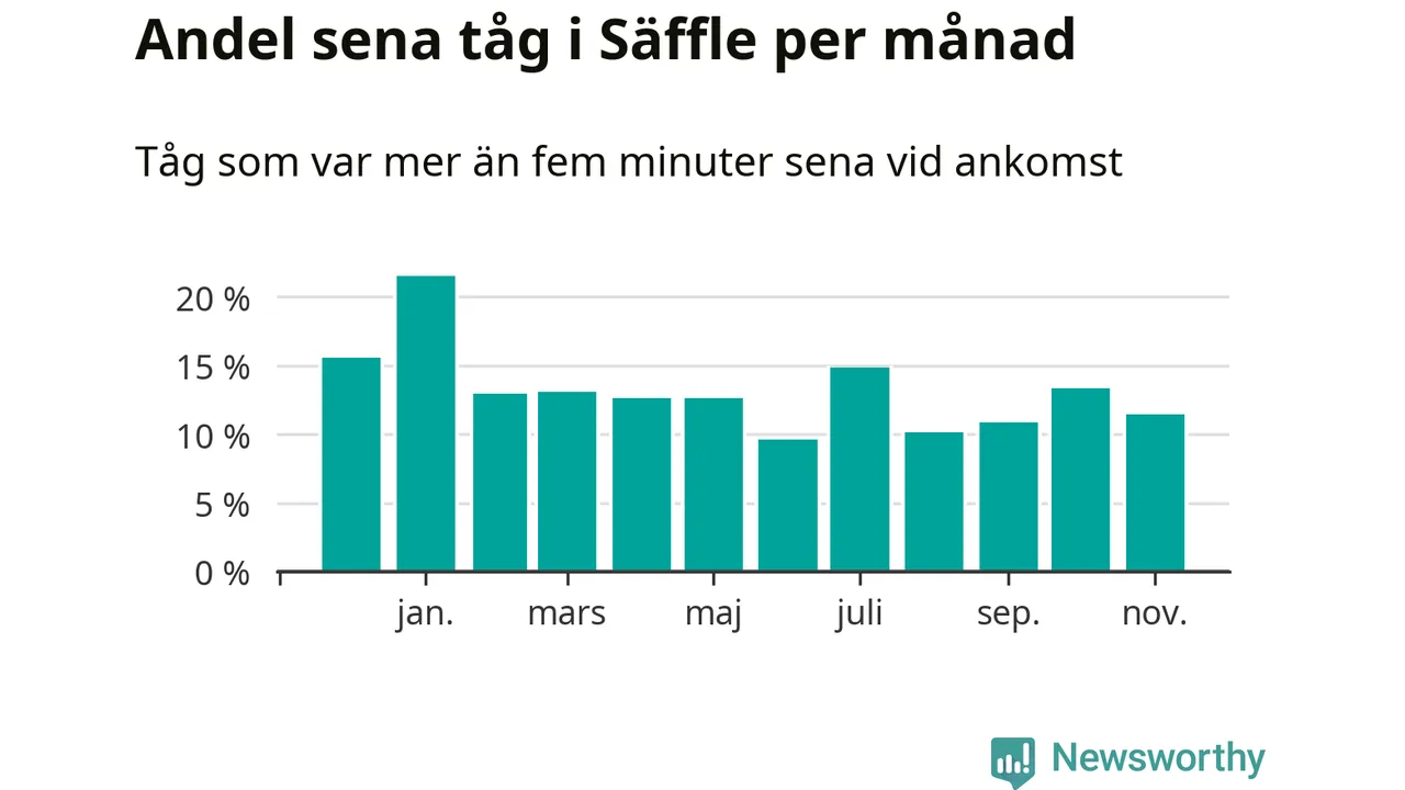 Det senaste halvåret har andelen sena tåg vid Säffle station varit lägre än halvåret innan dess. Newsworthy och Sveriges Natur har studerat tågens punktlighet det senaste året, på jakt efter järnvägens flaskhalsar.