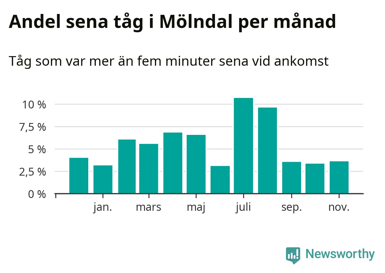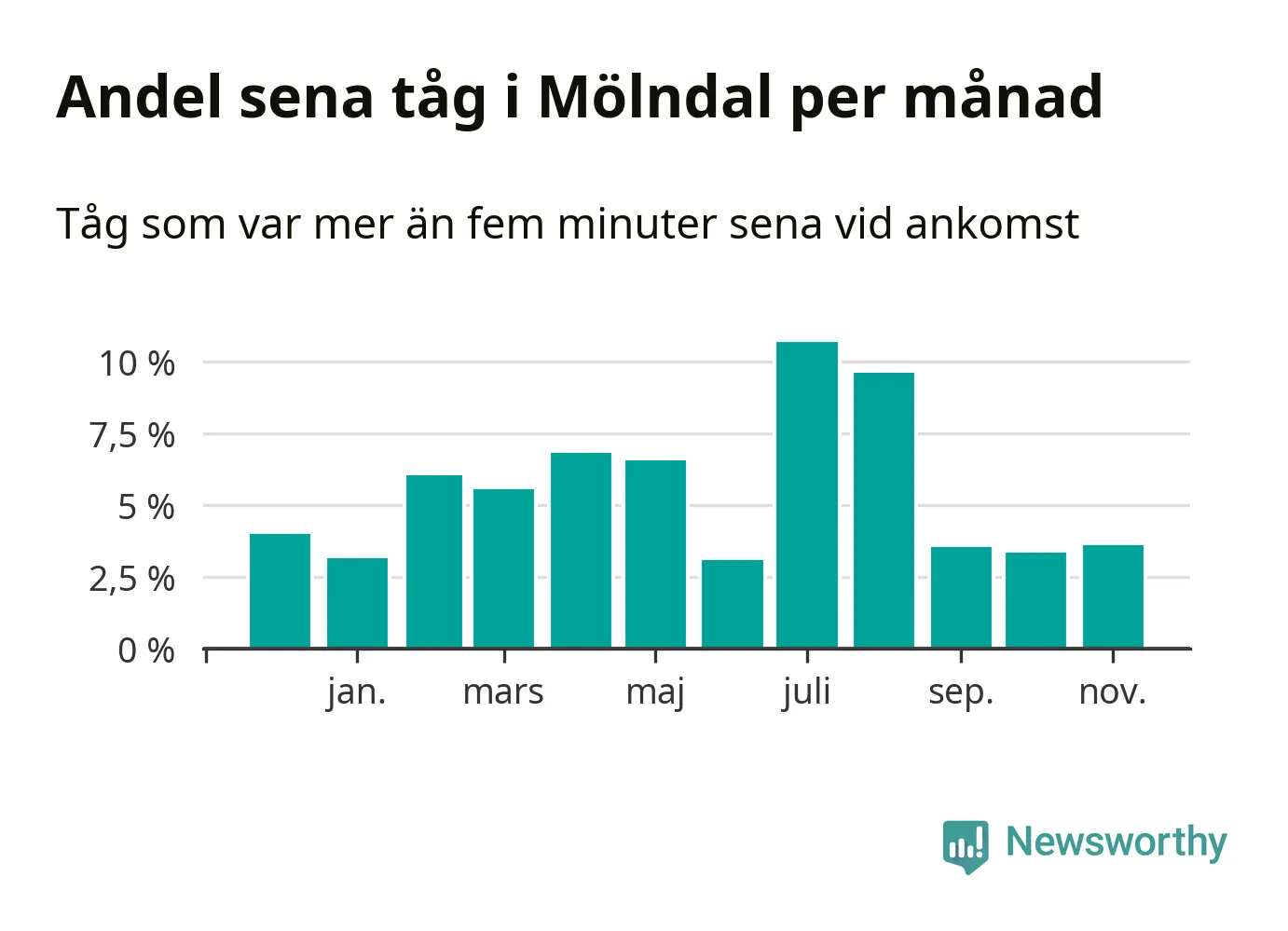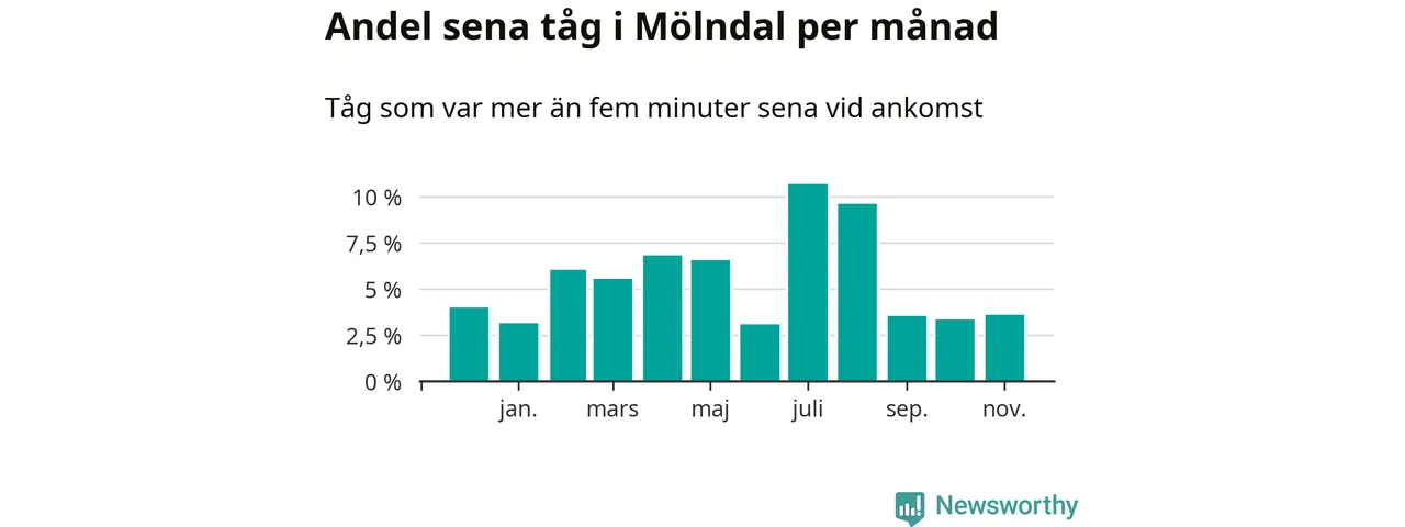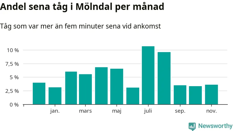 Den mest förseningsdrabbade månaden var juli, med i snitt elva procent sena tåg enligt det måttet.