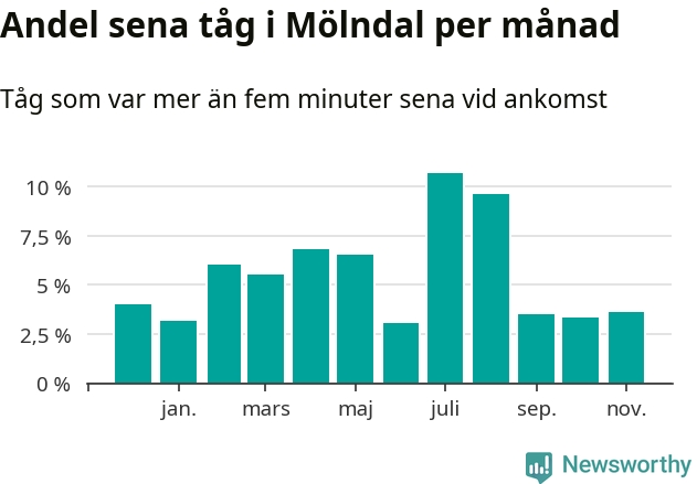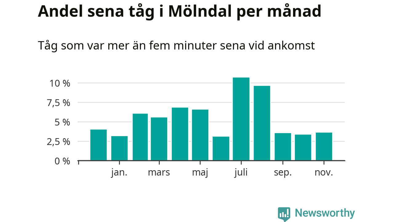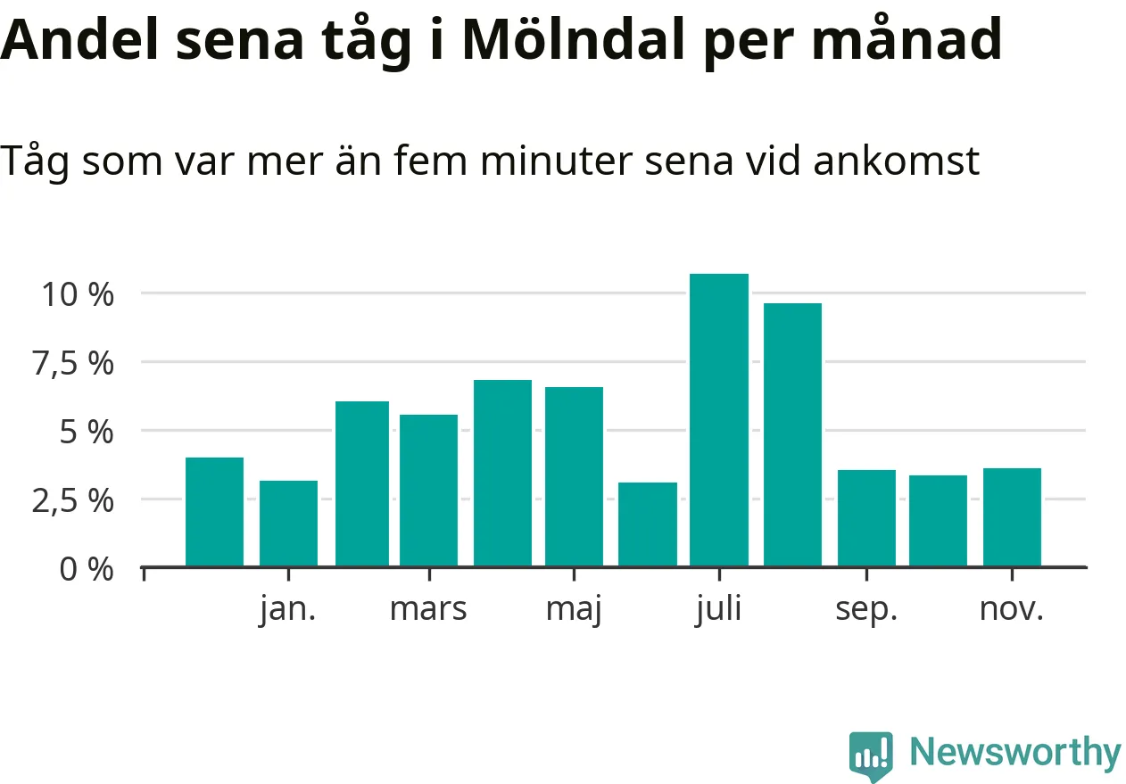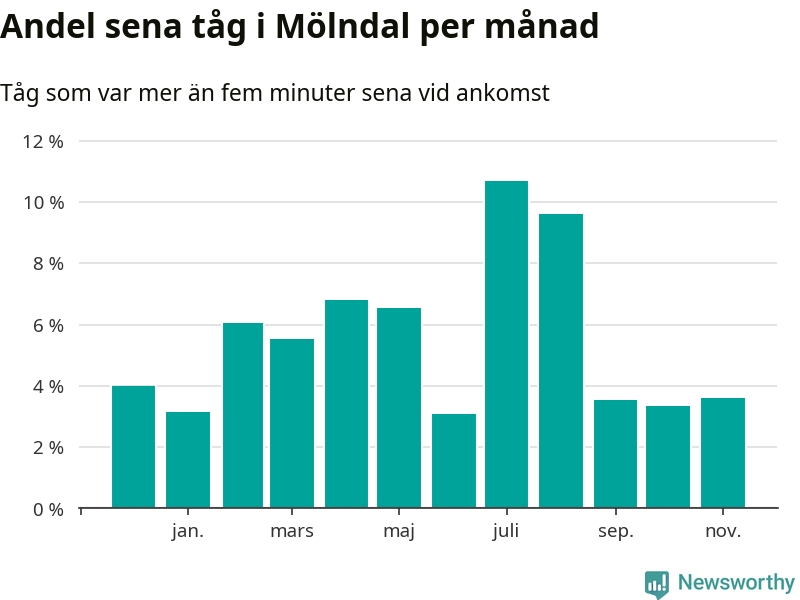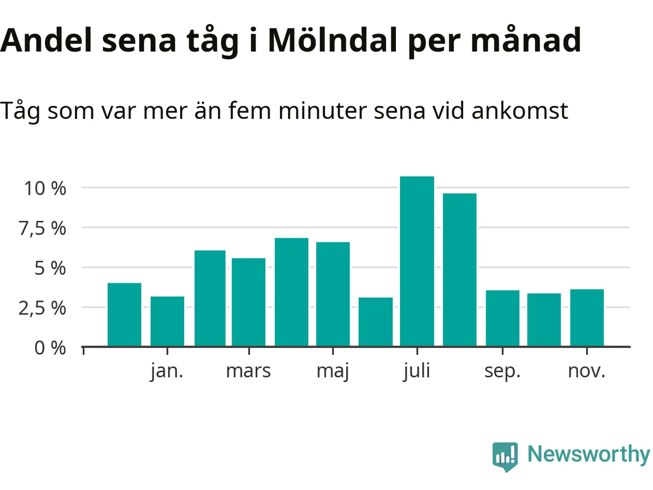 Den mest förseningsdrabbade månaden var juli, med i snitt elva procent sena tåg enligt det måttet.